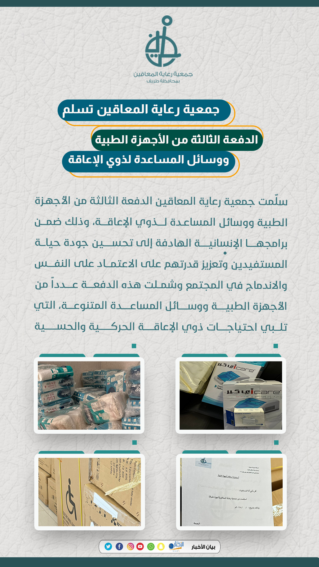 وأكدت الجمعية أن هذا الدعم يأتي استمراراً لجهودها في خدمة ذوي الإعاقة، وحرصها على توفير متطلبات الرعاية والتأهيل، مشيرة إلى أن تسليم هذه الدفعة يُعد جزءاً من خطة متكاملة تستهدف تقديم المزيد من المبادرات والمشاريع الإنسانية خلال الفترة المقبلة.