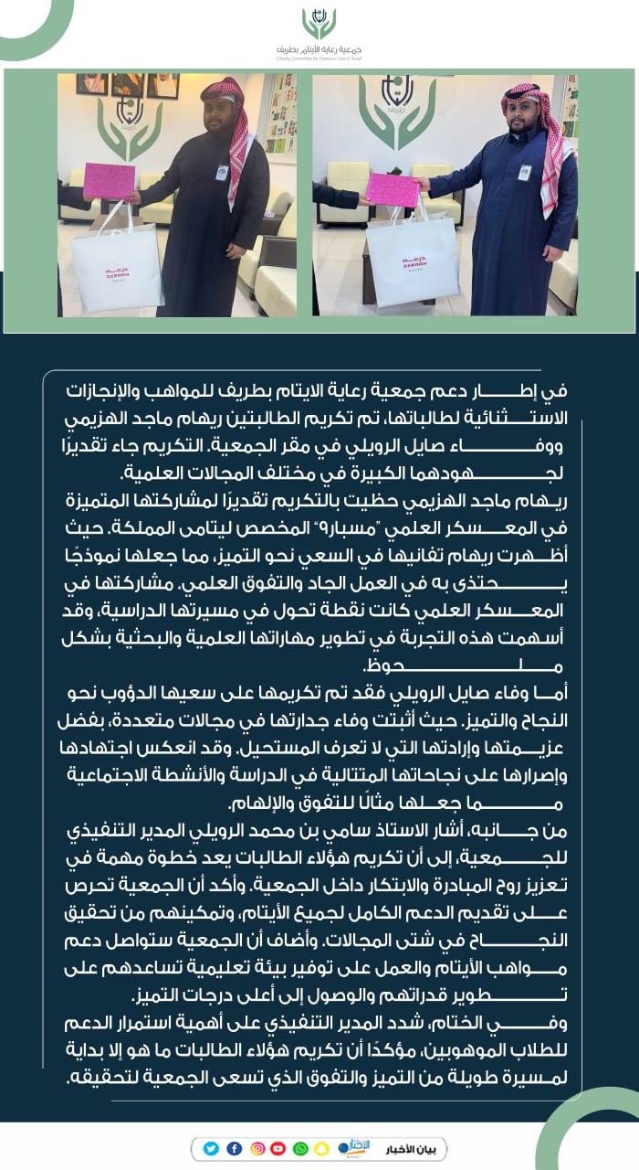 كرمت جمعية رعاية الأيتام بطريف الطالبتين ريهام ماجد الهزيمي ووفاء صايل الرويلي في مقر الجمعية، و ذلك في إطار دعم الجمعية للمواهب والإنجازات الاستثنائية لطالباتها، وتقديرًا لجهود الطالبتين الكبيرة في مختلف المجالات العلمية.