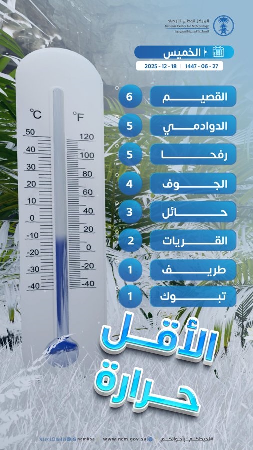• 17/12/2025 طريف تسجّل أقل درجة حرارة بالمملكة بـ1 مئوية اليوم