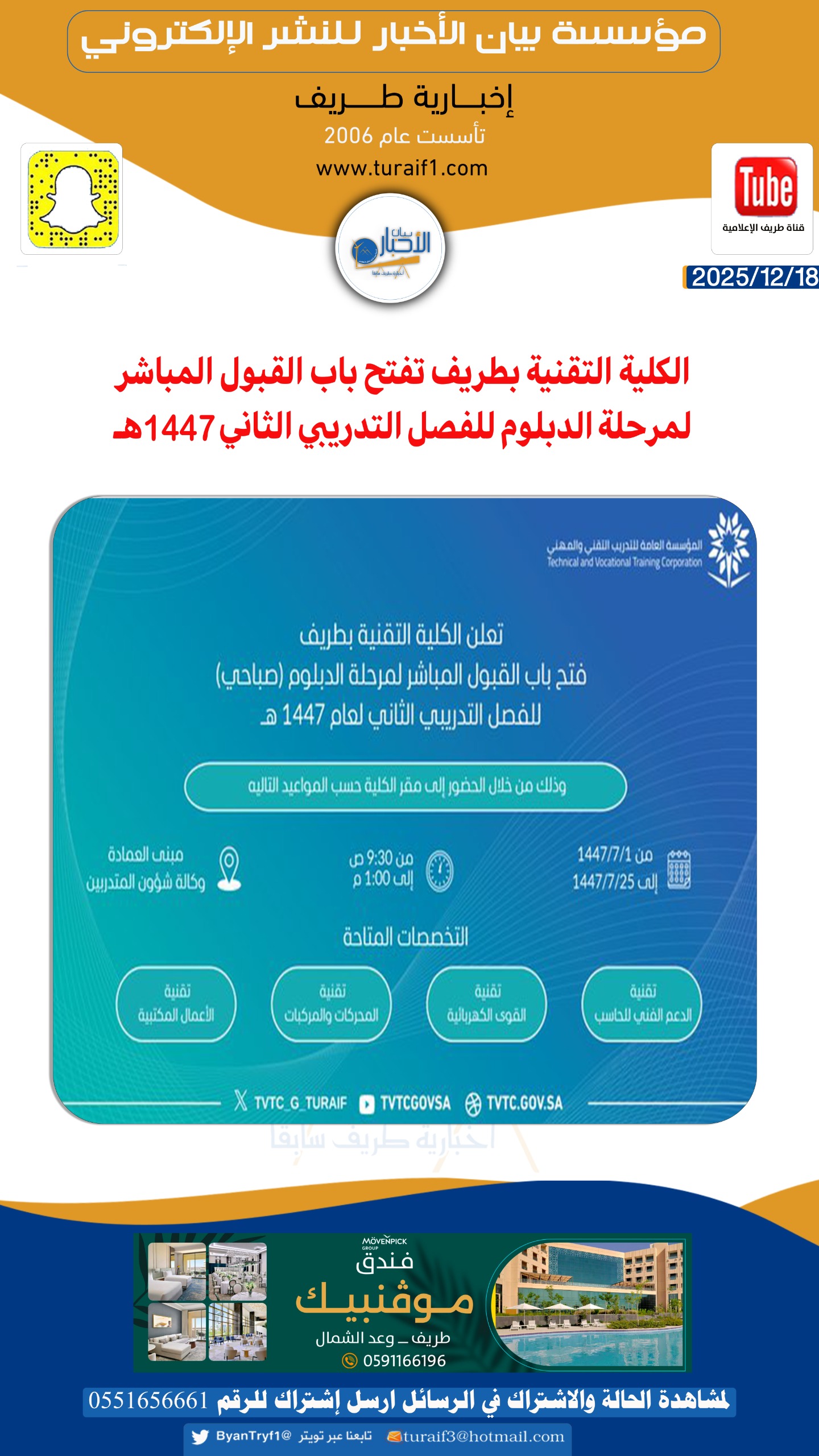 أعلنت الكلية التقنية بمحافظة طريف عن فتح باب القبول المباشر لمرحلة الدبلوم (صباحي) للفصل التدريبي الثاني للعام 1447هـ، وذلك من خلال الحضور إلى مقر الكلية وفق المواعيد المحددة.