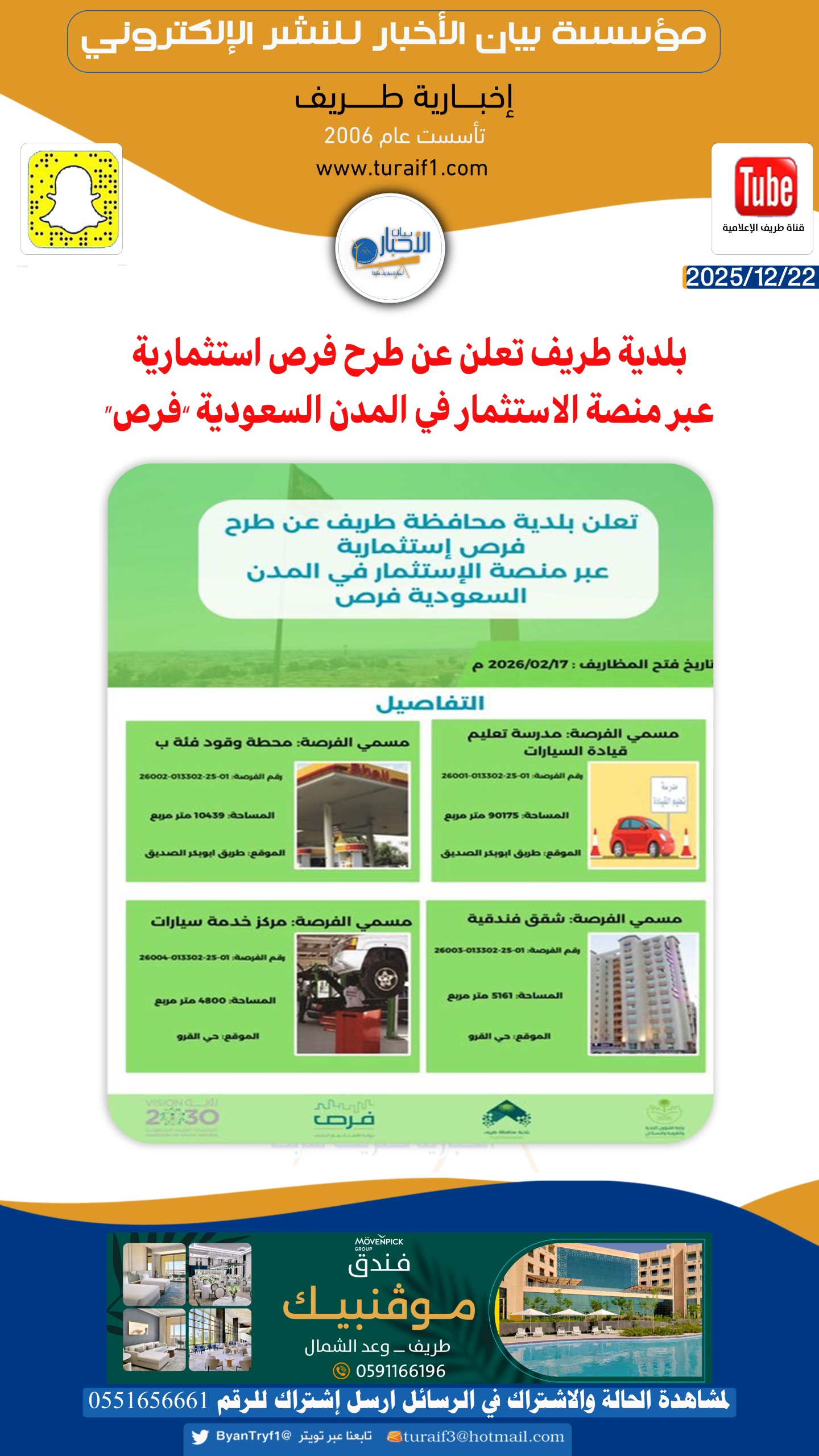 • 22/12/2025 بلدية طريف تعلن عن طرح فرص استثمارية عبر منصة الاستثمار في المدن السعودية “فرص”