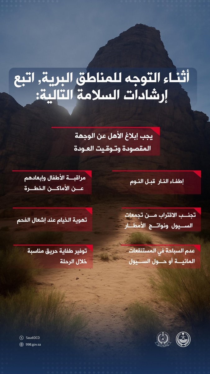 كذلك نصحت المديرية بتجنب الاقتراب من تجمعات السيول ونواتج الأمطار، وتهوية الخيام عند إشعال الفحم، وعدم السباحة في المستنقعات المائية أو حول السيول، وتوفير طفاية حريق مناسبة خلال الرحلة.