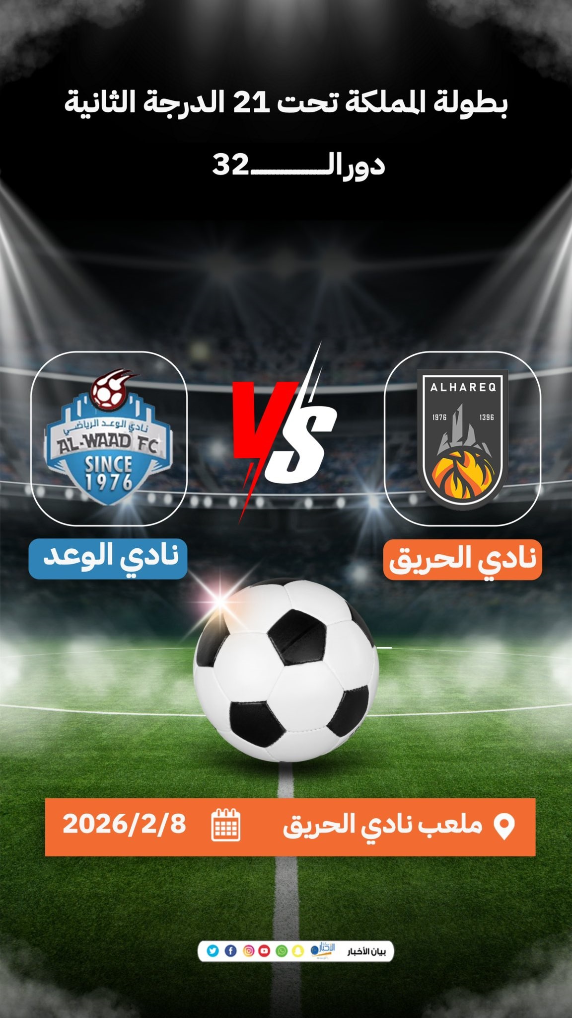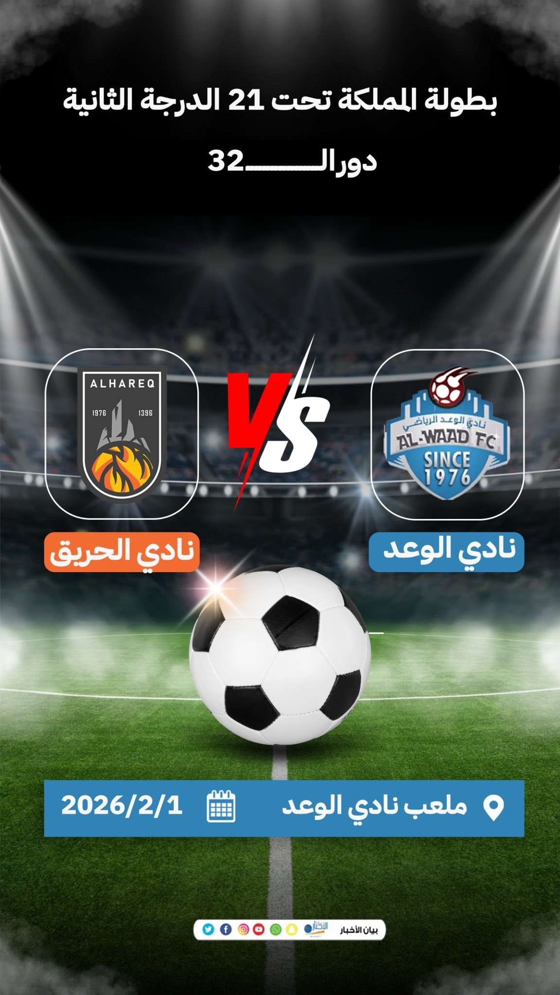 ومن المقرر أن تُقام مباراة الذهاب على ملعب نادي الوعد يوم 1 فبراير 2026م، فيما تُلعب مباراة الإياب على ملعب نادي الحريق يوم 8 فبراير 2026م، وسط تطلعات كبيرة من الجهازين الفني والإداري لتحقيق نتيجة إيجابية والتأهل إلى الدور التالي من البطولة.