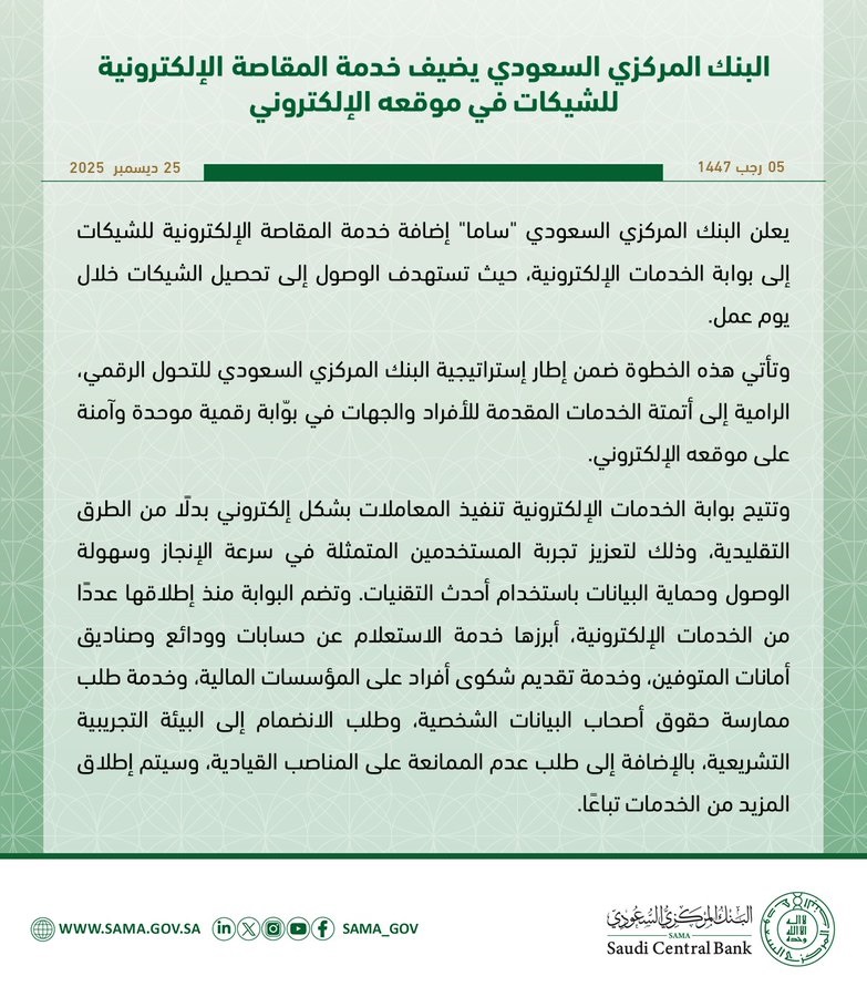أضاف البنك المركزي السعودي “ساما” خدمة المقاصة الإلكترونية للشيكات إلى بوابة الخدمات الإلكترونية، إذ تستهدف الوصول إلى تحصيل الشيكات خلال يوم عمل.