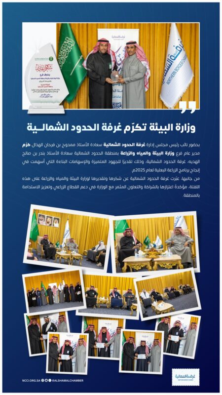 من جانبها، أعربت غرفة الحدود الشمالية عن اعتزازها بهذا التكريم، مؤكدةً حرصها على مواصلة الشراكة والتعاون المستمر مع وزارة البيئة والمياه والزراعة بما يسهم في تنمية القطاع الزراعي وتحقيق مستهدفات التنمية المستدامة بالمنطقة.