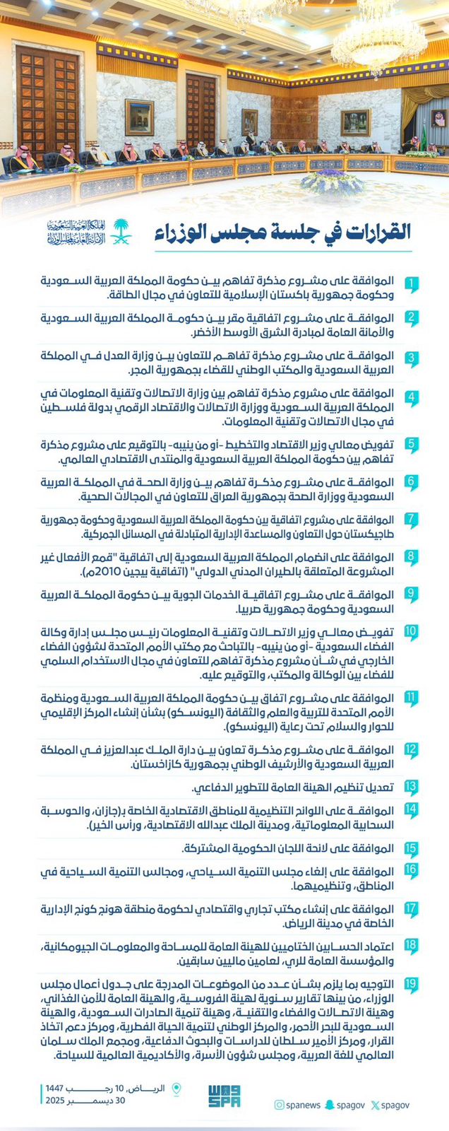 التوجيه بما يلزم بشأن عدد من الموضوعات المدرجة على جدول أعمال مجلس الوزراء، من بينها تقارير سنوية لهيئة الفروسية، والهيئة العامة للأمن الغذائي، وهيئة الاتصالات والفضاء والتقنية، وهيئة تنمية الصادرات السعودية، والهيئة السعودية للبحر الأحمر، والمركز الوطني لتنمية الحياة الفطرية، ومركز دعم اتخاذ القرار، ومركز الأمير سلطان للدراسات والبحوث الدفاعية، ومجمع الملك سلمان العالمي للغة العربية، ومجلس شؤون الأسرة، والأكاديمية العالمية للسياحة.