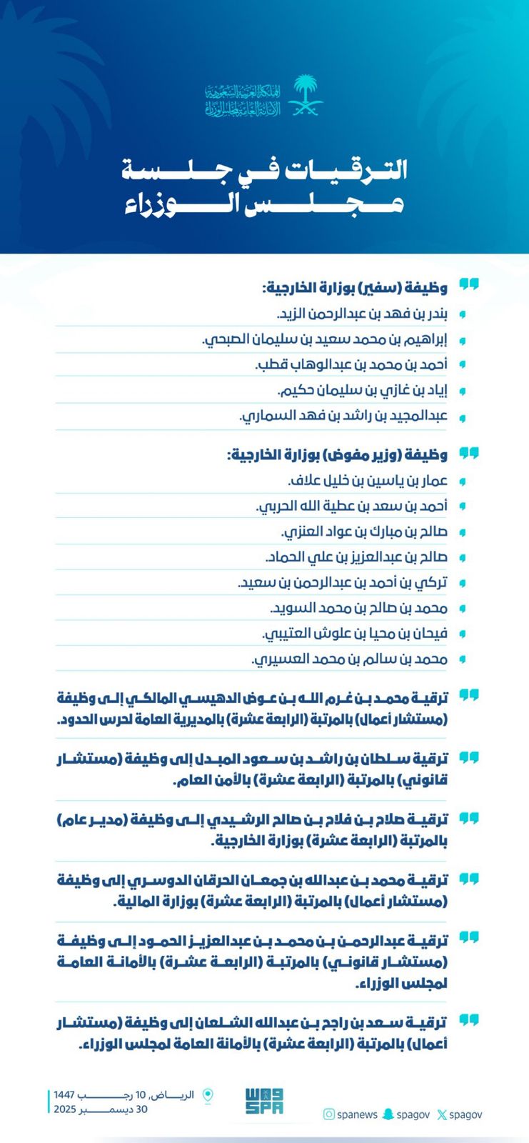 – ترقية سعد بن راجح بن عبدالله الشلعان إلى وظيفة (مستشار أعمال) بالمرتبة (الرابعة عشرة) بالأمانة العامة لمجلس الوزراء.