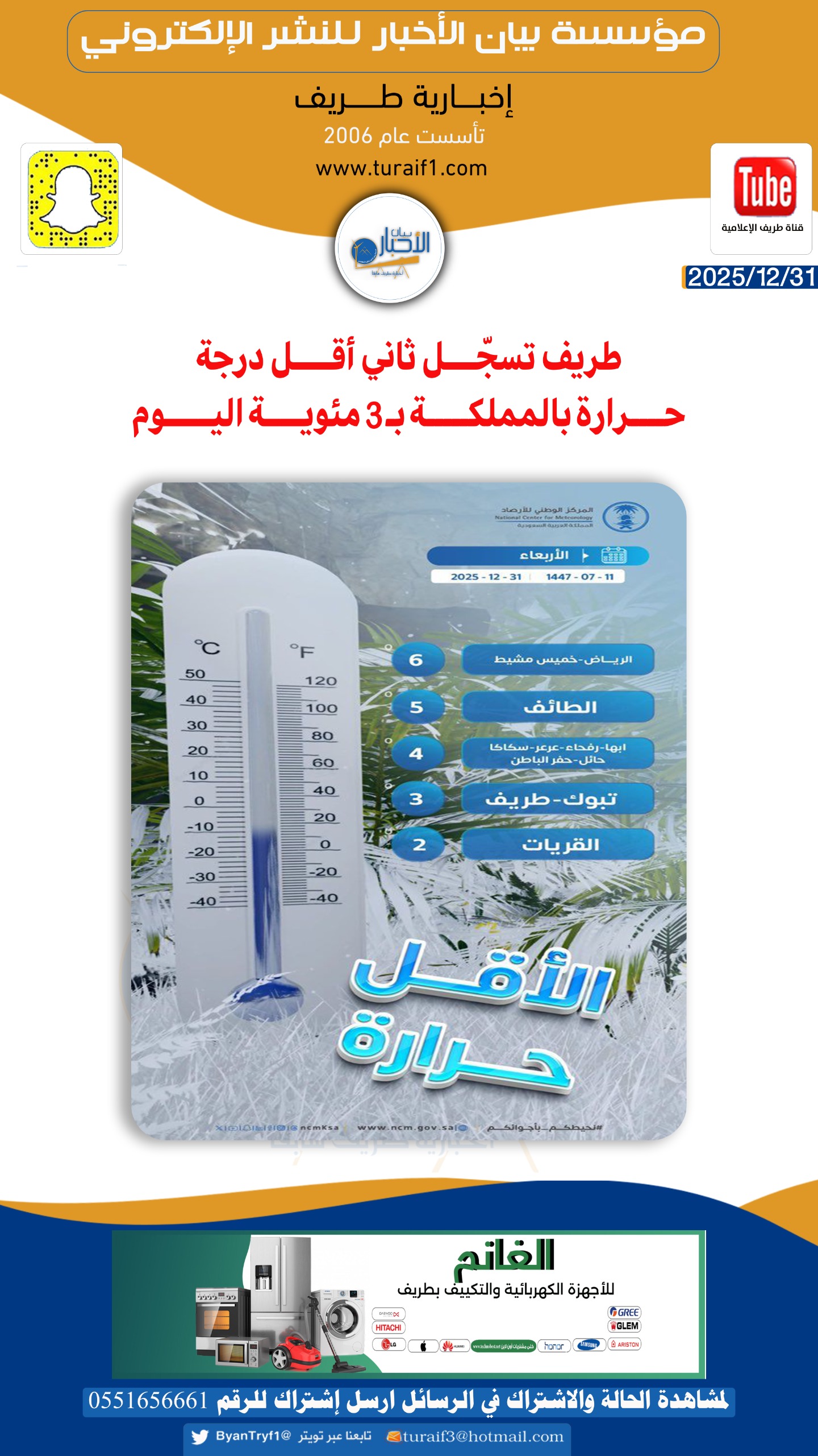• 31/12/2025 طريف تسجّل ثاني أقل درجة حرارة بالمملكة بـ3 مئوية اليوم