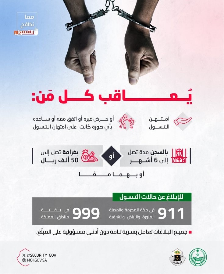 ودعا الأمن العام للإبلاغ عن حالات التسول من خلال الاتصال على 911 في مكة المكرمة والمدينة المنورة والرياض والشرقية و999 في بقية مناطق المملكة.