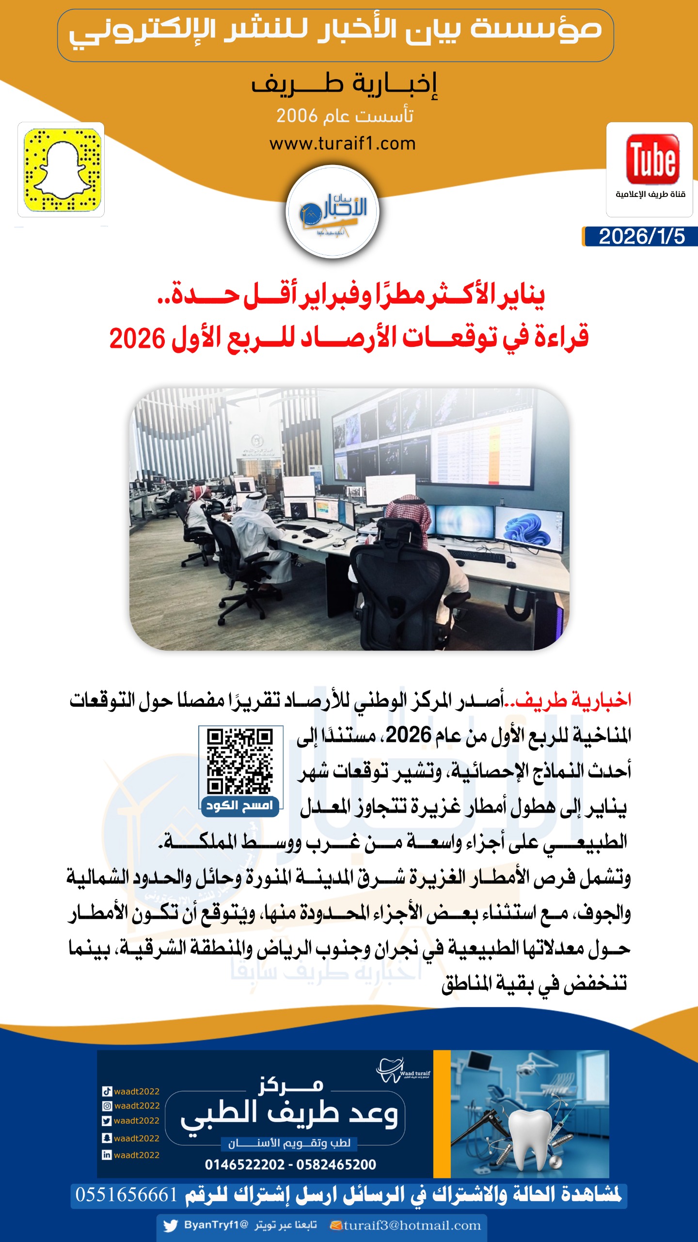وللتفاصيل ⬇️https://t.co/m0lDQ3ATUv#نحيطكم_بأجوائكم pic.twitter.com/szwoiCELJK— المركز الوطني للأرصاد (NCM) (@NCMKSA) January 5, 2026