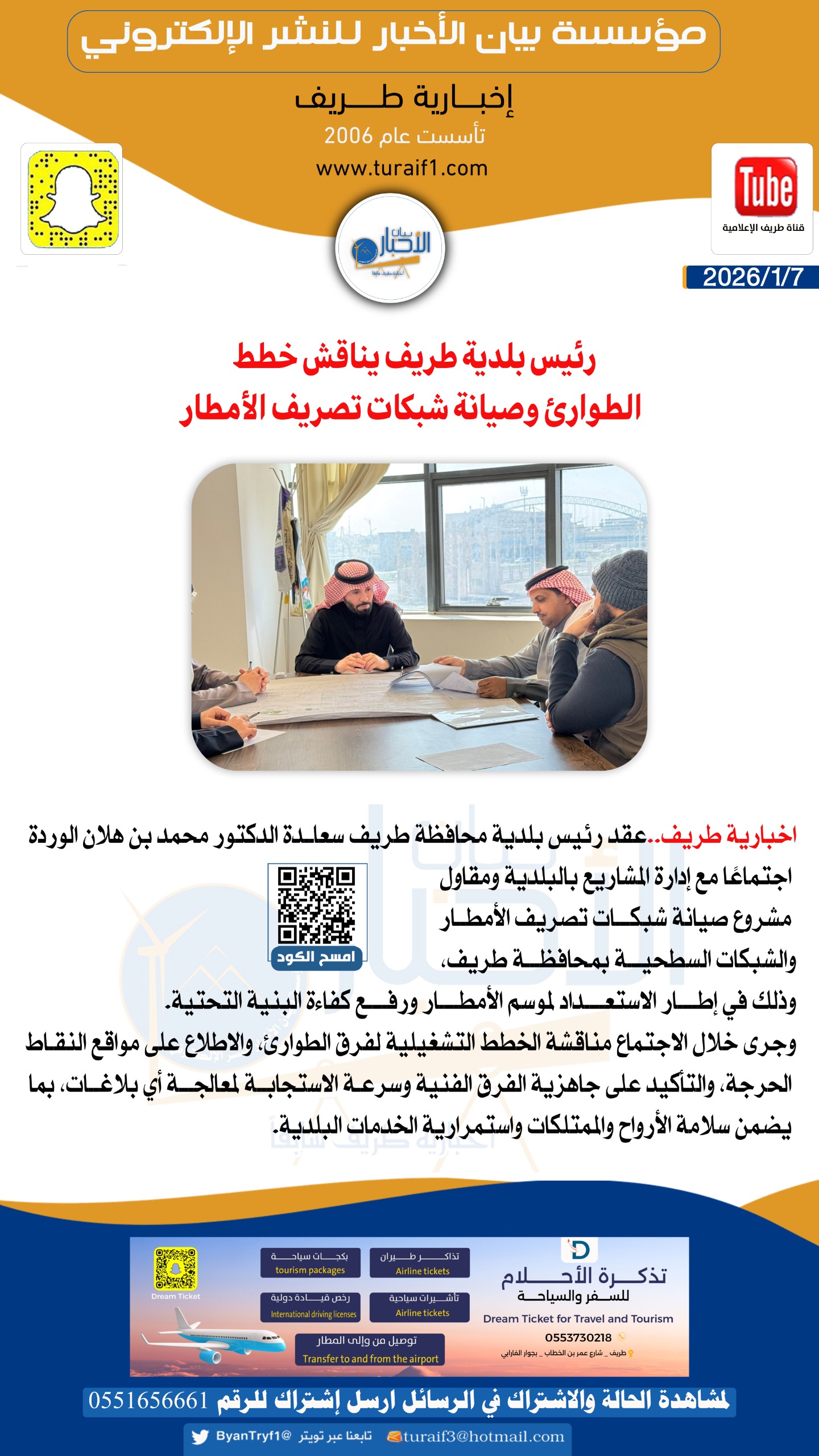 عقد رئيس بلدية محافظة طريف سعادة الدكتور محمد بن هلان الوردة اجتماعًا مع إدارة المشاريع بالبلدية ومقاول مشروع صيانة شبكات تصريف الأمطار والشبكات السطحية بمحافظة طريف، وذلك في إطار الاستعداد لموسم الأمطار ورفع كفاءة البنية التحتية.