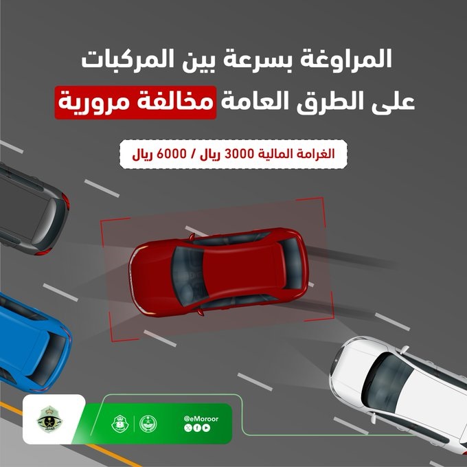 وبيّنت الإدارة، عبر إنفوجرافيك توعوي، أن “المراوغة بسرعة بين المركبات على الطرق العامة” مخالفة تستوجب العقوبة، حيث تتراوح الغرامة المالية المقررة لها بين 3000 ريال و6000 ريال.