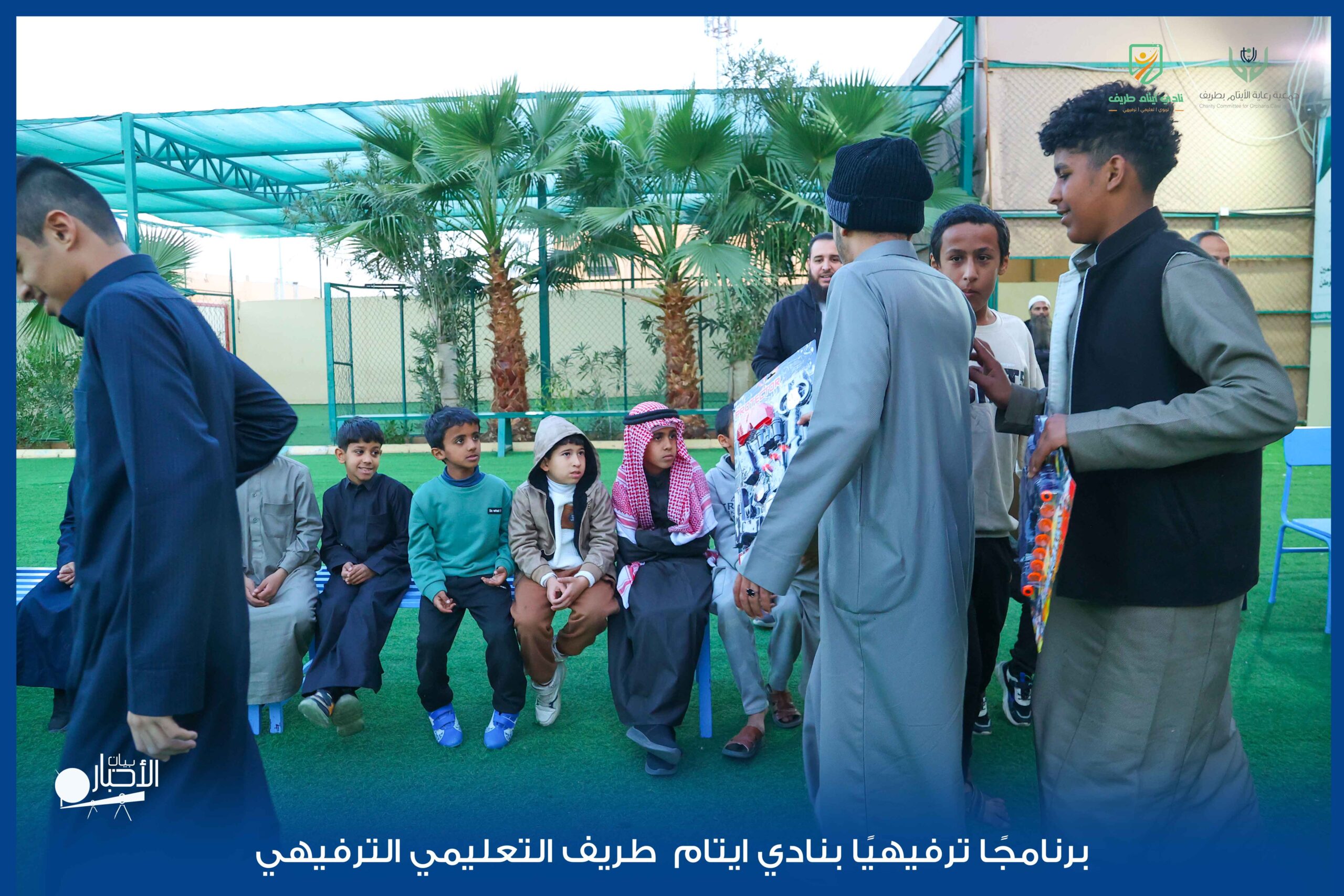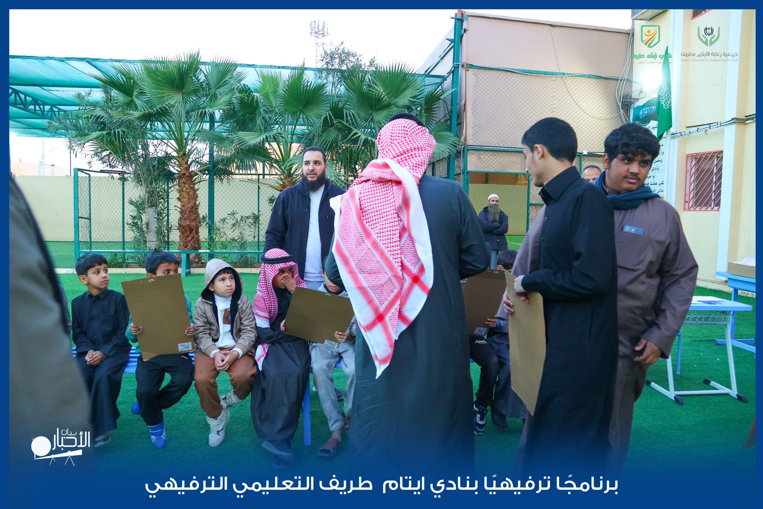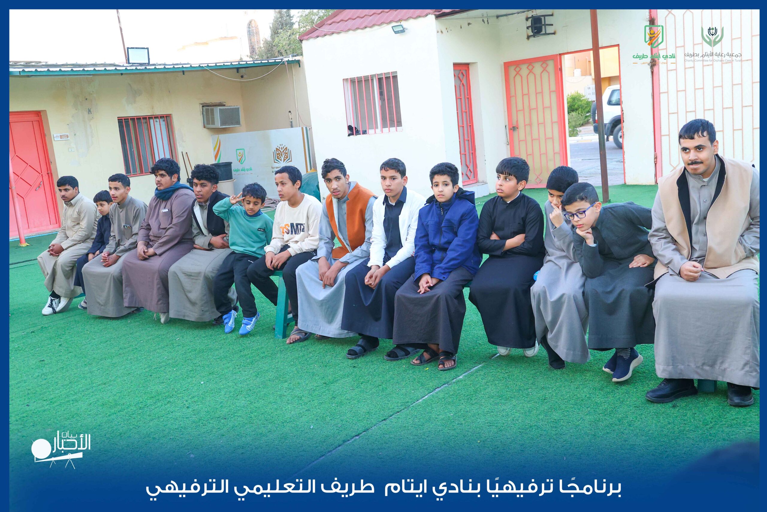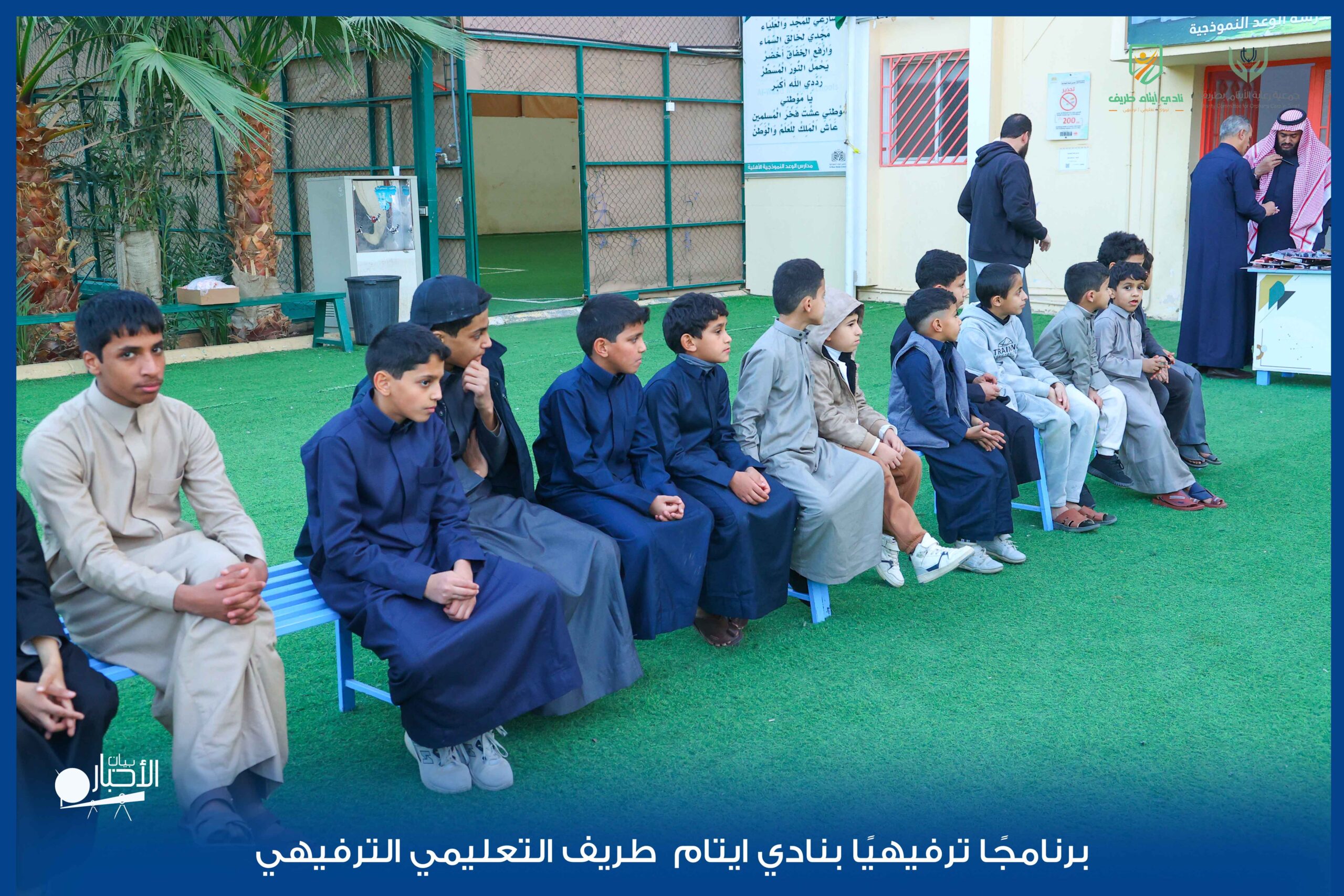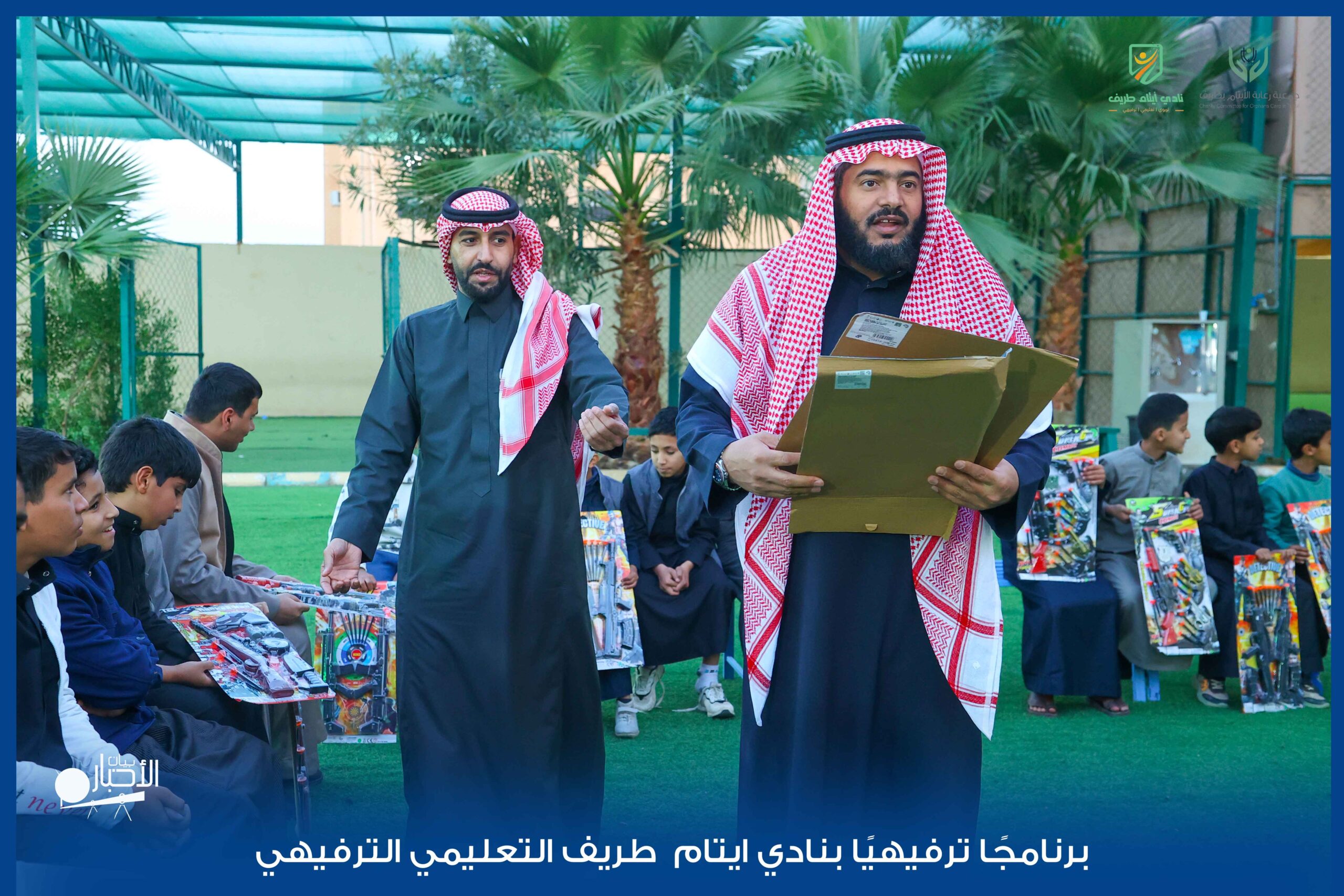 أقام نادي أيتام طريف التعليمي الترفيهي برنامجًا ترفيهيًا لطلاب النادي وذلك ختامًا للفصل الدراسي الأول للعام 1447هـ حيث أقيمت فعاليات للطلاب ومباريات لكرة القدم، ثم خُتم البرنامج بتسليم الطلاب مكافآت نظير جهودهم المبذولة طيلة الفصل الدراسي ٠