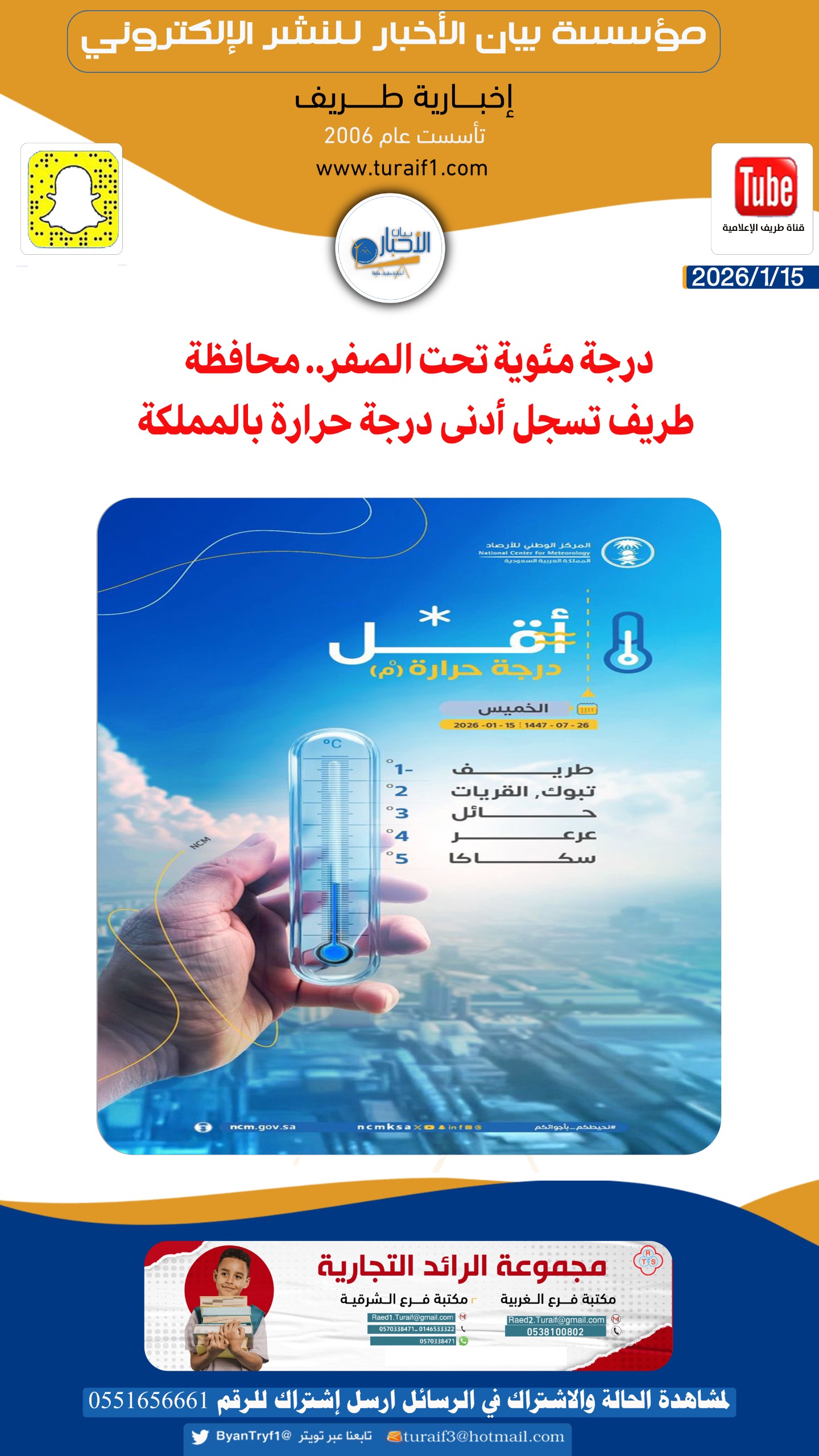 من جانبه، نبّه المركز الوطني للأرصاد من موجة باردة على محافظة طريف بمنطقة الحدود الشمالية، تشمل انخفاضًا في درجات الحرارة من صفر إلى 3 درجات مئوية تحت الصفر، مع تكوّن الصقيع.
