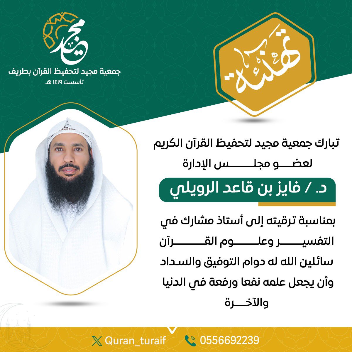 قدّمت جمعية مجيد لتحفيظ القرآن الكريم بمحافظة طريف خالص التهاني والتبريكات لعضو مجلس إدارتها الدكتور فايز بن قاعد الرويلي، وذلك بمناسبة ترقيته إلى أستاذ مشارك في التفسير وعلوم القرآن.