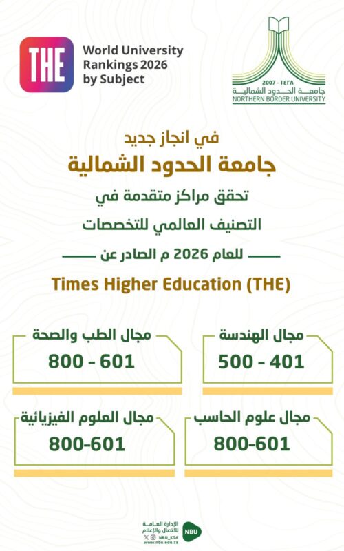 حققت جامعة الحدود الشمالية إنجازًا جديدًا بتقدمها في التصنيف العالمي للتخصصات لعام 2026م الصادر عن مؤسسة Times Higher Education (THE)، حيث سجلت حضورًا مميزًا في عدد من المجالات الأكاديمية.