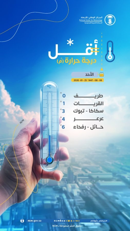 وكان المركز حذر سابقًا، من موجة باردة تؤثر على منطقة الحدود الشمالية، داعيًا إلى اتخاذ الاحتياطات اللازمة لمواجهة الأجواء الباردة.