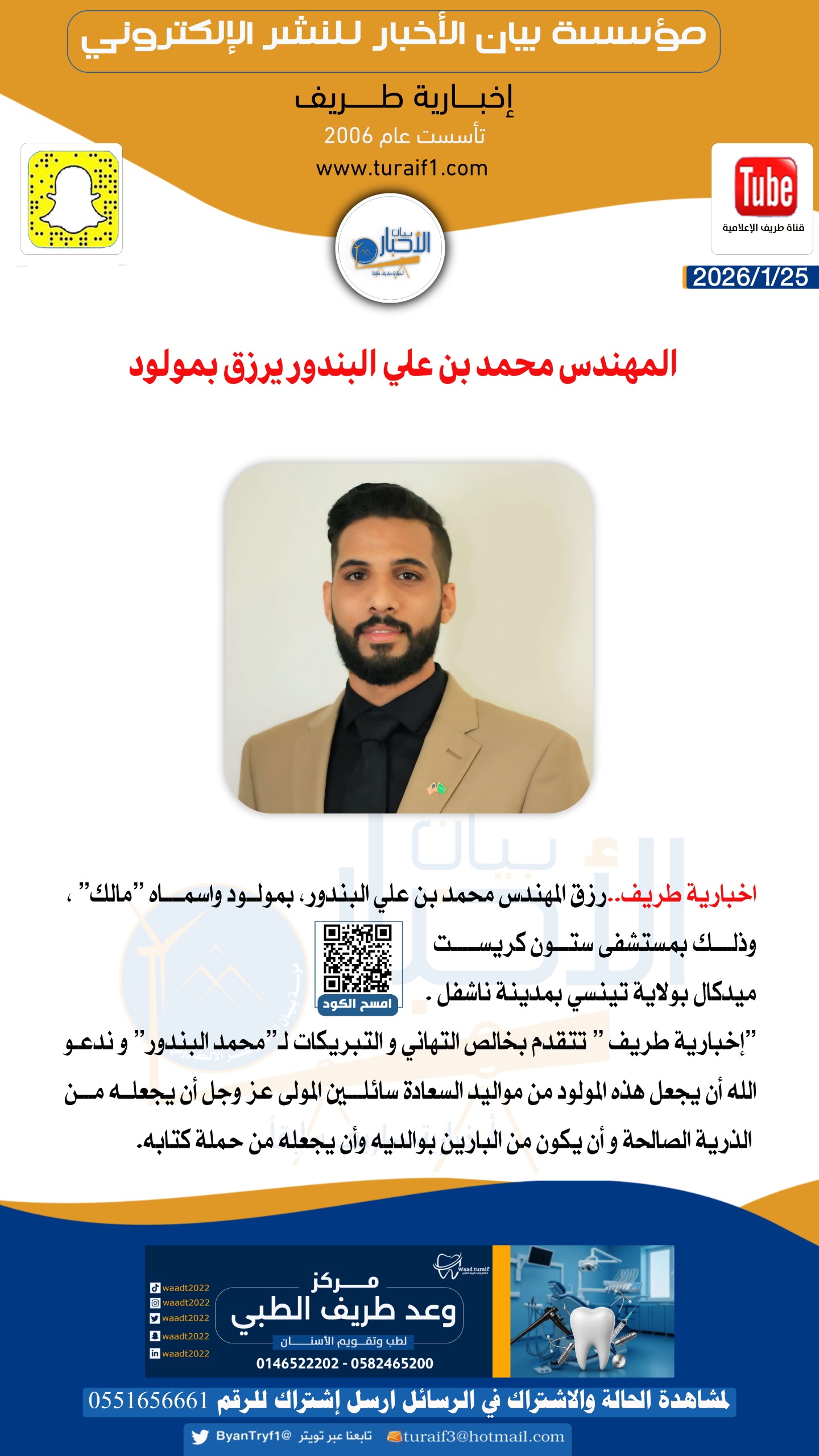 ”إخبارية طريف ” تتقدم بخالص التهاني و التبريكات لـ”محمد البندور” و ندعو الله أن يجعل هذه المولود من مواليد السعادة سائلين المولى عز وجل أن يجعله من الذرية الصالحة و أن يكون من البارين بوالديه وأن يجعله من حملة كتابه.