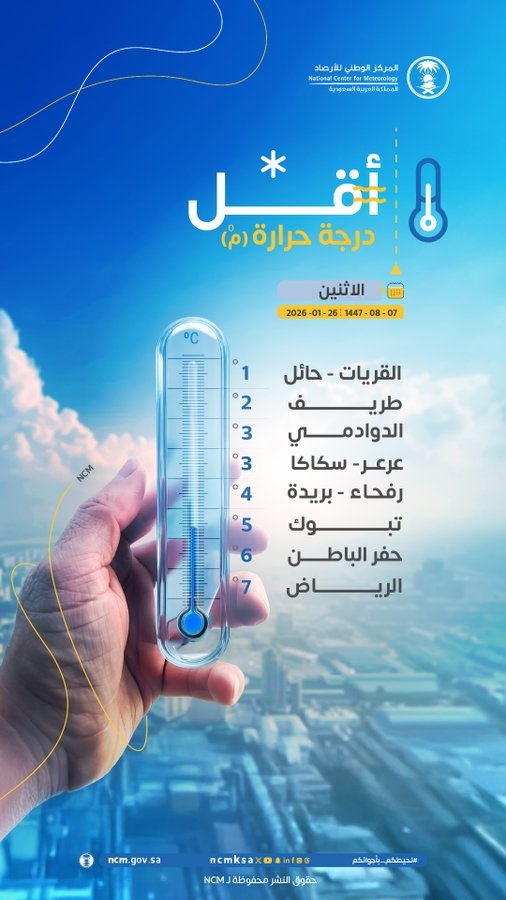 أعلن المركز الوطني للأرصاد، اليوم الاثنين 26 يناير 2026م ، عن درجات الحرارة المتوقعة على مختلف مناطق المملكة العربية السعودية، وسجلت محافظة طريف ثاني أقل درجة حرارة بالمملكة بواقع 2 درجة مئوية، فيمات سجّلت القريات وحائل أدنى درجة حرارة بواقع 1 درجة مئوية.