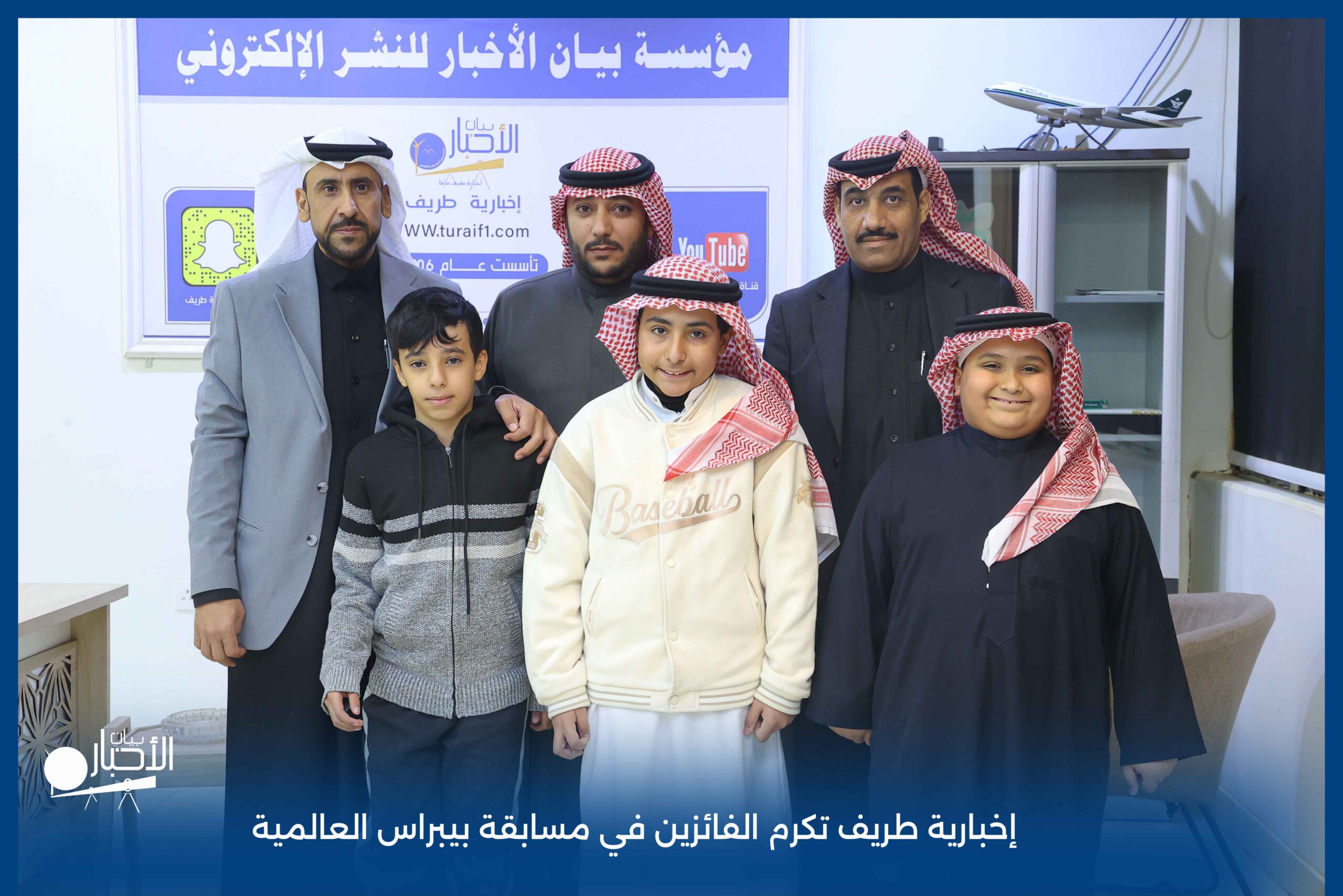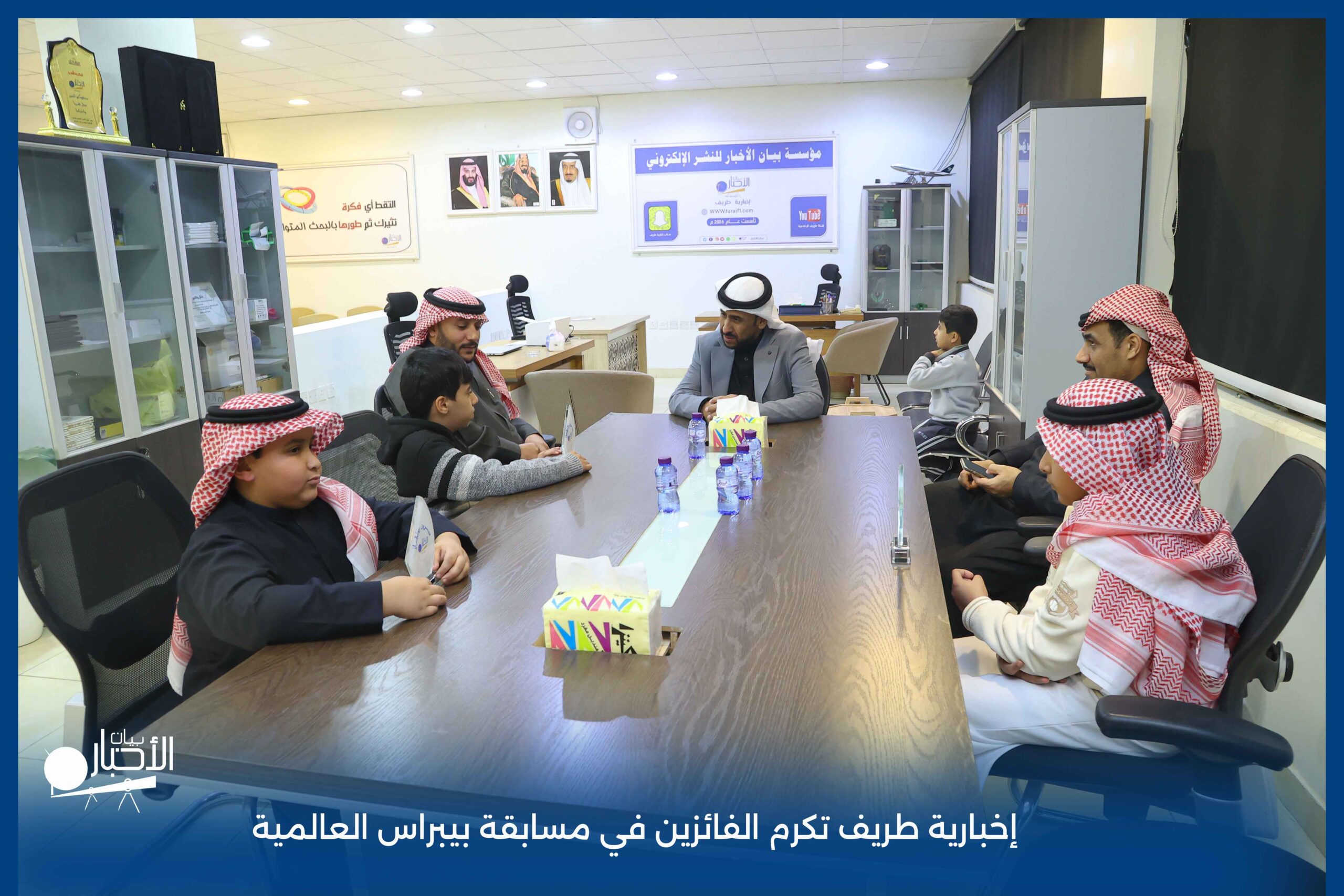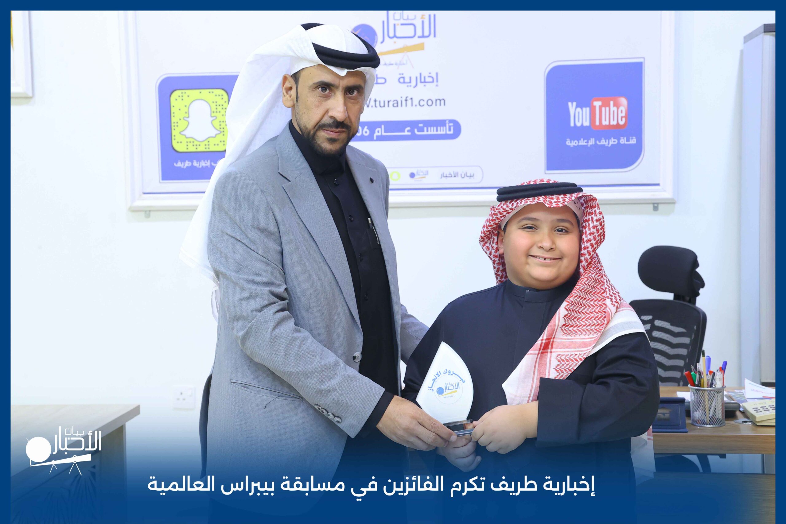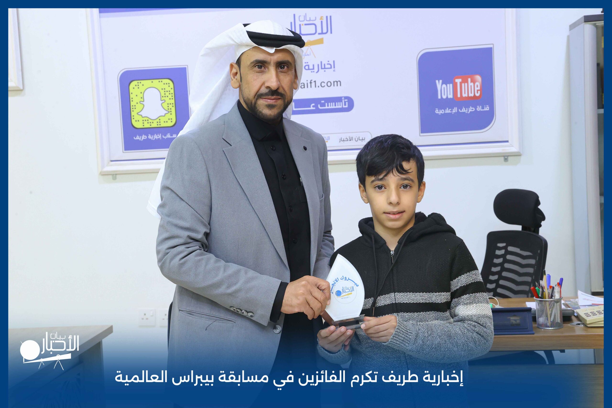 كرّمت إدارة مؤسسة بيان الأخبار للنشر الإلكتروني (إخبارية طريف سابقًا) الفائزين من طلاب محافظة طريف، الحاصلين على الجوائز والمراكز المتقدمة في مسابقة “بيبراس” موهبة للمعلوماتية 2024م، وذلك بحضور المدير العام لمؤسسة بيان الأخبار للنشر الإلكتروني الأستاذ فهد الدغماني، والأستاذ محمد الموزن.