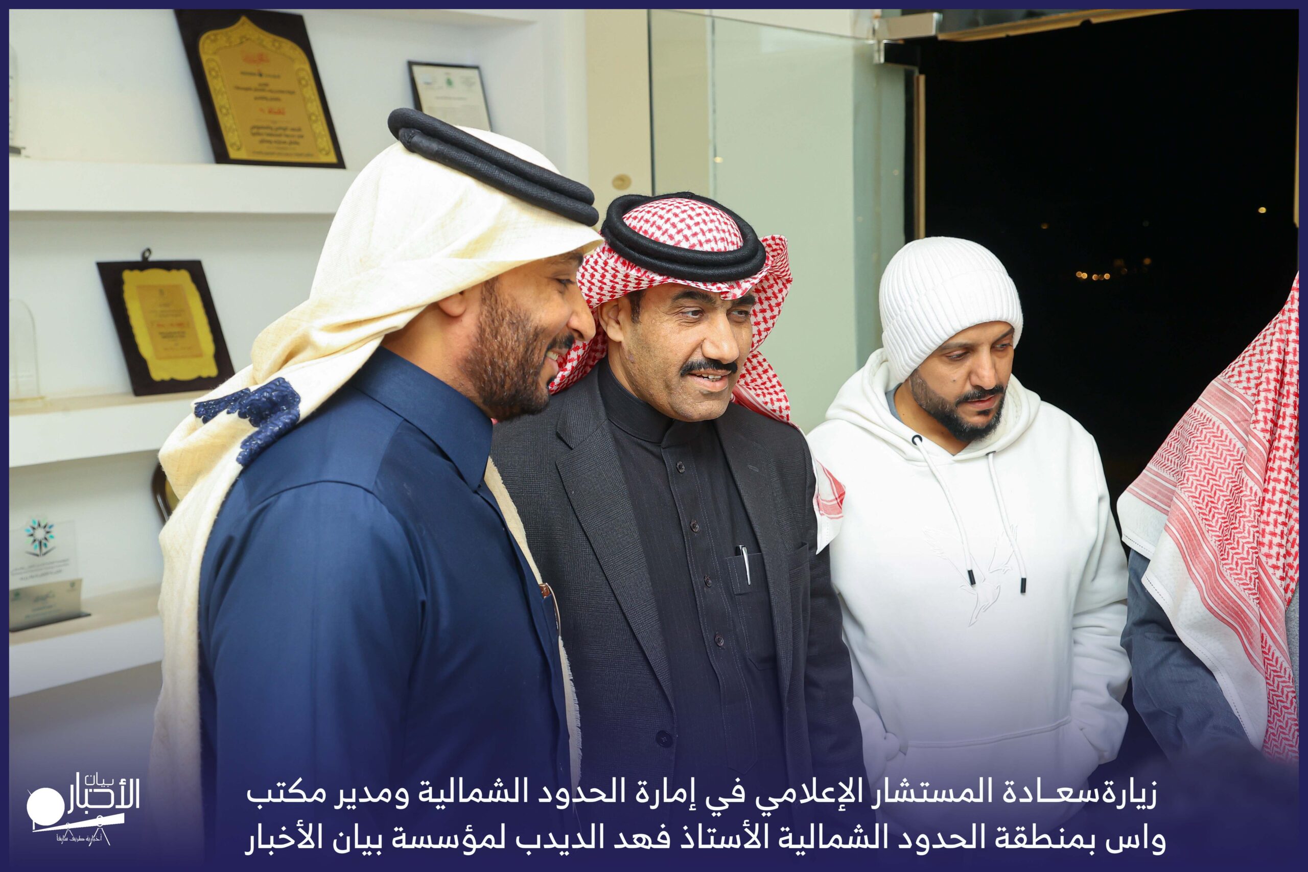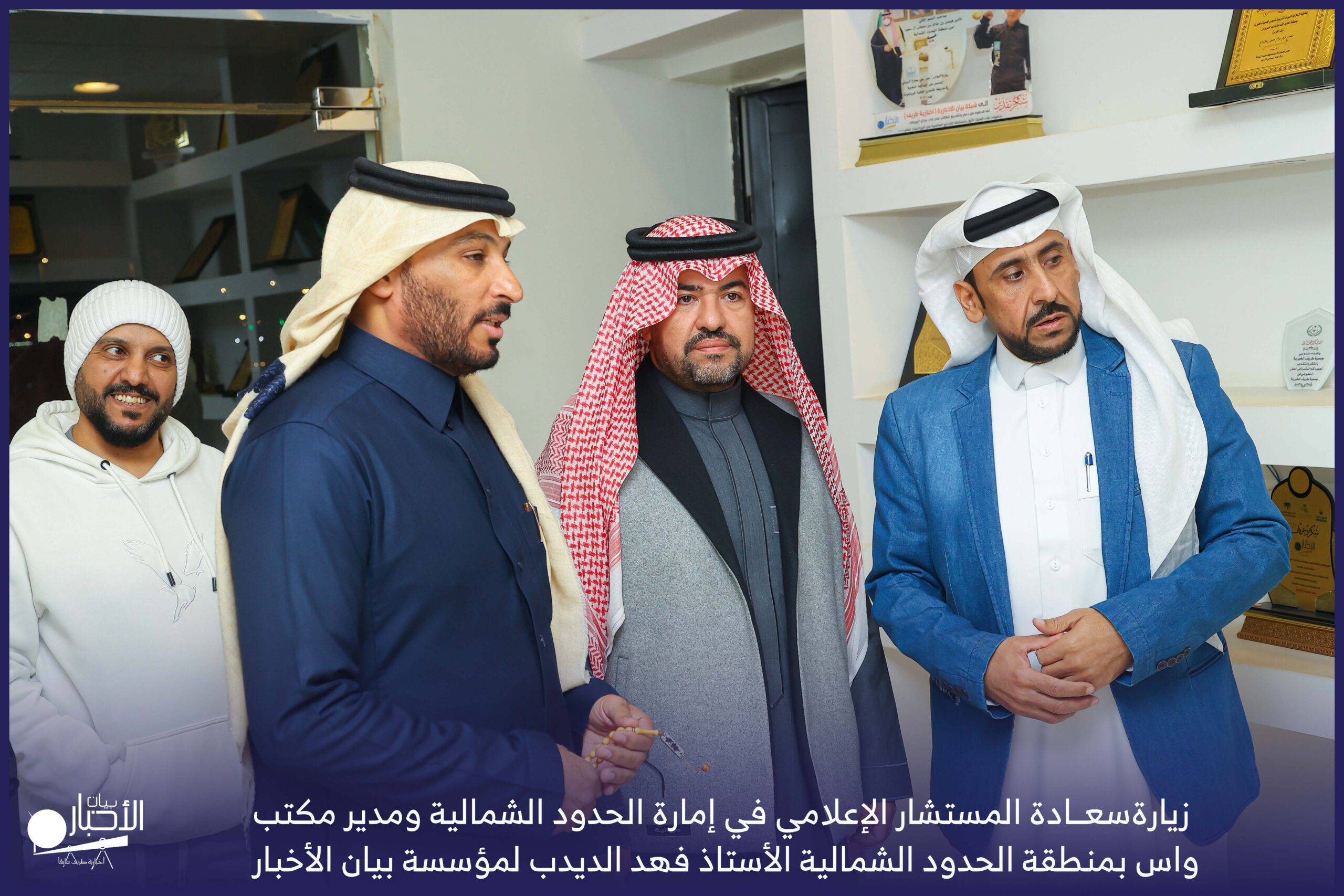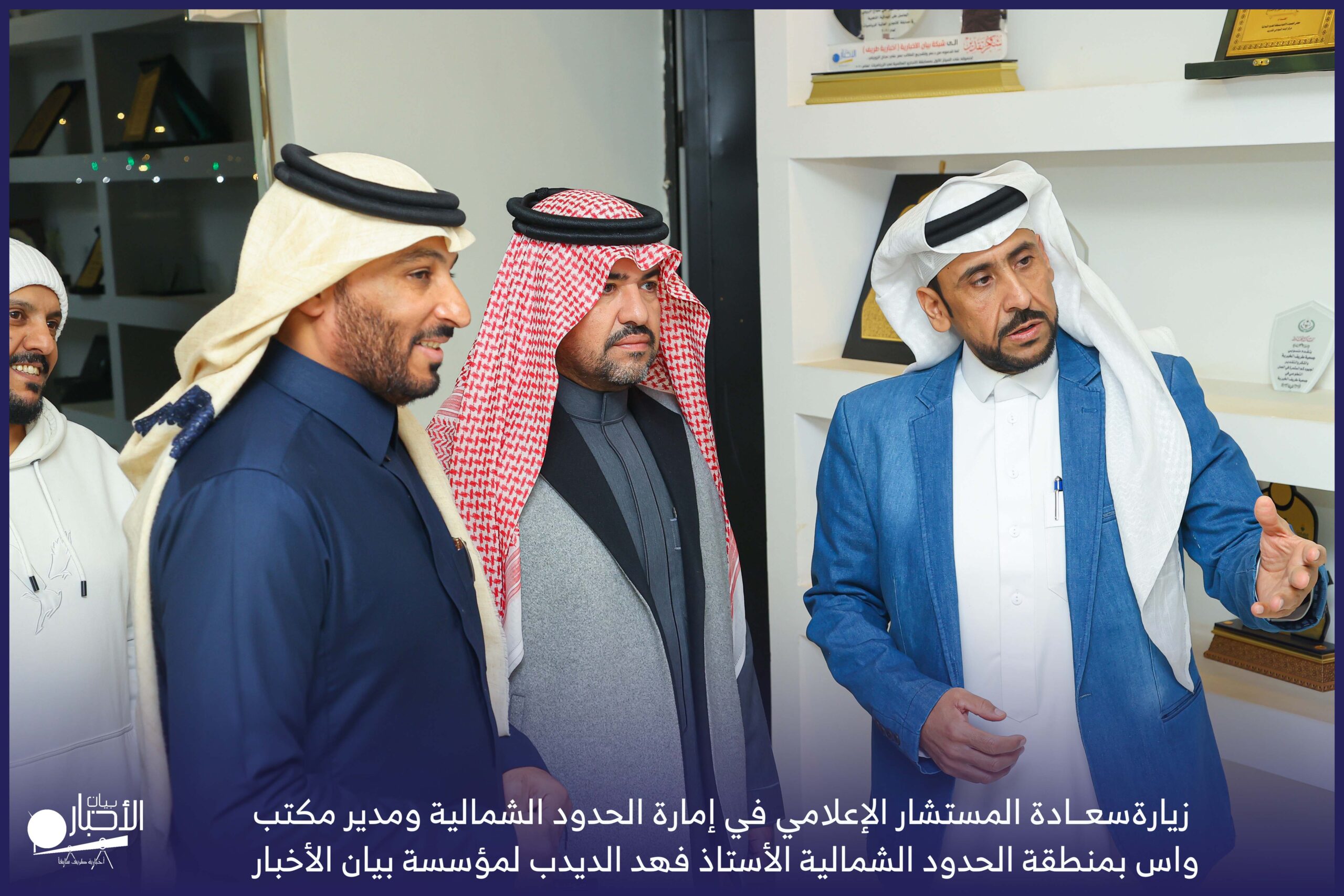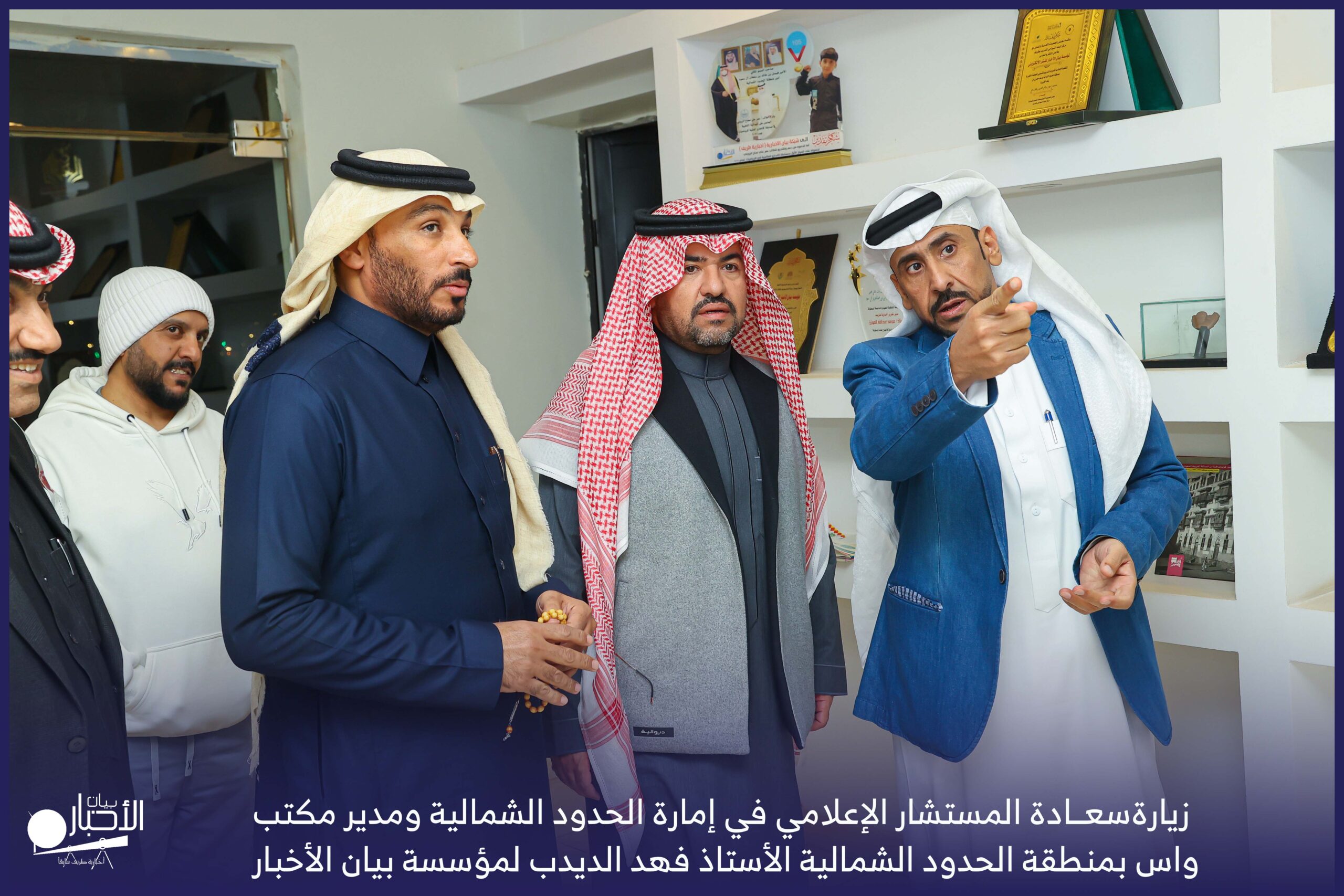 زار سعادة المستشار الإعلامي في إمارة الحدود الشمالية ومدير مكتب واس بمنطقة الحدود الشمالية الأستاذ فهد الديدب، مؤسسة بيان الأخبار (إخبارية طريف سابقا) ، يرافقه مراسل قناة الإخبارية بمحافظة رفحاء الأستاذ عبدالله عايش العنزي ، وكان في استقباله إدارة الموقع ممثلة بالأستاذ فهد الدغماني، والأستاذ محمد الموزن، والأستاذ منصور المتعب.