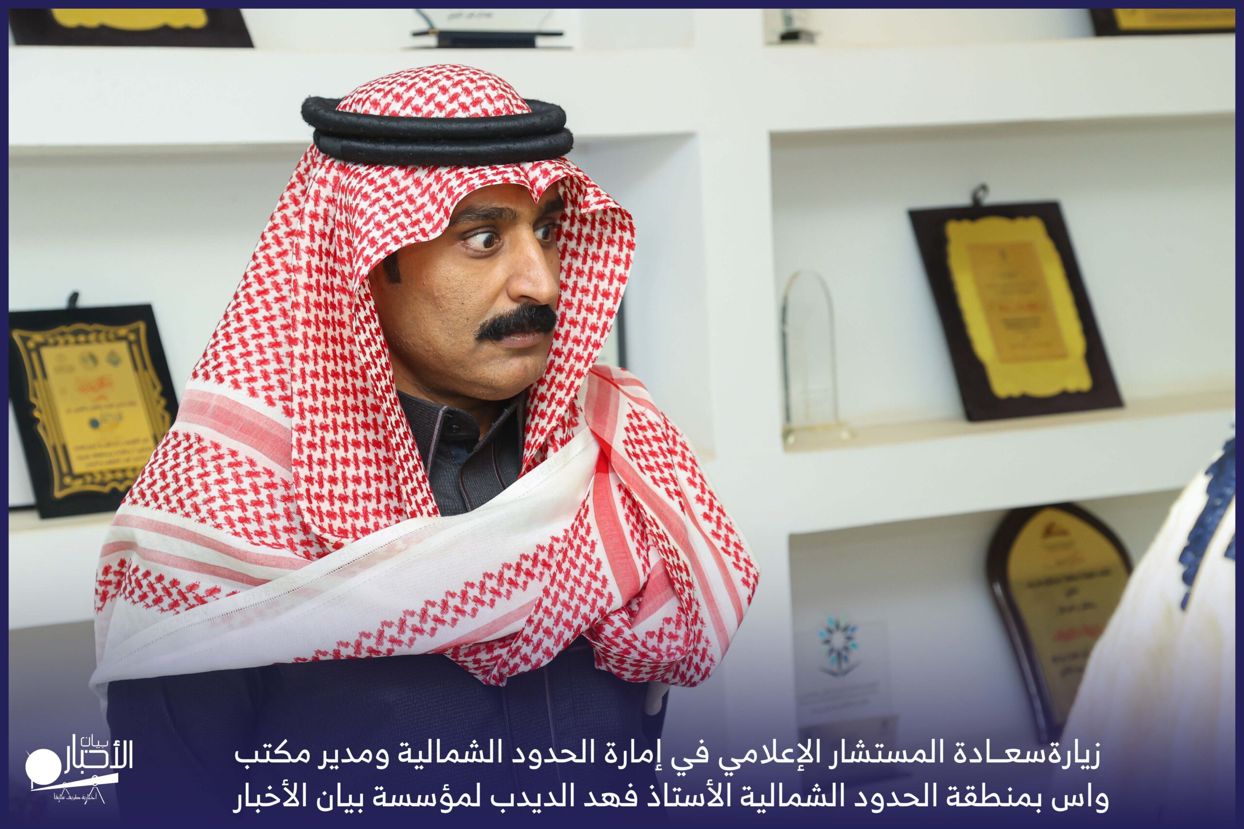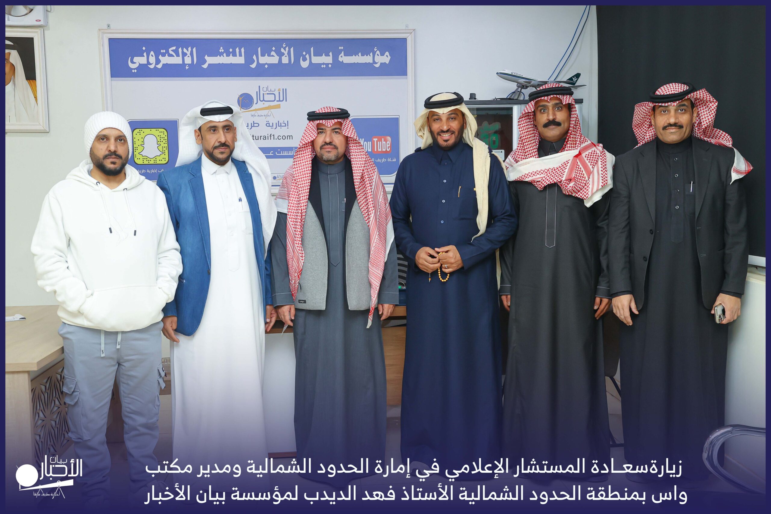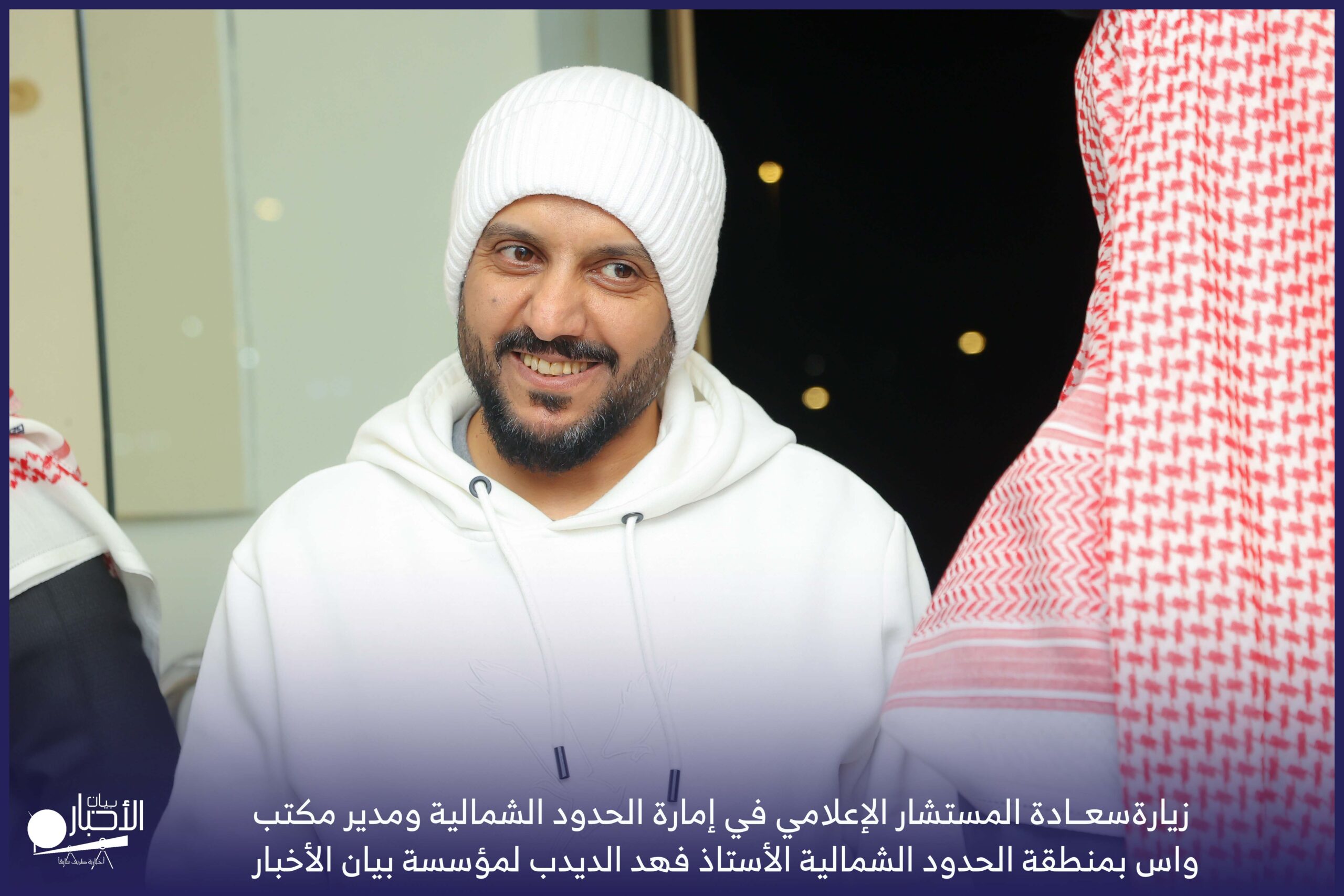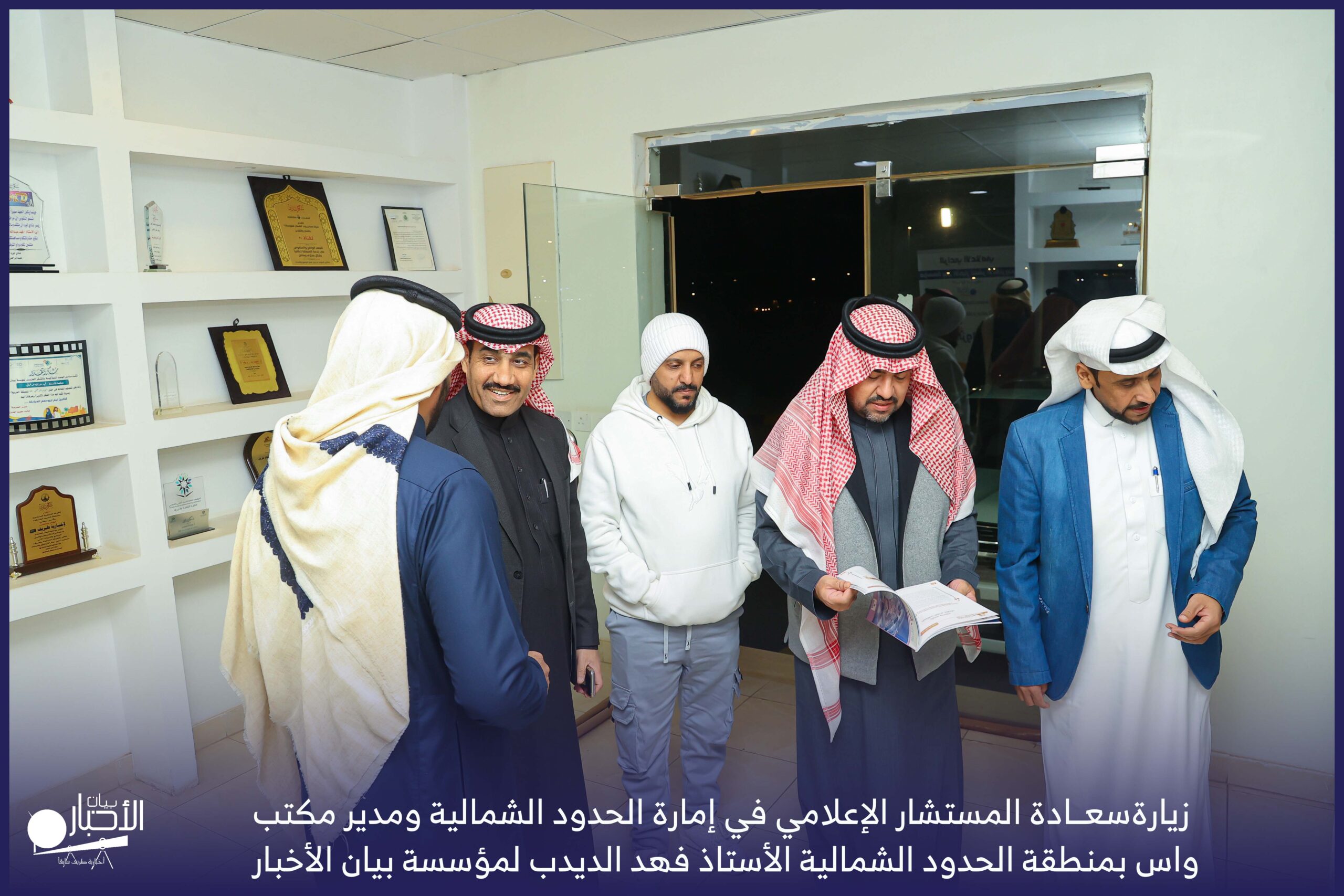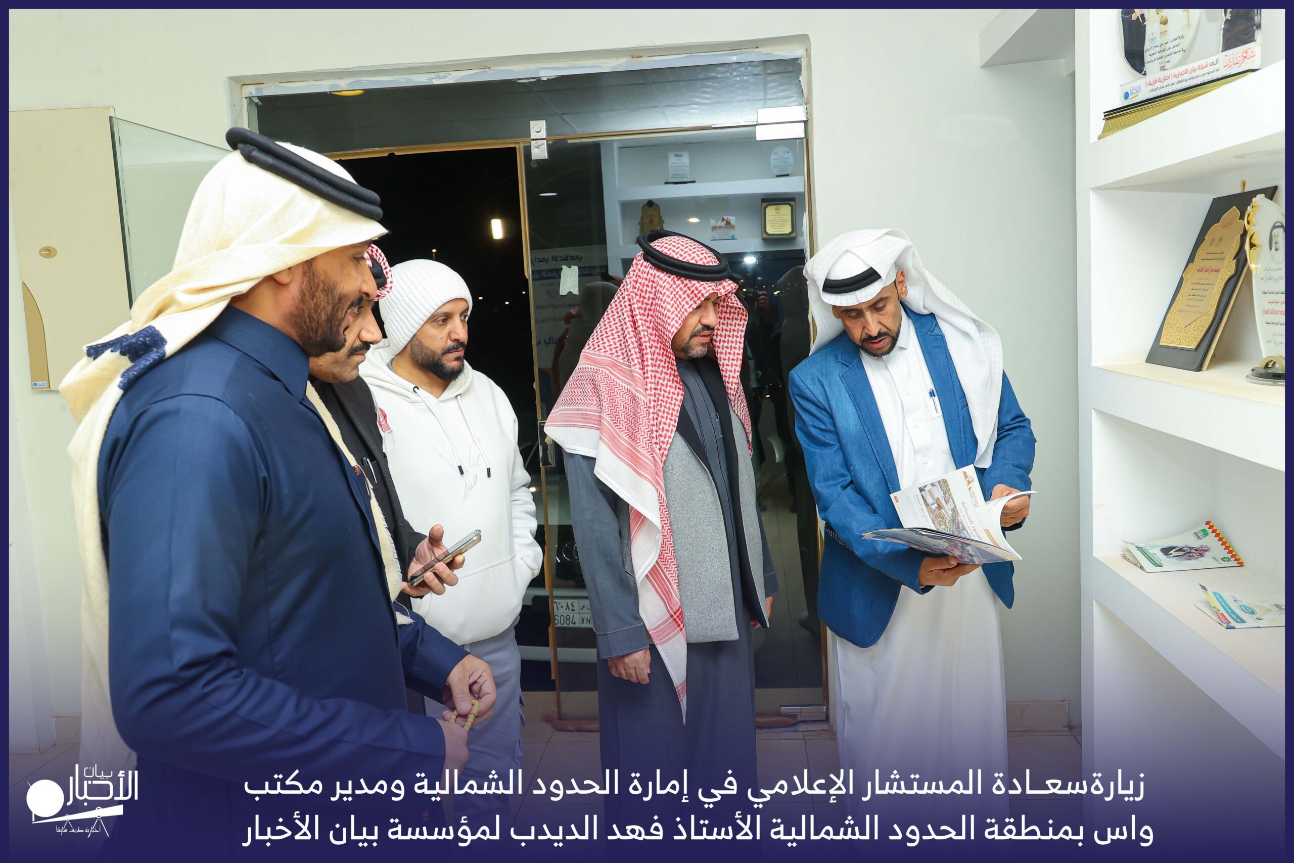 زار سعادة المستشار الإعلامي في إمارة الحدود الشمالية ومدير مكتب واس بمنطقة الحدود الشمالية الأستاذ فهد الديدب، مؤسسة بيان الأخبار (إخبارية طريف سابقا) ، يرافقه مراسل قناة الإخبارية بمحافظة رفحاء الأستاذ عبدالله عايش العنزي ، وكان في استقباله إدارة الموقع ممثلة بالأستاذ فهد الدغماني، والأستاذ محمد الموزن، والأستاذ منصور المتعب.