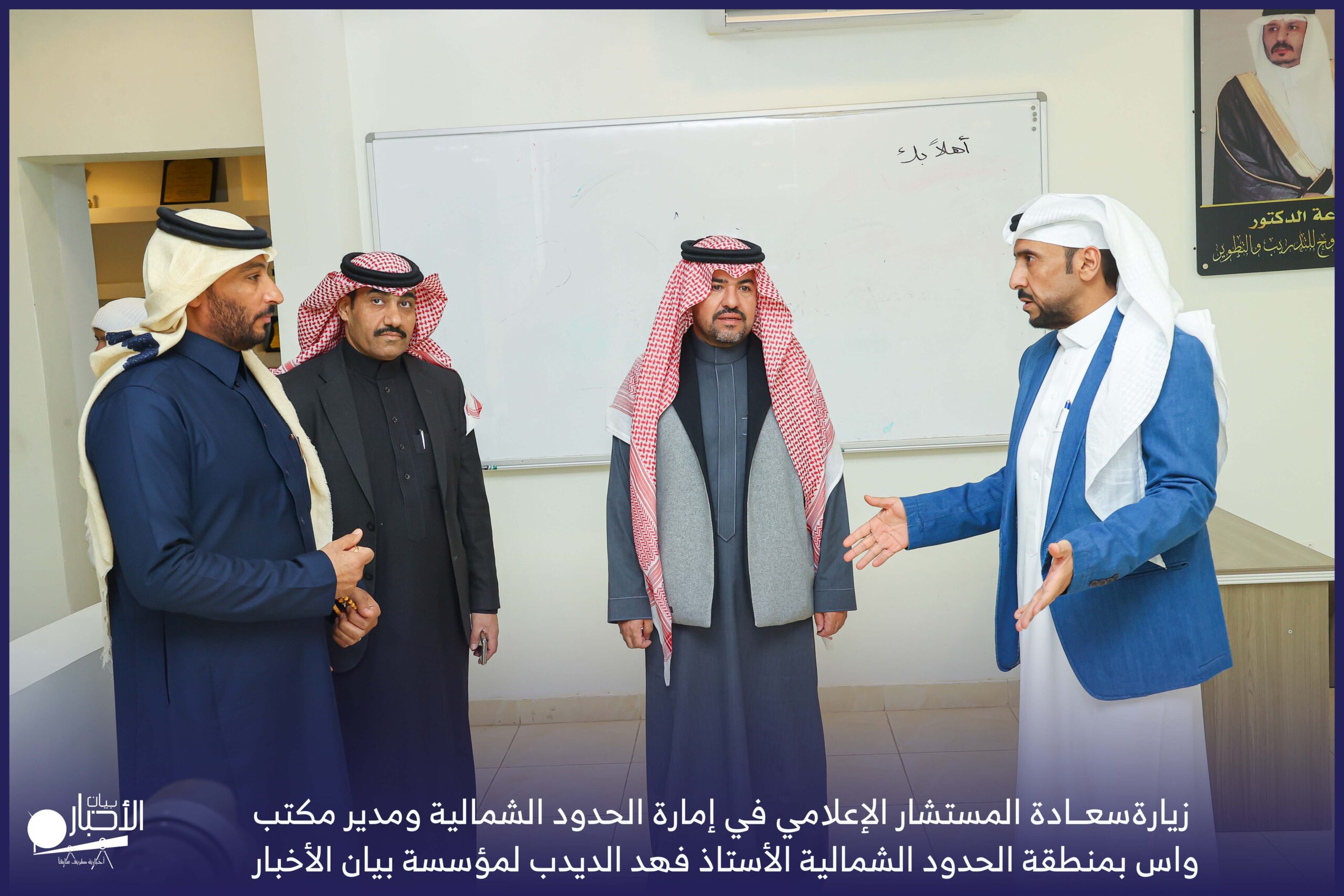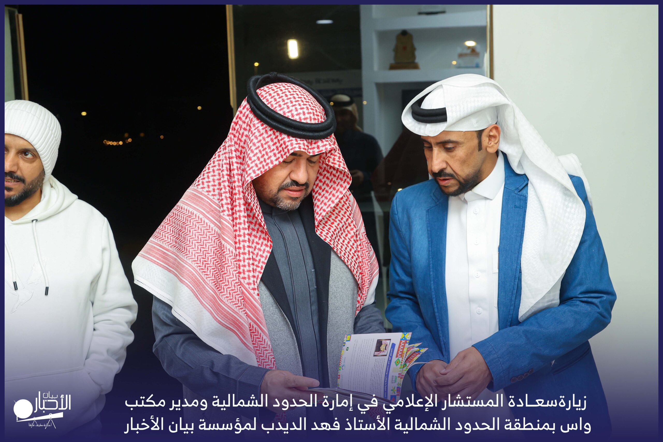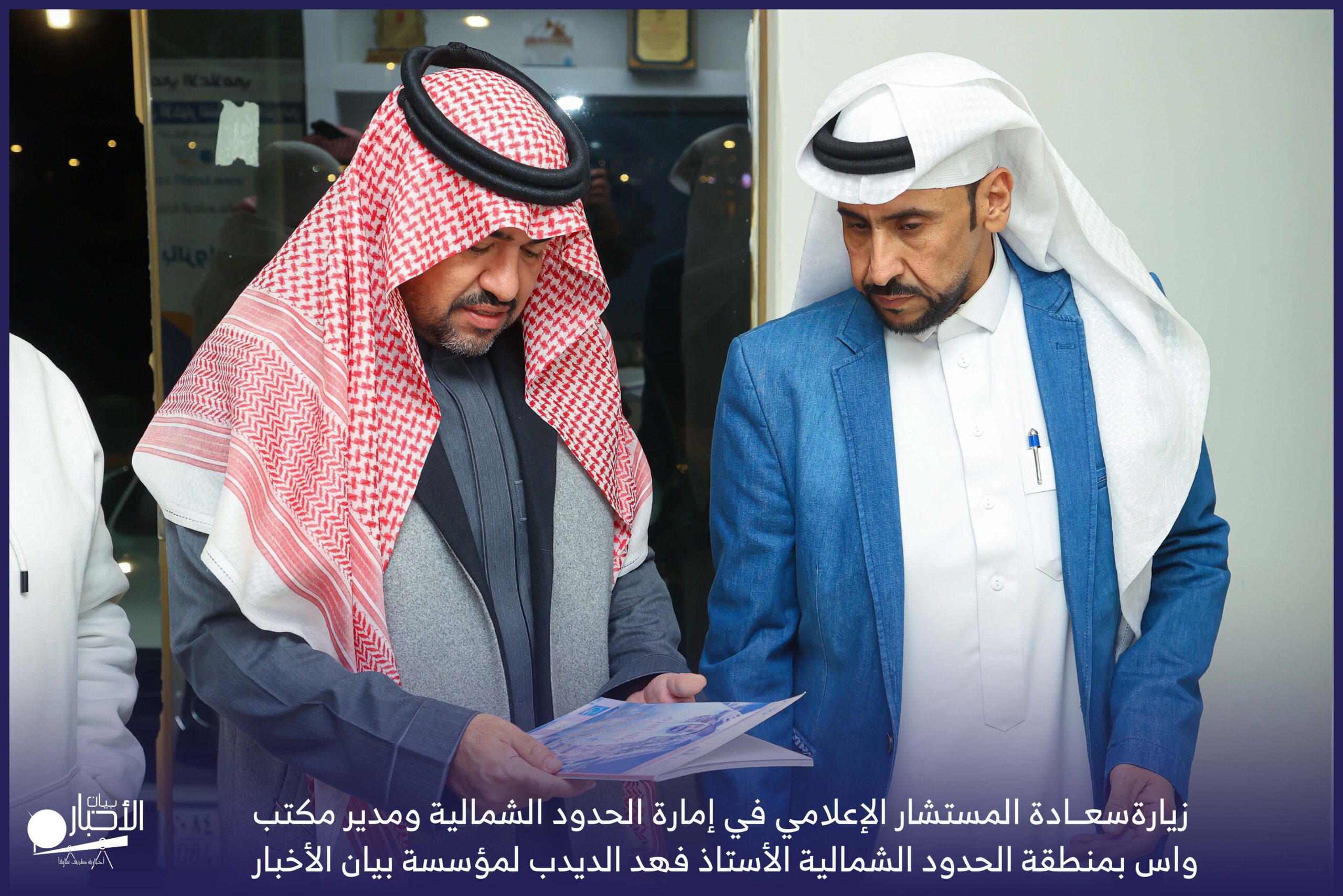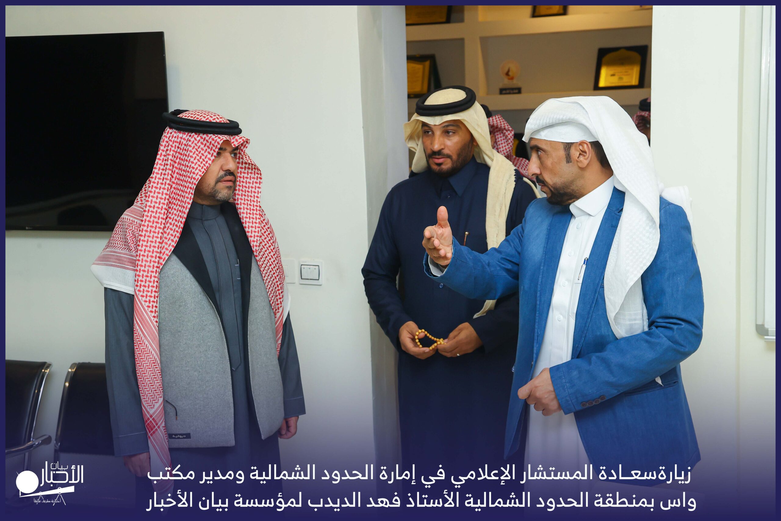 زار سعادة المستشار الإعلامي في إمارة الحدود الشمالية ومدير مكتب واس بمنطقة الحدود الشمالية الأستاذ فهد الديدب، مؤسسة بيان الأخبار (إخبارية طريف سابقا) ، يرافقه مراسل قناة الإخبارية بمحافظة رفحاء الأستاذ عبدالله عايش العنزي ، وكان في استقباله إدارة الموقع ممثلة بالأستاذ فهد الدغماني، والأستاذ محمد الموزن، والأستاذ منصور المتعب.