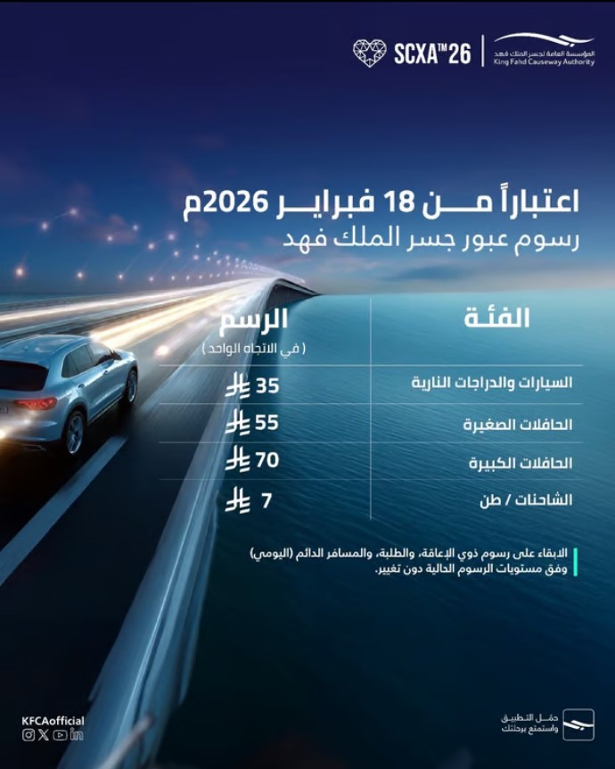 أعلنت المؤسسة العامة لجسر الملك فهد (KFCA) عن تعديل رسوم عبور الجسر الذي يربط المملكة العربية السعودية بمملكة البحرين، وذلك اعتباراً من يوم 18 فبراير 2026، في خطوة تهدف إلى تحسين تجربة المسافرين وتعزيز كفاءة التشغيل.