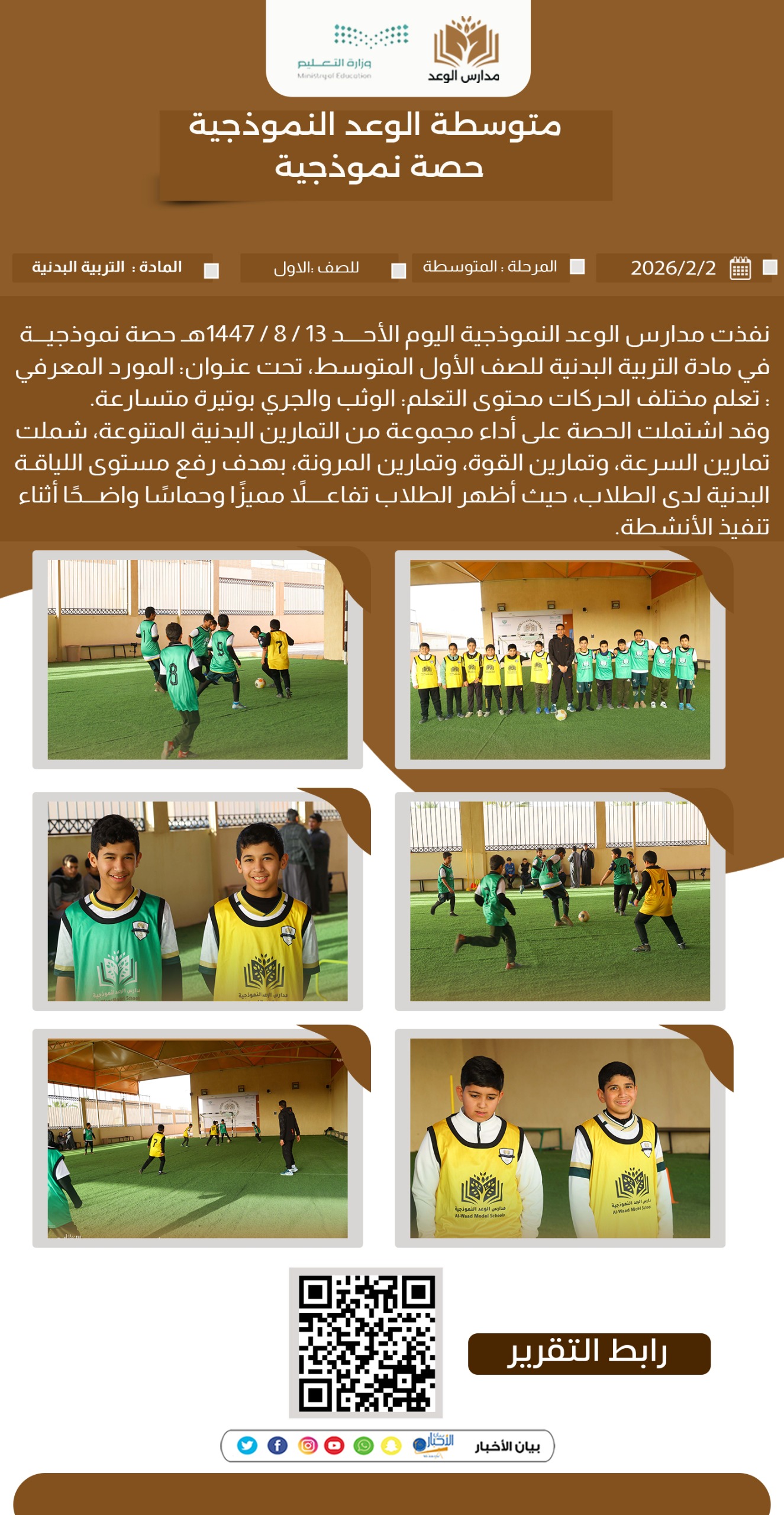 نفذت مدارس الوعد النموذجية اليوم الأحد 13 / 8 / 1447هـ حصة نموذجية في مادة التربية البدنية للصف الأول المتوسط، تحت عنوان: المورد المعرفي: تعلم مختلف الحركات محتوى التعلم: الوثب والجري بوتيرة متسارعة.