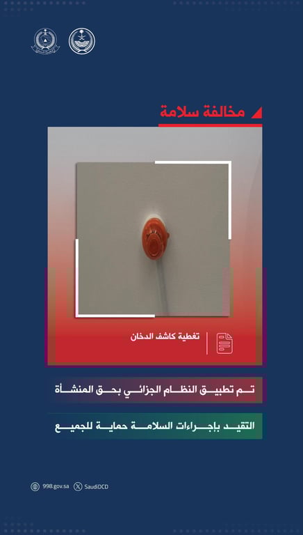 أكدت المديرية العامة للدفاع المدني أن تغطية كاشف الدخان تُعد مخالفة سلامة تستوجب العقوبة، كونها تعطل أحد أهم عناصر أنظمة الإنذار المبكر من الحرائق.