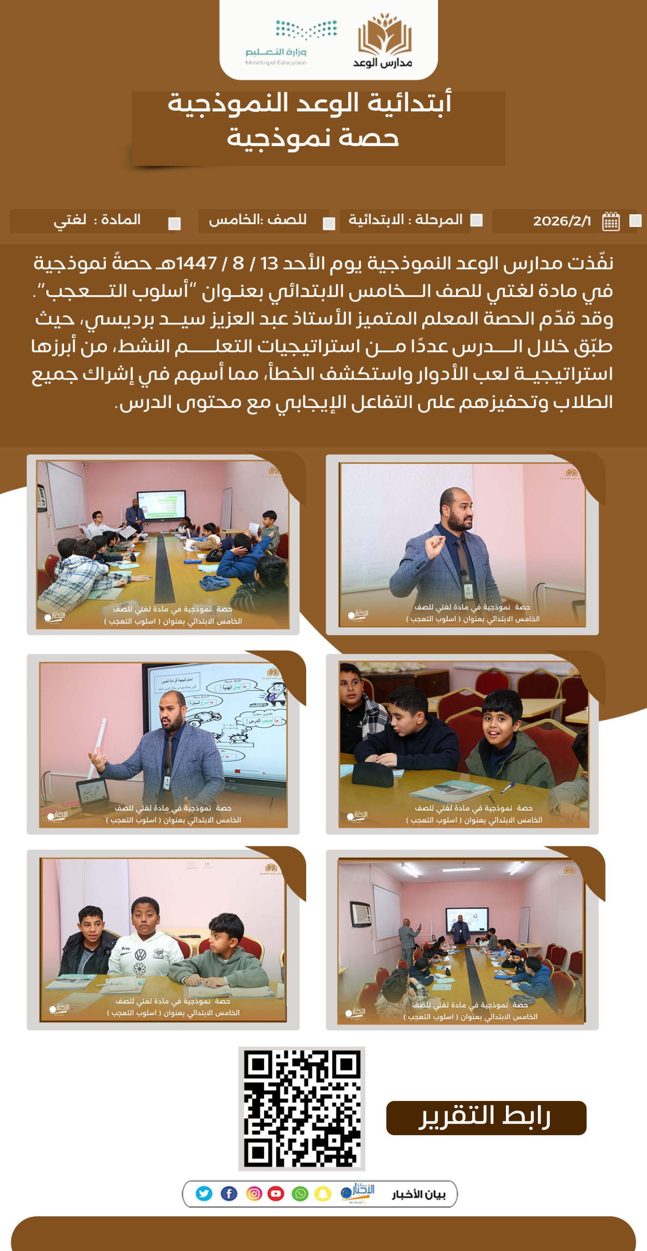 نفّذت مدارس الوعد النموذجية يوم الأحد 13 / 8 / 1447هـ حصةً نموذجية في مادة لغتي للصف الخامس الابتدائي بعنوان “أسلوب التعجب”.