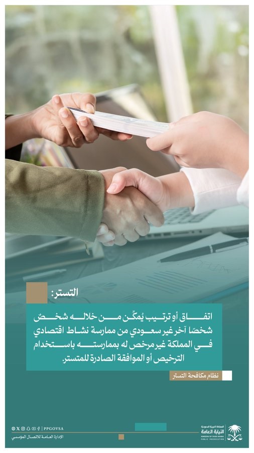 وأوضحت النيابة أن التستر هو اتفاق أو ترتيب يُمكن من خلاله شخصٌ شخصاً آخر غير سعودي من ممارسة نشاط اقتصادي في المملكة غير مرخص له بممارسته باستخدام الترخيص أو الموافقة الصادرة للمتستر.