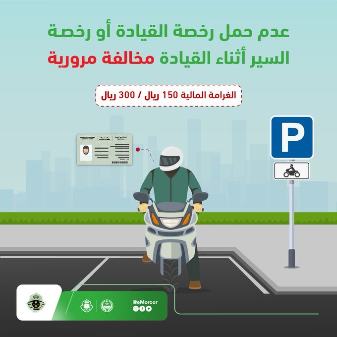 وأكملت، أن عدم حمل رخصة القيادة أو رخصة السير أثناء القيادة مخالفة مرورية تتراوح الغرامة بشأنها من 150 ريالا إلى 300 ريال.