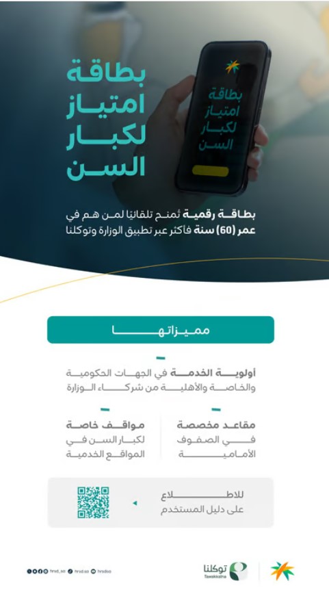 وتُعد بطاقة «امتياز» هوية رقمية ذكية تُمنح تلقائيًا للمواطنين والمواطنات ممن أتموا سن الـ60 عامًا، دون الحاجة إلى تقديم طلبات أو إجراء أي معاملات ورقية؛ إذ تظهر البطاقة مباشرة عند بلوغ السن المحددة في تطبيق «توكلنا» وتطبيق وزارة الموارد البشرية للأفراد، لتكون أداة رقمية تسهّل معاملاتهم في مختلف الجهات.