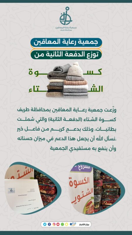 وزّعت جمعية رعاية المعاقين بمحافظة طريف كسوة الشتاء (الدفعة الثانية) على مستفيديها، والتي شملت بطانيات واحتياجات شتوية، وذلك بدعم كريم من فاعل خير، في إطار جهود الجمعية المستمرة لتلبية احتياجات المستفيدين والتخفيف من آثار برودة فصل الشتاء.