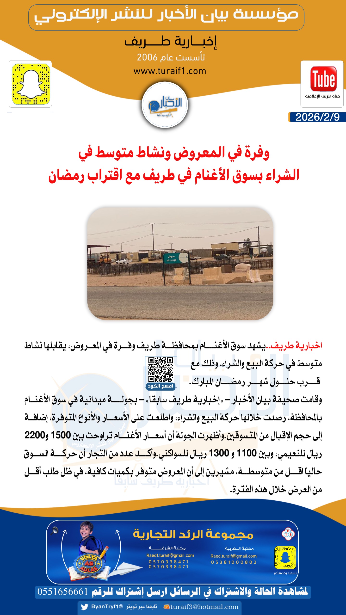 وقامت صحيفة بيان الأخبار – «إخبارية طريف سابقاً» – بجولة ميدانية في سوق الأغنام بالمحافظة، رصدت خلالها حركة البيع والشراء، واطلعت على الأسعار والأنواع المتوفرة، إضافة إلى حجم الإقبال من المتسوقين.