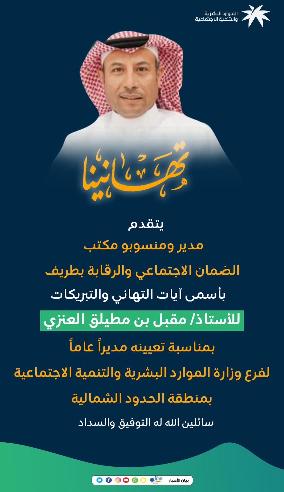 رفع مدير ومنسوبو مكتب الضمان الاجتماعي والرقابة بمحافظة طريف أسمى آيات التهاني والتبريكات للأستاذ مقبل بن مطيلق العنزي، بمناسبة صدور قرار مساعد وزير الموارد البشرية والتنمية الاجتماعية للخدمات المشتركة بتكليفه مديرًا عامًا لفرع الوزارة بمنطقة الحدود الشمالية.