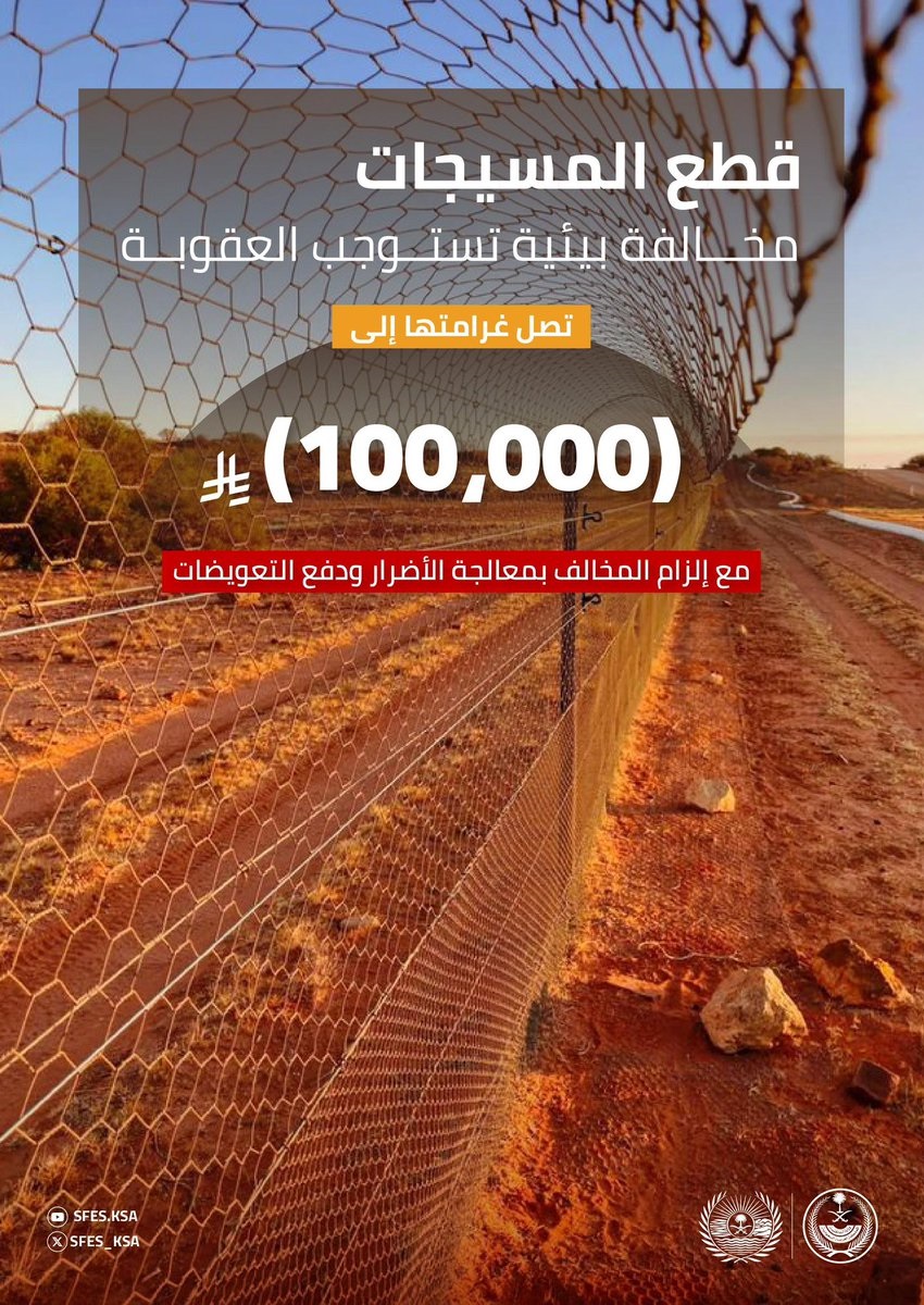 وأوضحت عبر حسابها على منصة إكس أن غرامة قطع المسيجات تصل إلى 100 ألف ريال، مع إلزام المخالف بإصلاح الأضرار ودفع التعويضات البيئية، مشددةً على ضرورة الالتزام بالأنظمة للحفاظ على البيئة واستدامة الغطاء النباتي.
