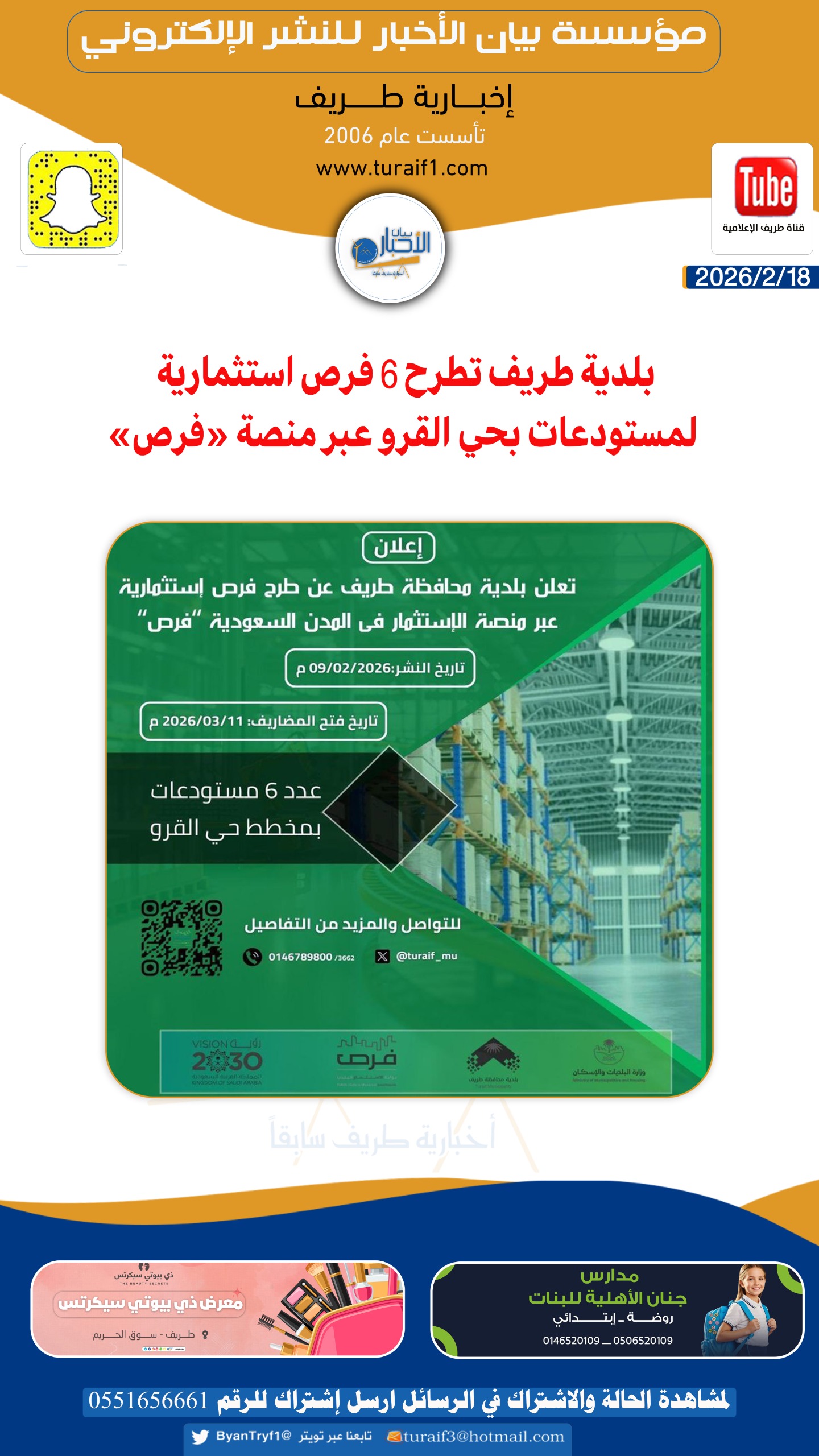 أعلنت بلدية محافظة طريف عن طرح فرص استثمارية جديدة عبر منصة الاستثمار في المدن السعودية، تشمل عدد 6 مستودعات بمخطط حي القرو، وذلك ضمن جهودها لتعزيز الاستثمار وتنمية الأنشطة الاقتصادية بالمحافظة.