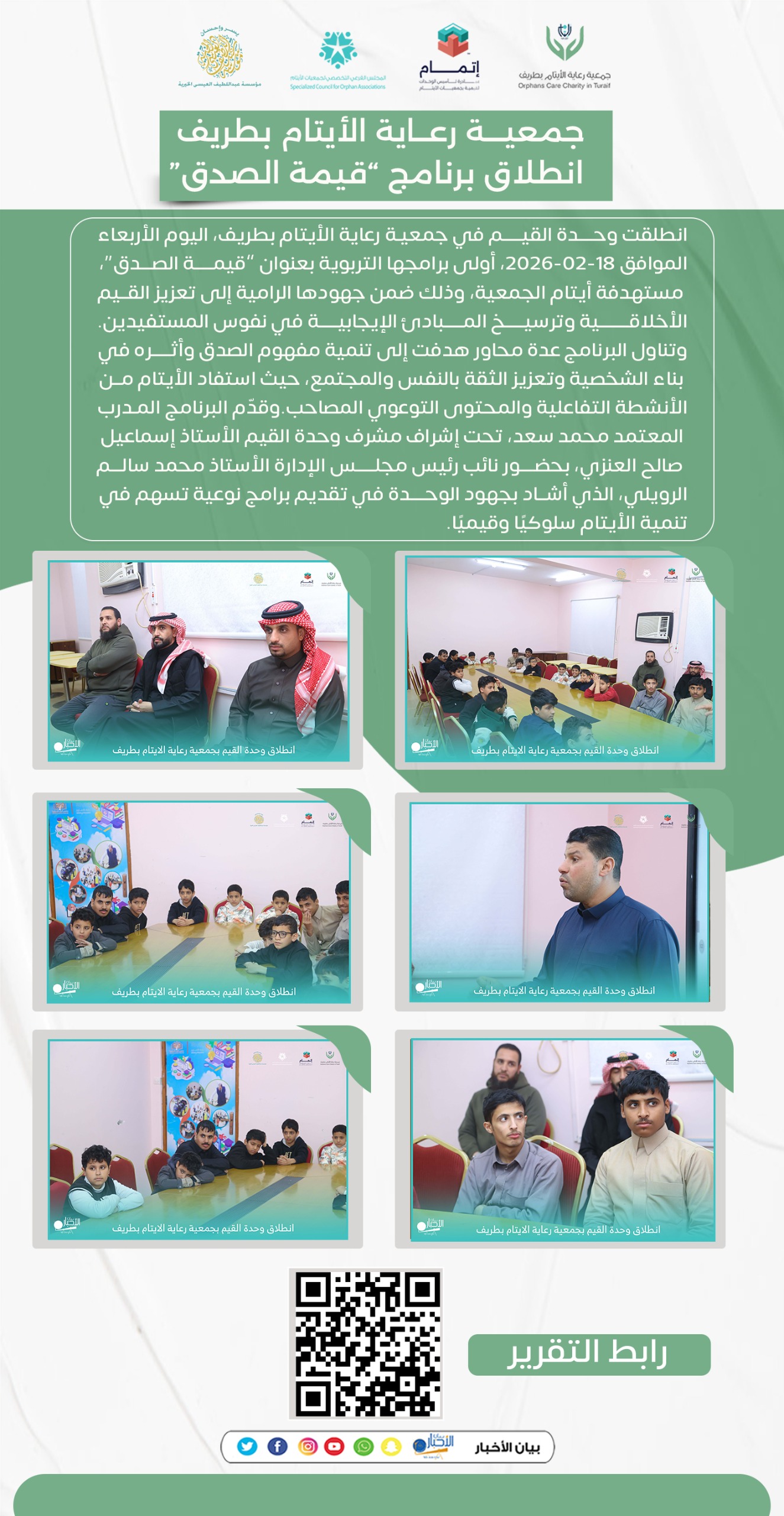 انطلقت وحدة القيم في جمعية رعاية الأيتام بطريف، اليوم الأربعاء الموافق 18-02-2026، أولى برامجها التربوية بعنوان “قيمة الصدق”، مستهدفة أيتام الجمعية، وذلك ضمن جهودها الرامية إلى تعزيز القيم الأخلاقية وترسيخ المبادئ الإيجابية في نفوس المستفيدين.