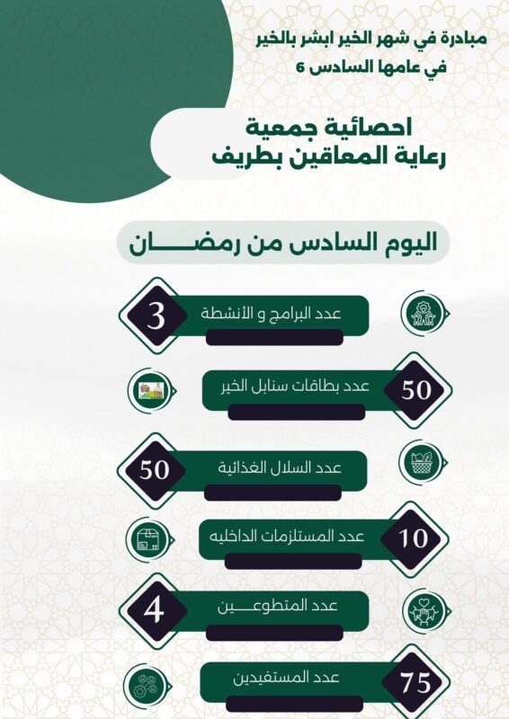 واصلت جمعية رعاية المعاقين بطريف جهودها الإنسانية خلال اليوم الرابع والخامس والسادس من شهر رمضان المبارك، وذلك ضمن مبادرة أبشر بالخير ٦، حيث نفذت عددًا من البرامج والأنشطة الرمضانية، إلى جانب توزيع بطاقات سنابل الخير والسلال الغذائية والمستلزمات الداخلية على مستفيديها في محافظة طريف.