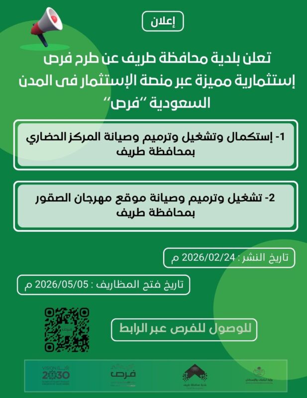 وأوضحت البلدية أن تاريخ نشر الإعلان هو 24/02/2026م، على أن يتم فتح المظاريف بتاريخ 05/05/2026م، داعية المستثمرين والراغبين إلى الاطلاع على التفاصيل والتقديم عبر الرابط المخصص في المنصة.