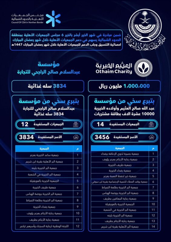 شركاء الخير يدعمون مستفيدي جمعيات طريف الخيرية وعدد من الجمعيات بالشمالية بـ 1343 بطاقة شرائية و483 سلة غذائية