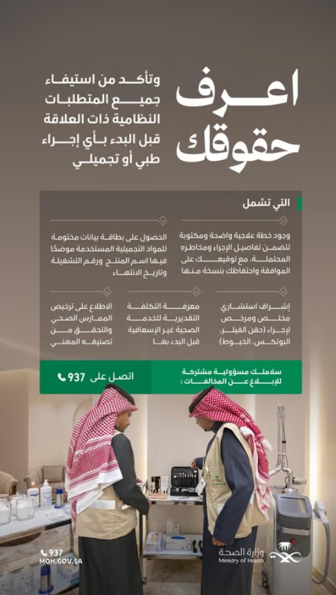 وشدّدت «الصحة» على أهمية وعي المستفيد بحقوقه قبل أي إجراء طبي أو تجميلي، داعية إلى الإبلاغ عن أي مخالفات عبر مركز الاتصال (937)، ومؤكدة استمرار جهودها الرقابية لحماية الصحة العامة وتعزيز سلامة الخدمات الصحية.