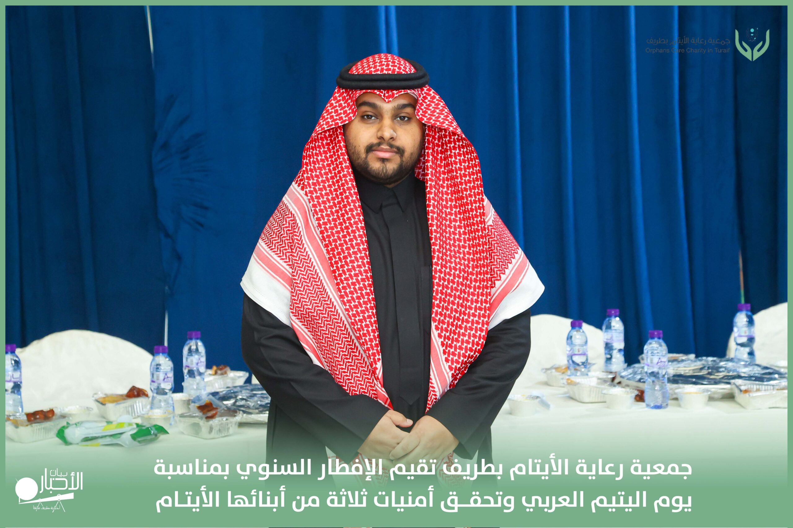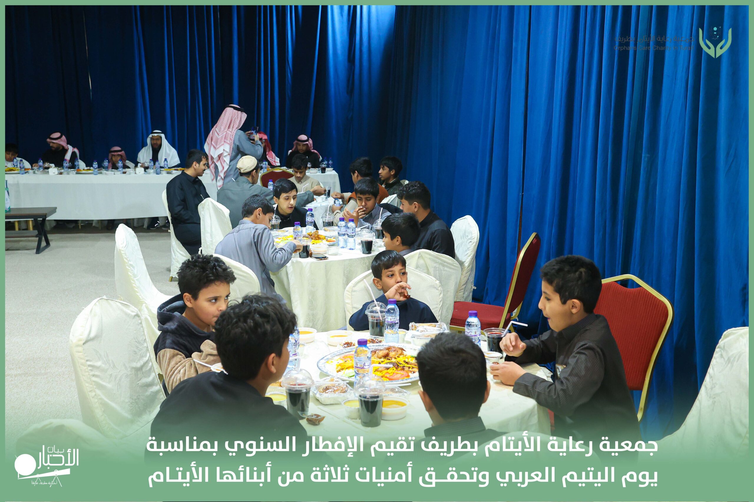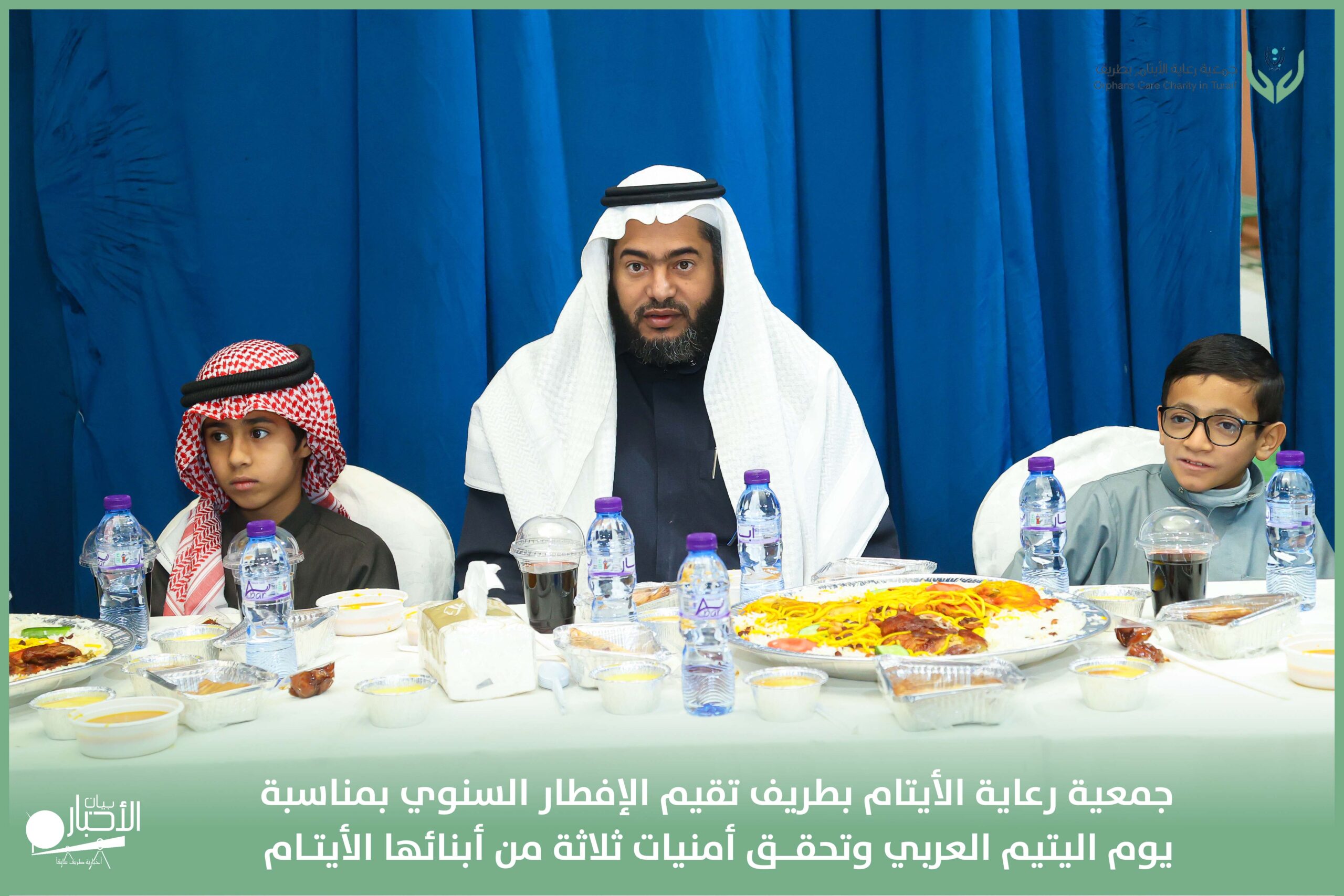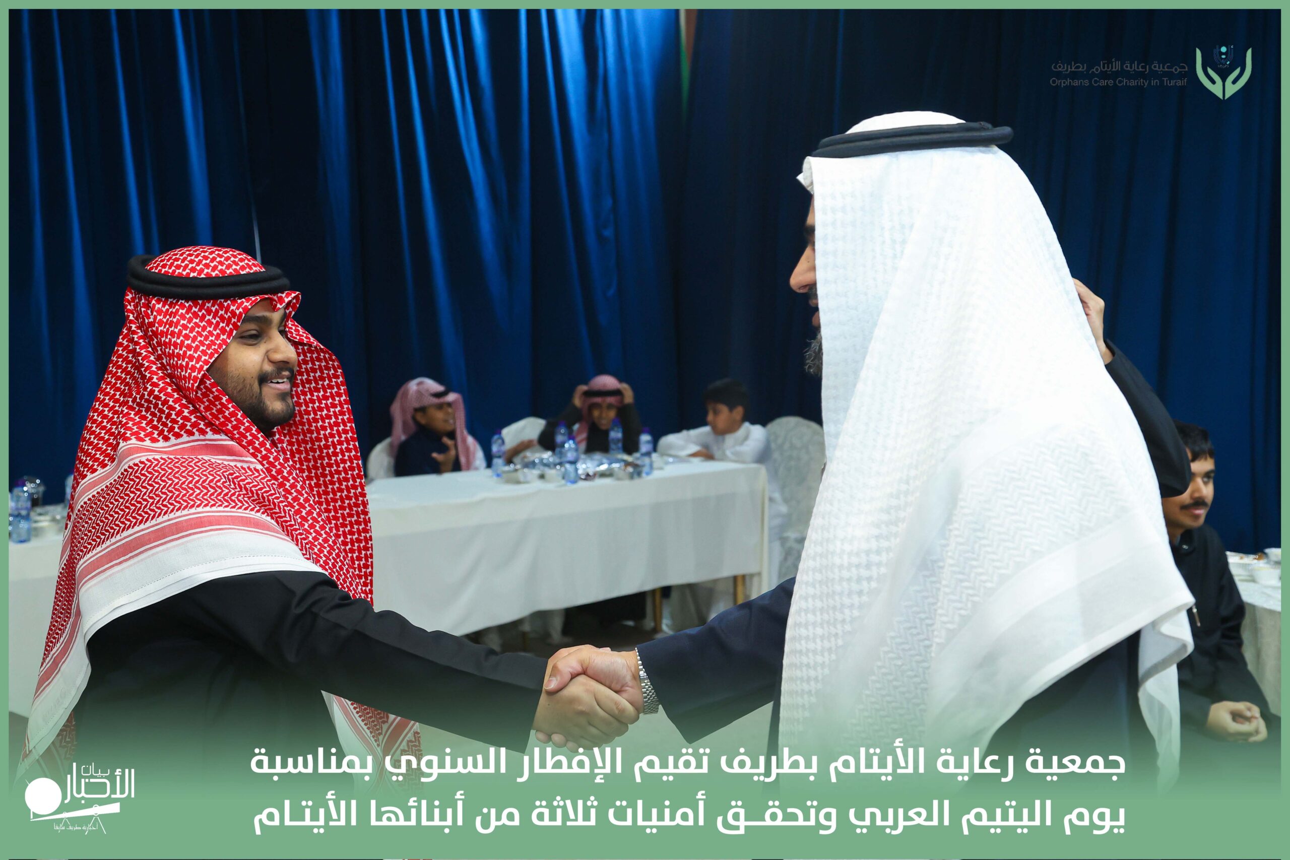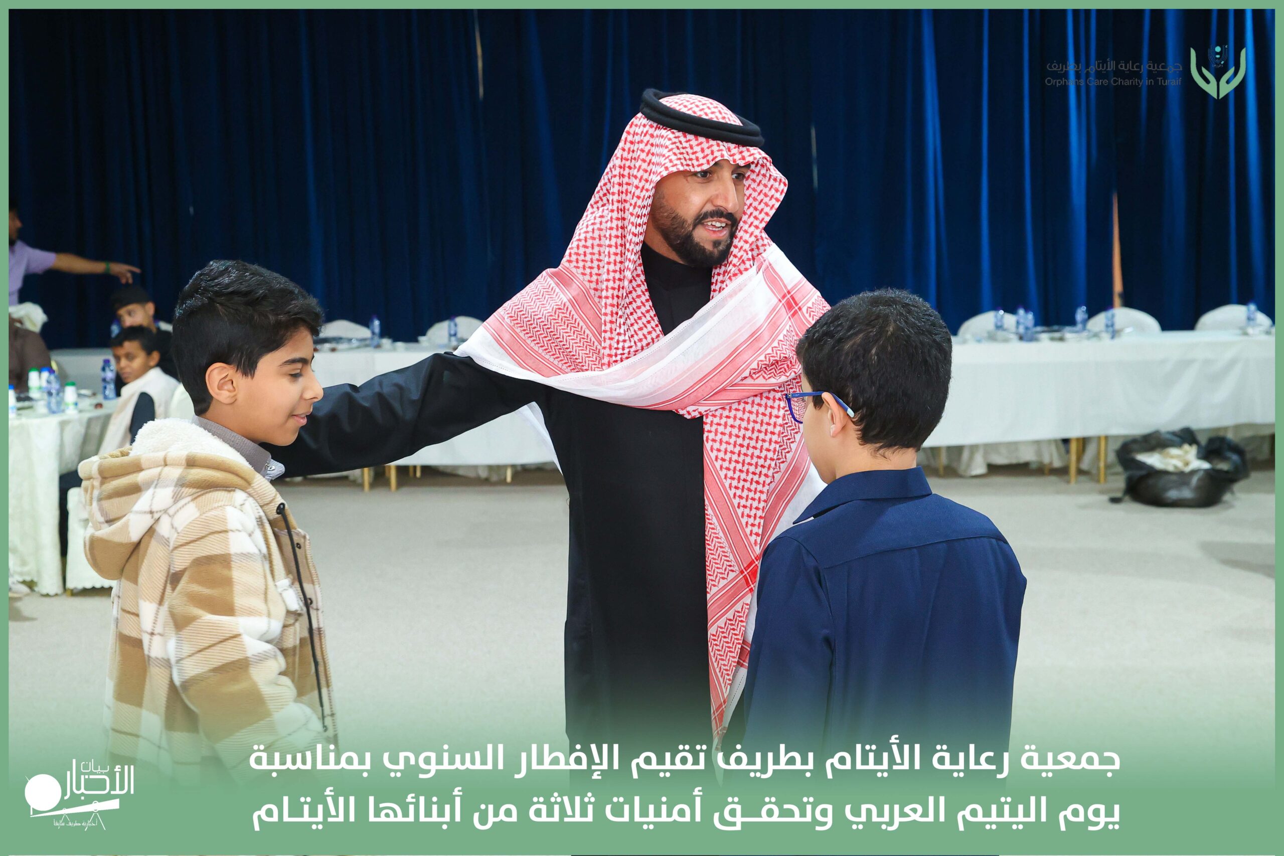 أقامت جمعية رعاية الأيتام بطريف مساء اليوم الجمعة 17 رمضان 1447هـ، حفل الإفطار السنوي بمناسبة يوم اليتيم العربي، وذلك بمقر مدرسة الوعد النموذجية الأهلية المتوسطة والثانوية، بحضور عدد من أعضاء مجلس الإدارة، والإدارة التنفيذية بالجمعية، وعدد من الضيوف والحضور الكرام من ابنائها الايتام
