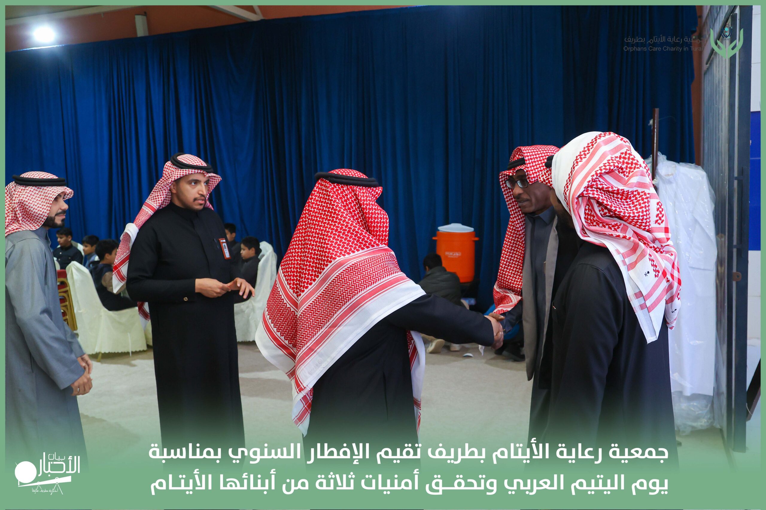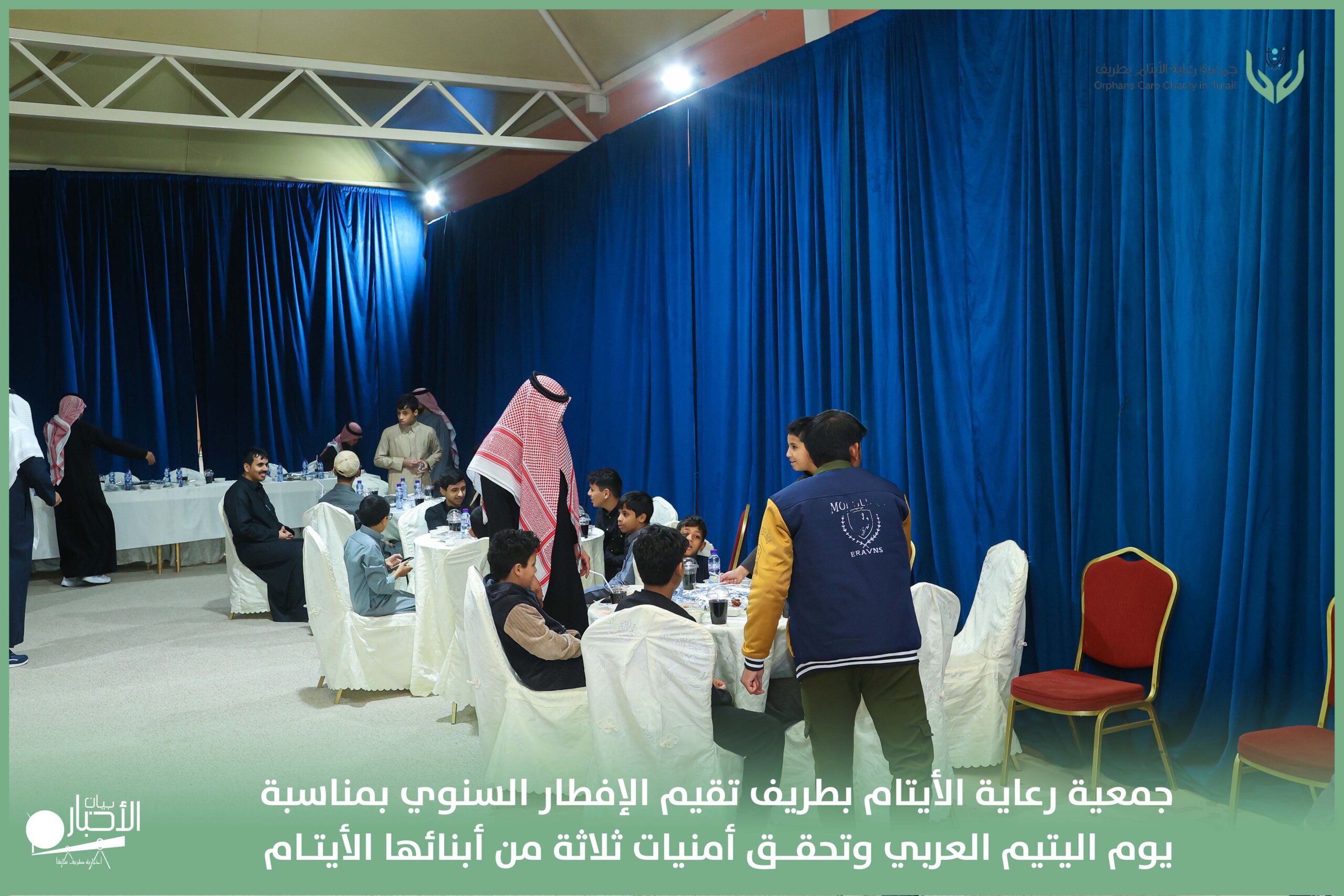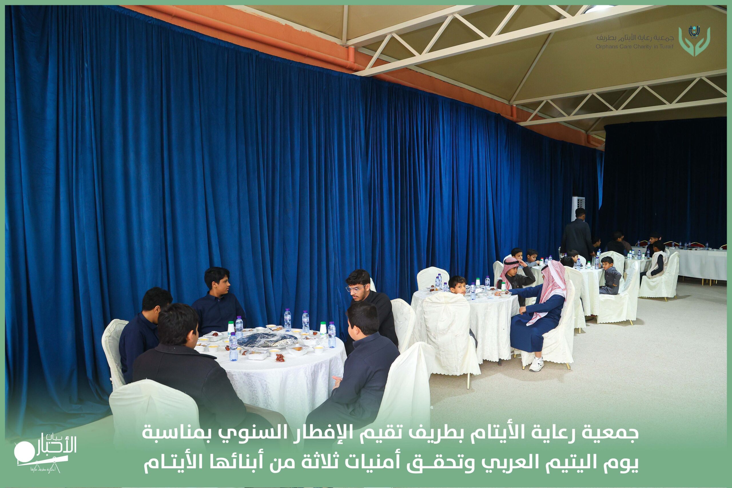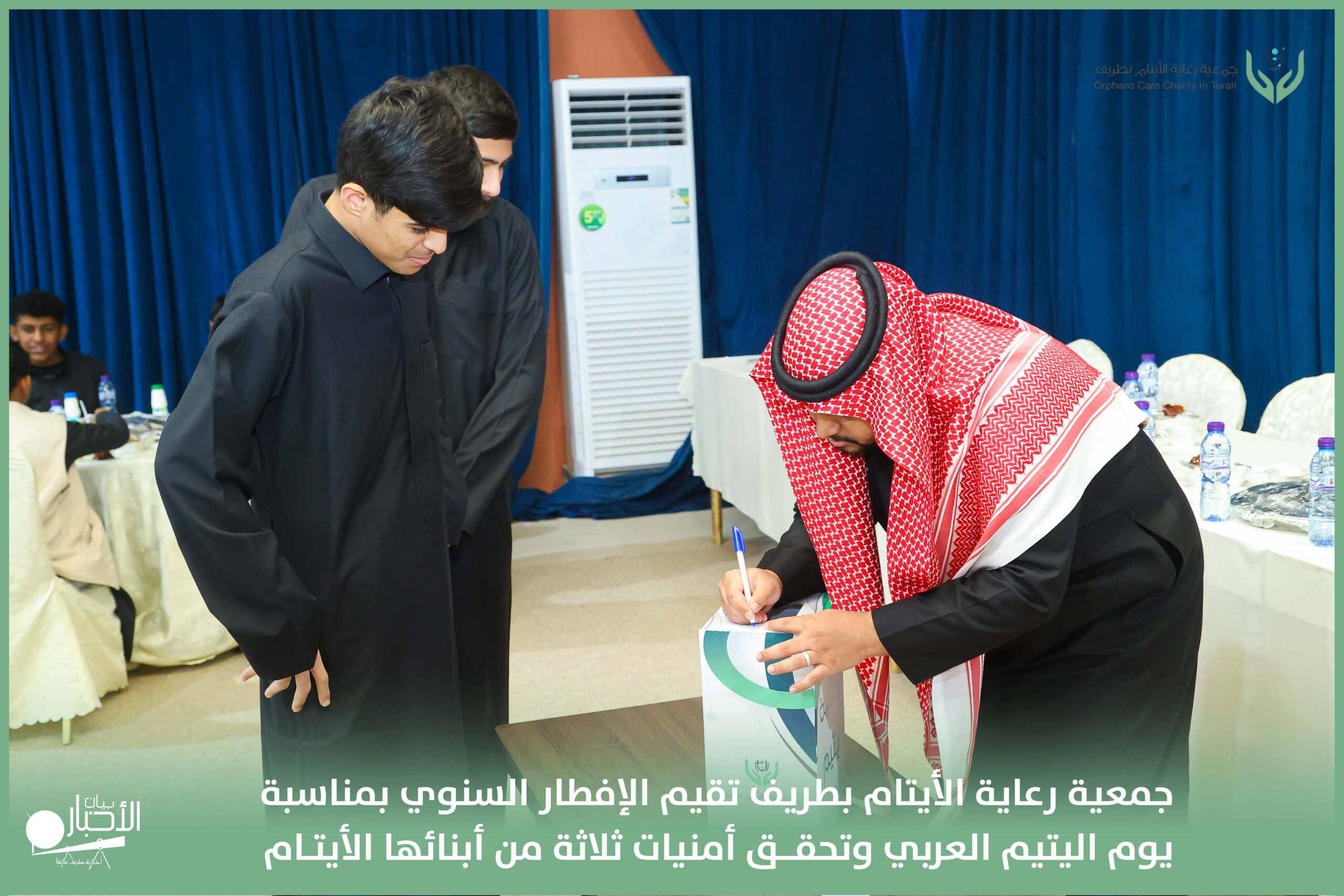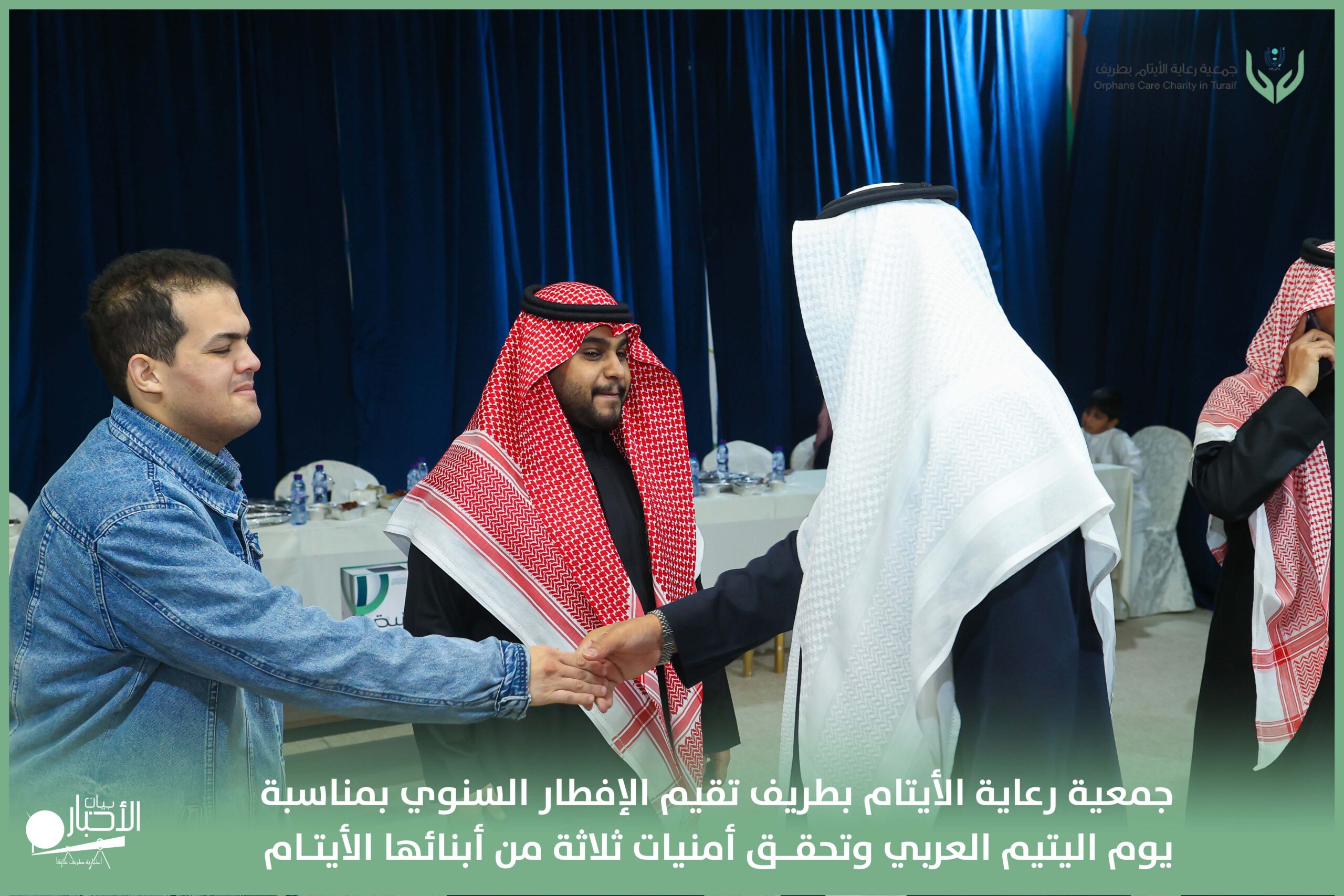 أقامت جمعية رعاية الأيتام بطريف مساء اليوم الجمعة 17 رمضان 1447هـ، حفل الإفطار السنوي بمناسبة يوم اليتيم العربي، وذلك بمقر مدرسة الوعد النموذجية الأهلية المتوسطة والثانوية، بحضور عدد من أعضاء مجلس الإدارة، والإدارة التنفيذية بالجمعية، وعدد من الضيوف والحضور الكرام من ابنائها الايتام