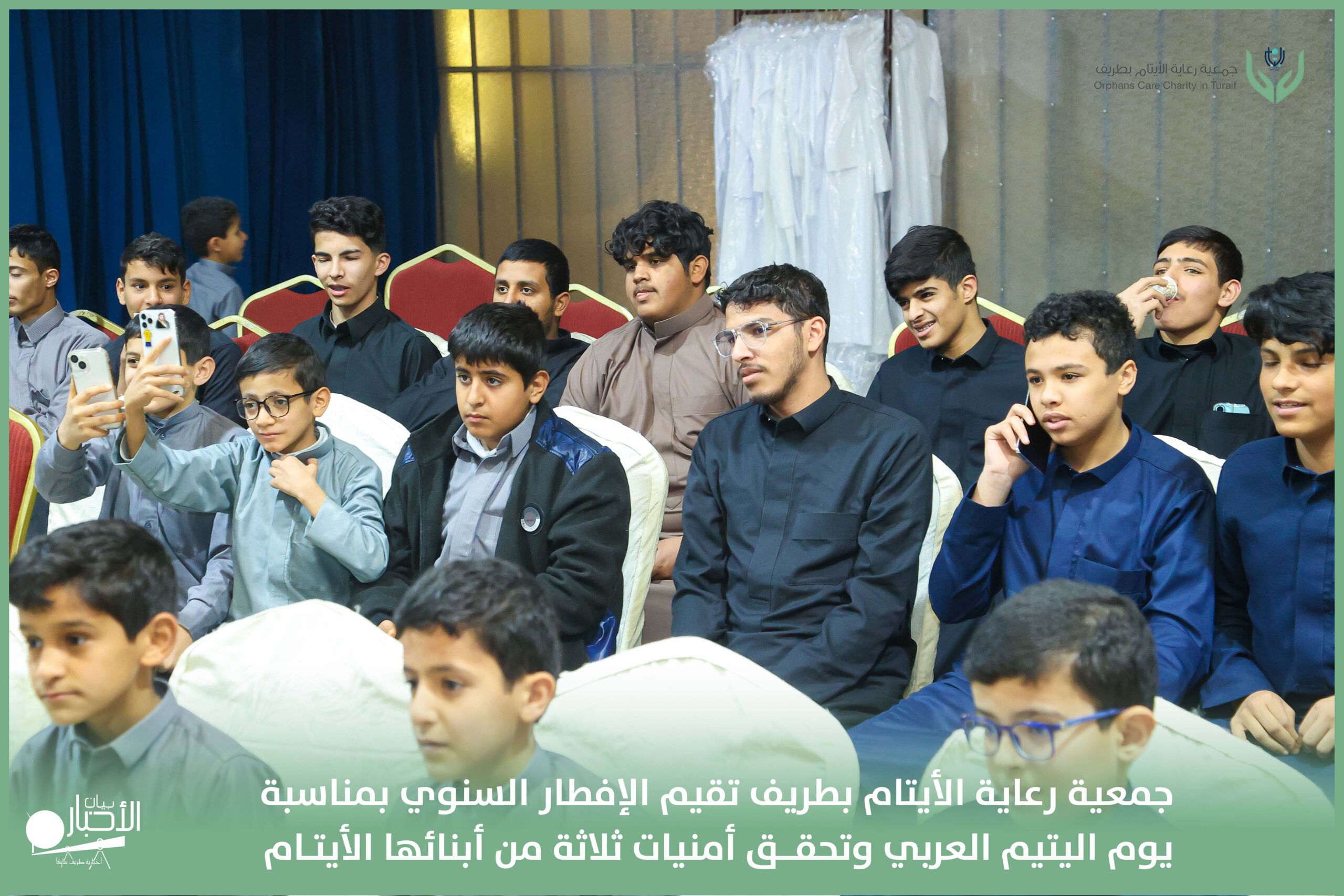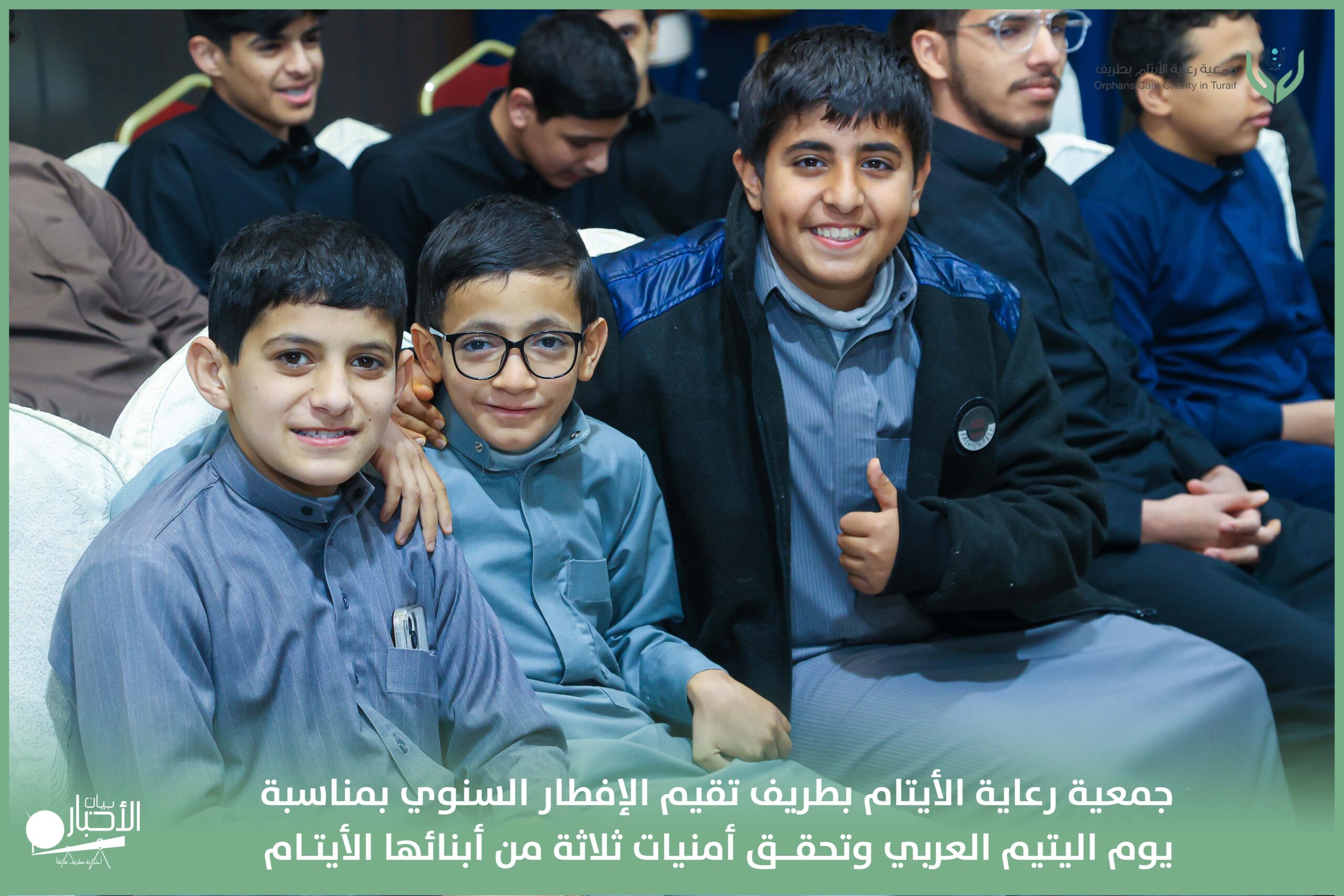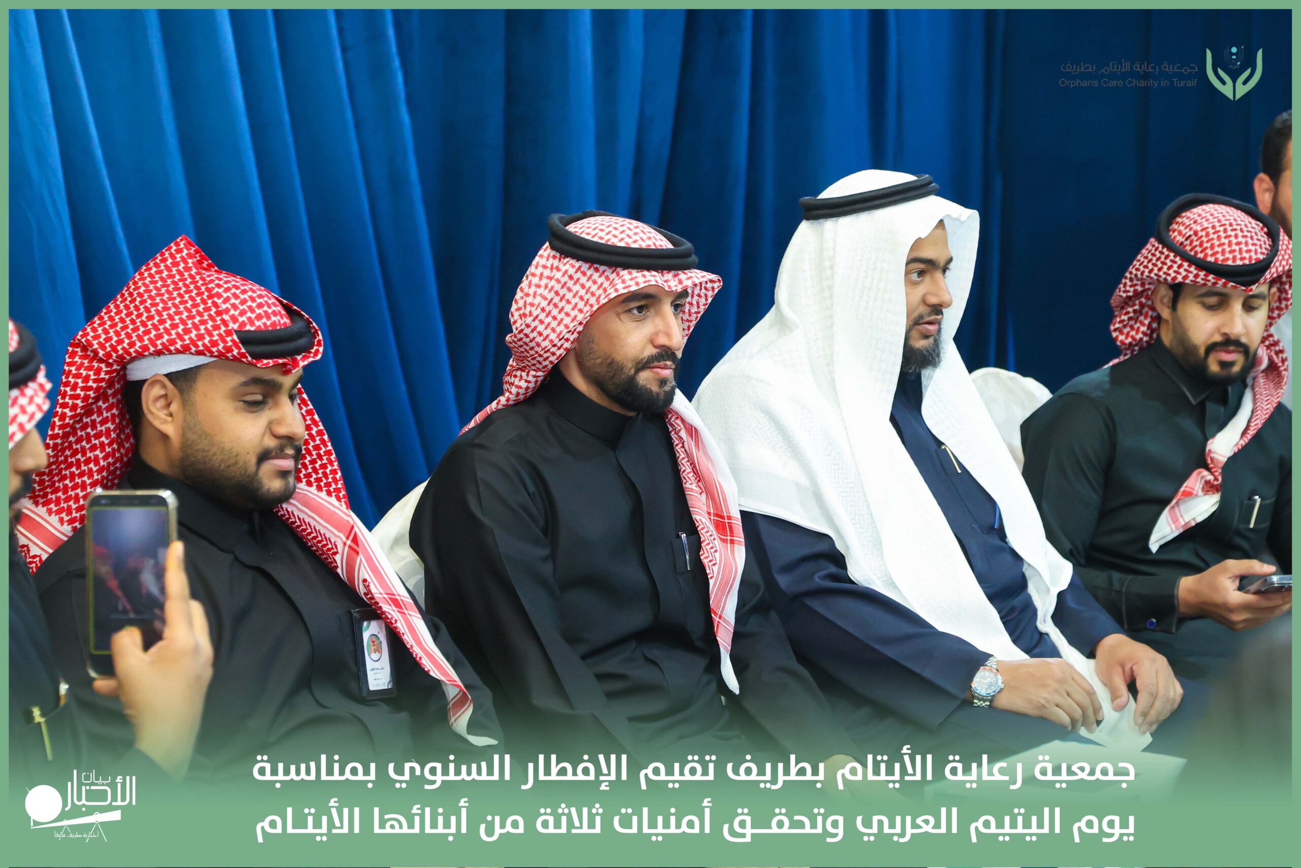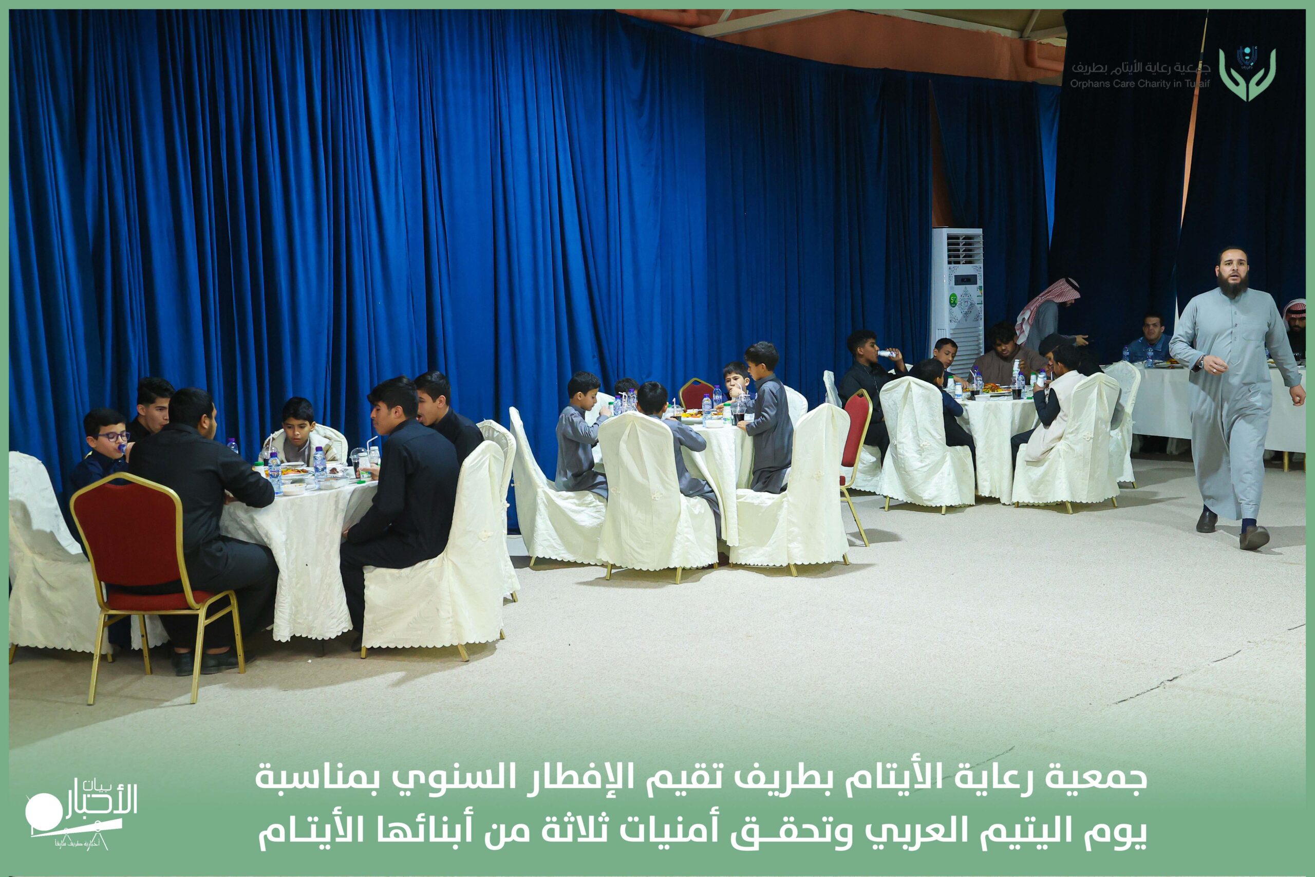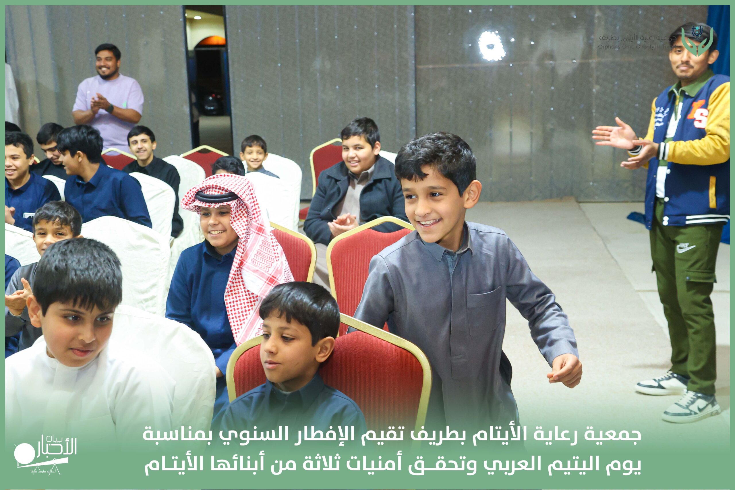 أقامت جمعية رعاية الأيتام بطريف مساء اليوم الجمعة 17 رمضان 1447هـ، حفل الإفطار السنوي بمناسبة يوم اليتيم العربي، وذلك بمقر مدرسة الوعد النموذجية الأهلية المتوسطة والثانوية، بحضور عدد من أعضاء مجلس الإدارة، والإدارة التنفيذية بالجمعية، وعدد من الضيوف والحضور الكرام من ابنائها الايتام