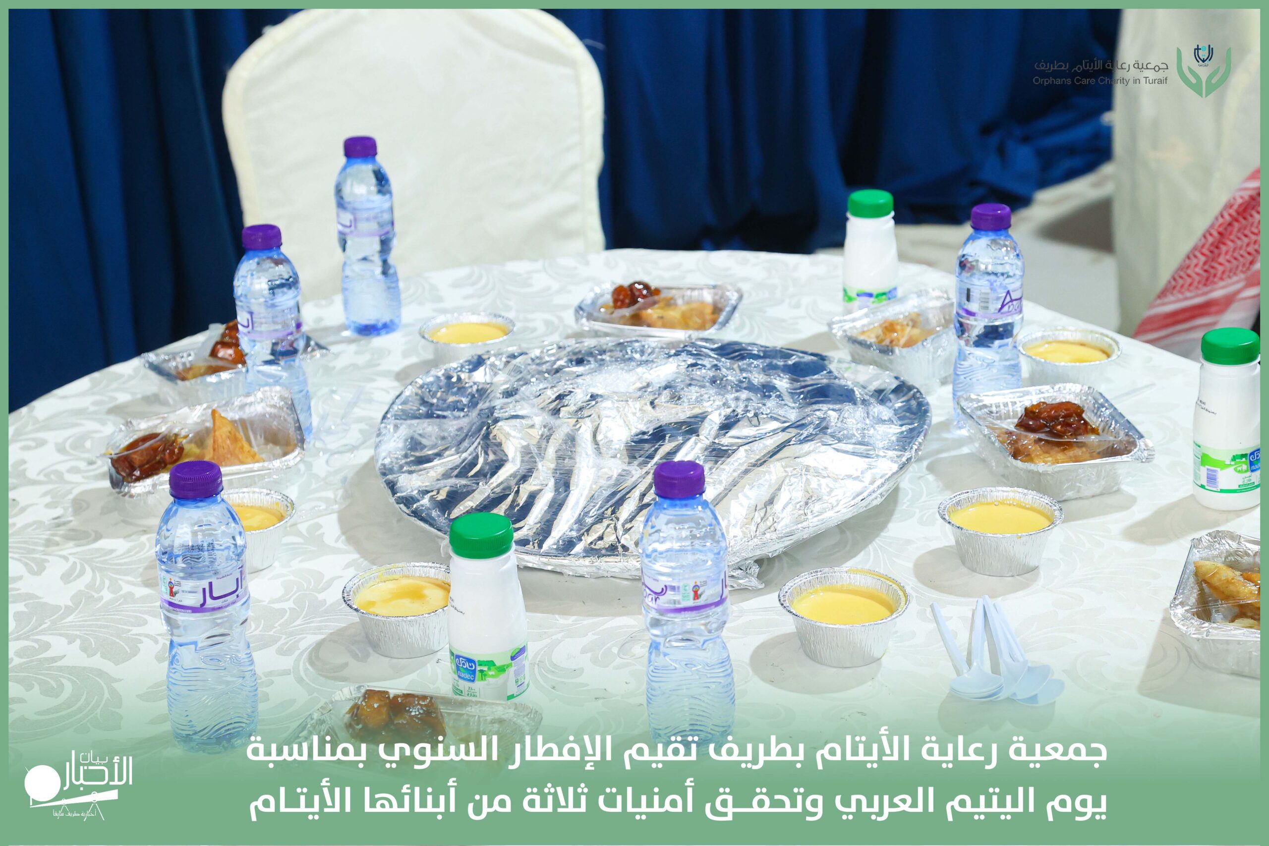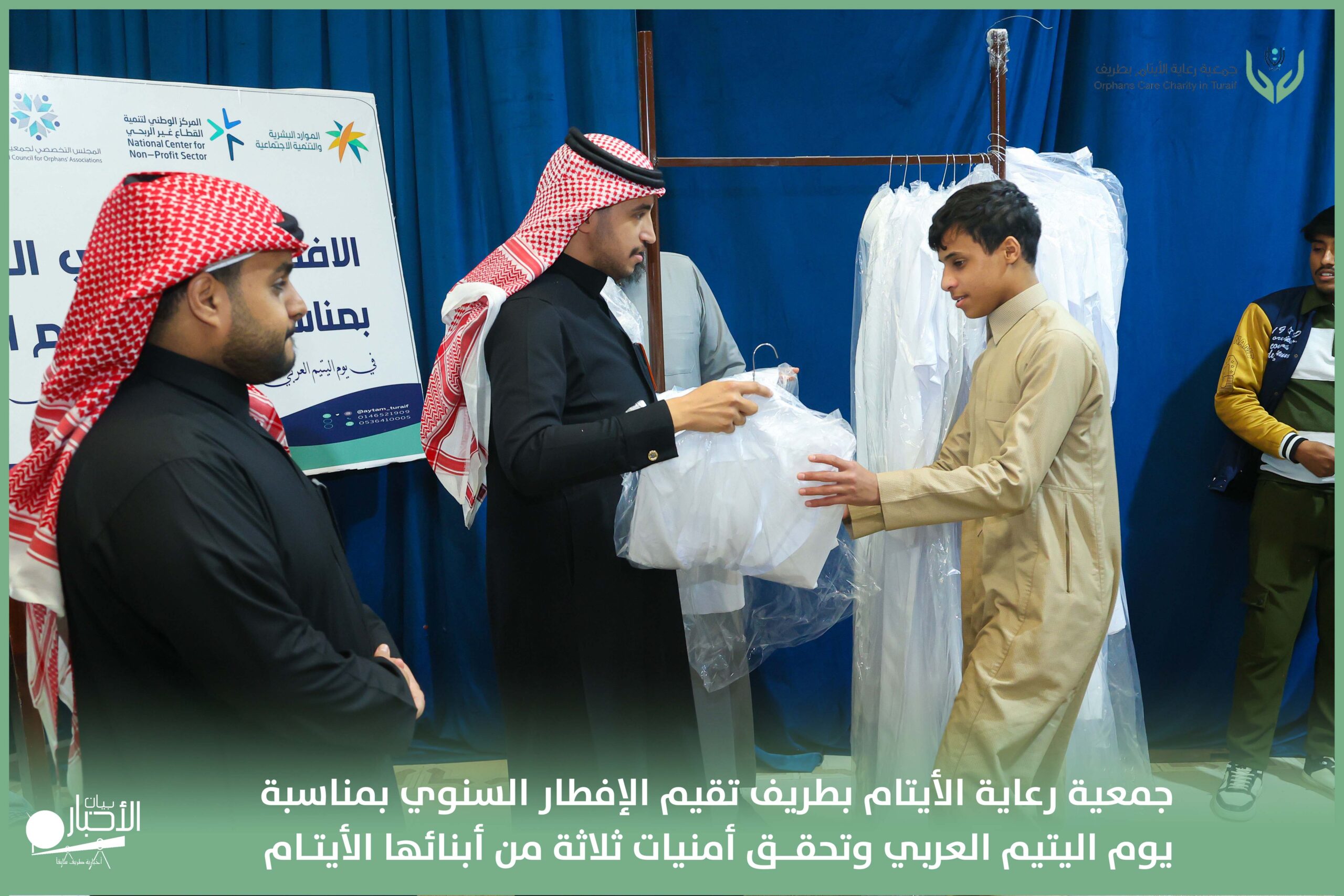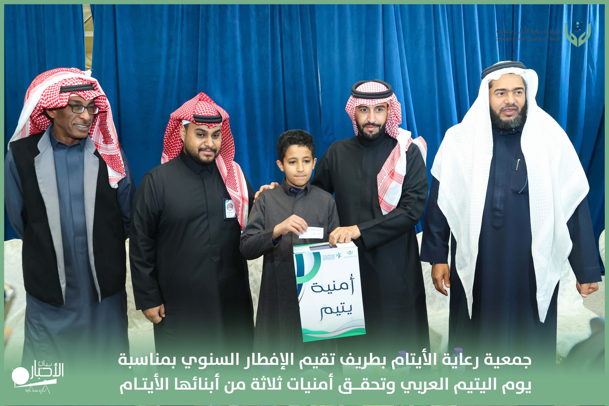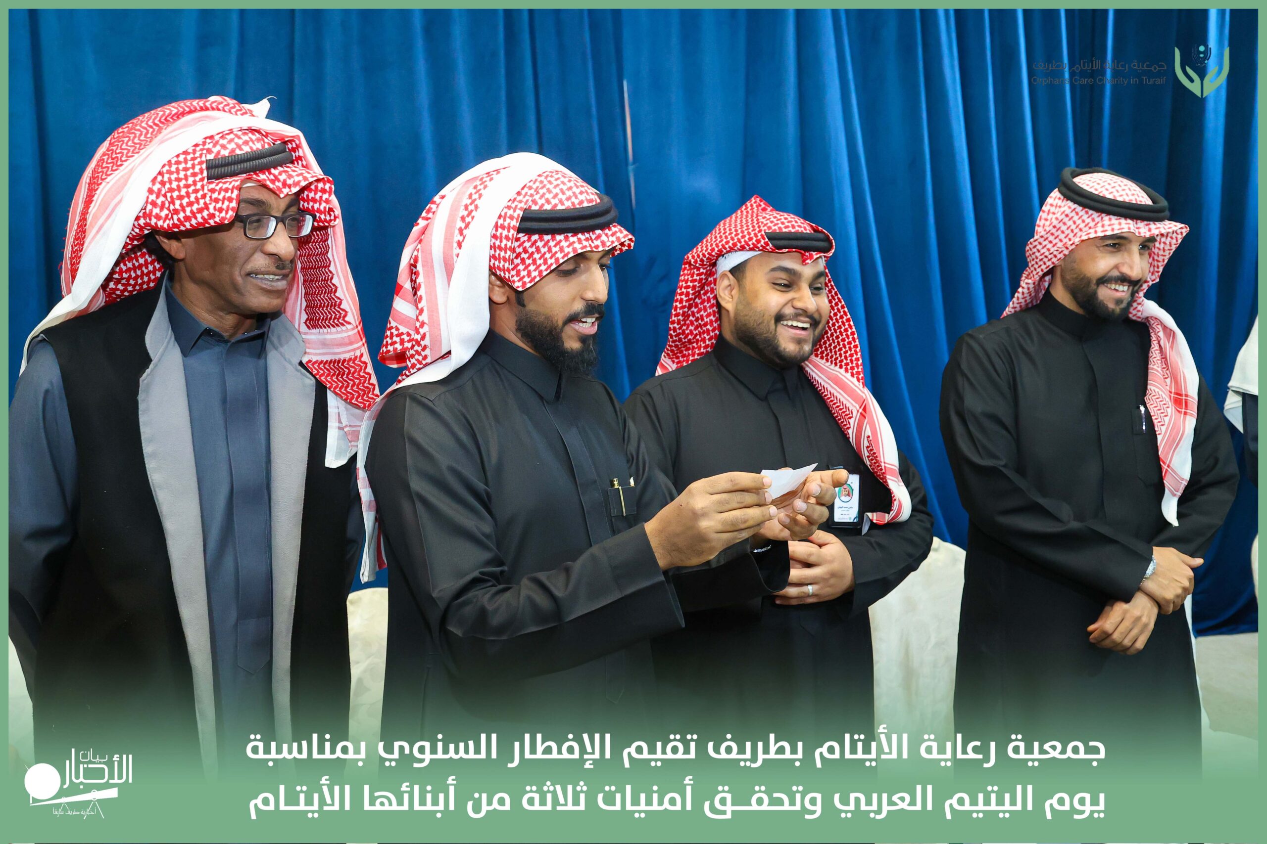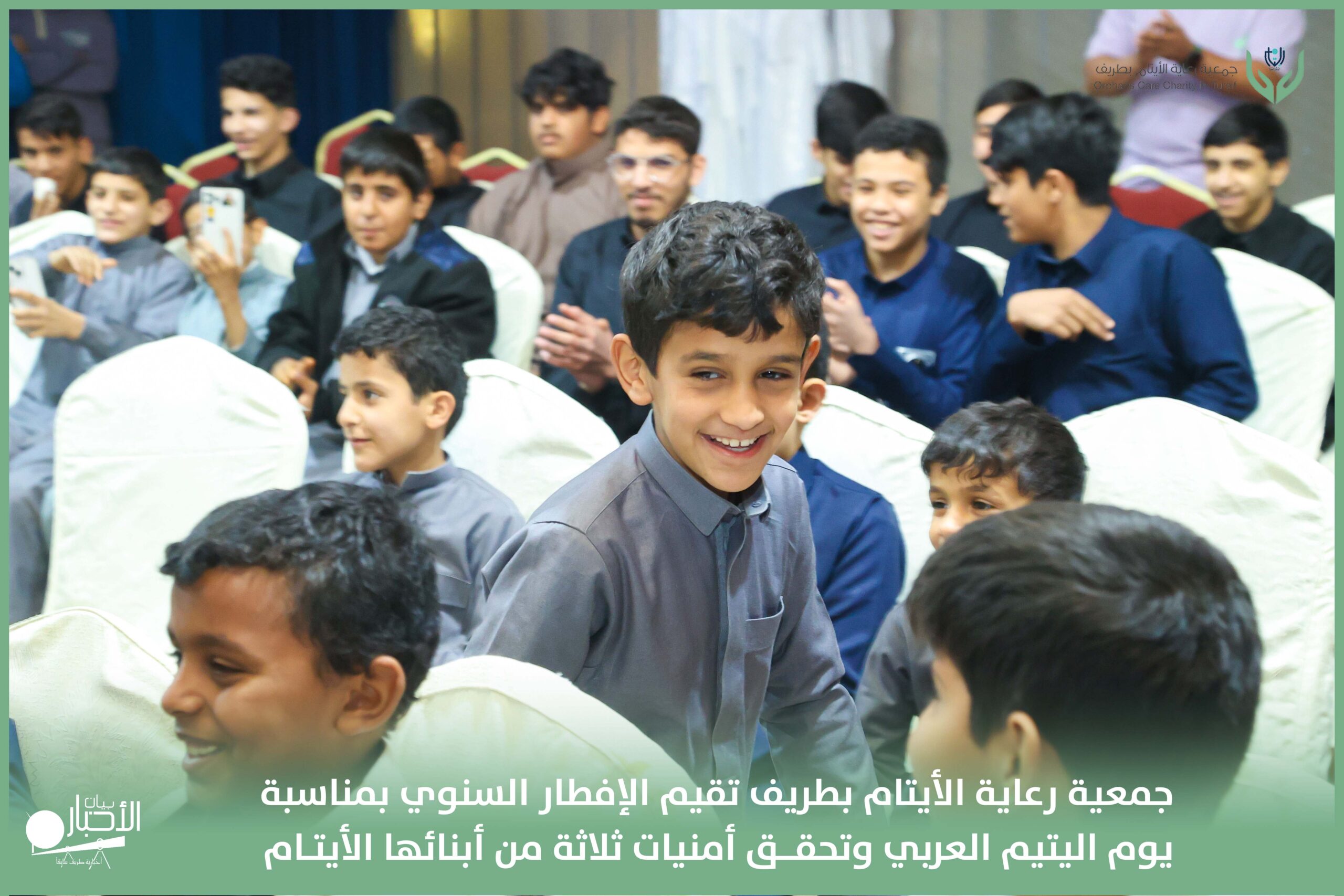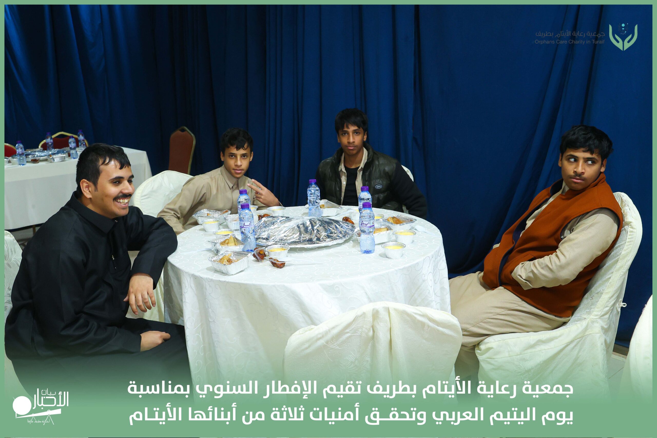 أقامت جمعية رعاية الأيتام بطريف مساء اليوم الجمعة 17 رمضان 1447هـ، حفل الإفطار السنوي بمناسبة يوم اليتيم العربي، وذلك بمقر مدرسة الوعد النموذجية الأهلية المتوسطة والثانوية، بحضور عدد من أعضاء مجلس الإدارة، والإدارة التنفيذية بالجمعية، وعدد من الضيوف والحضور الكرام من ابنائها الايتام