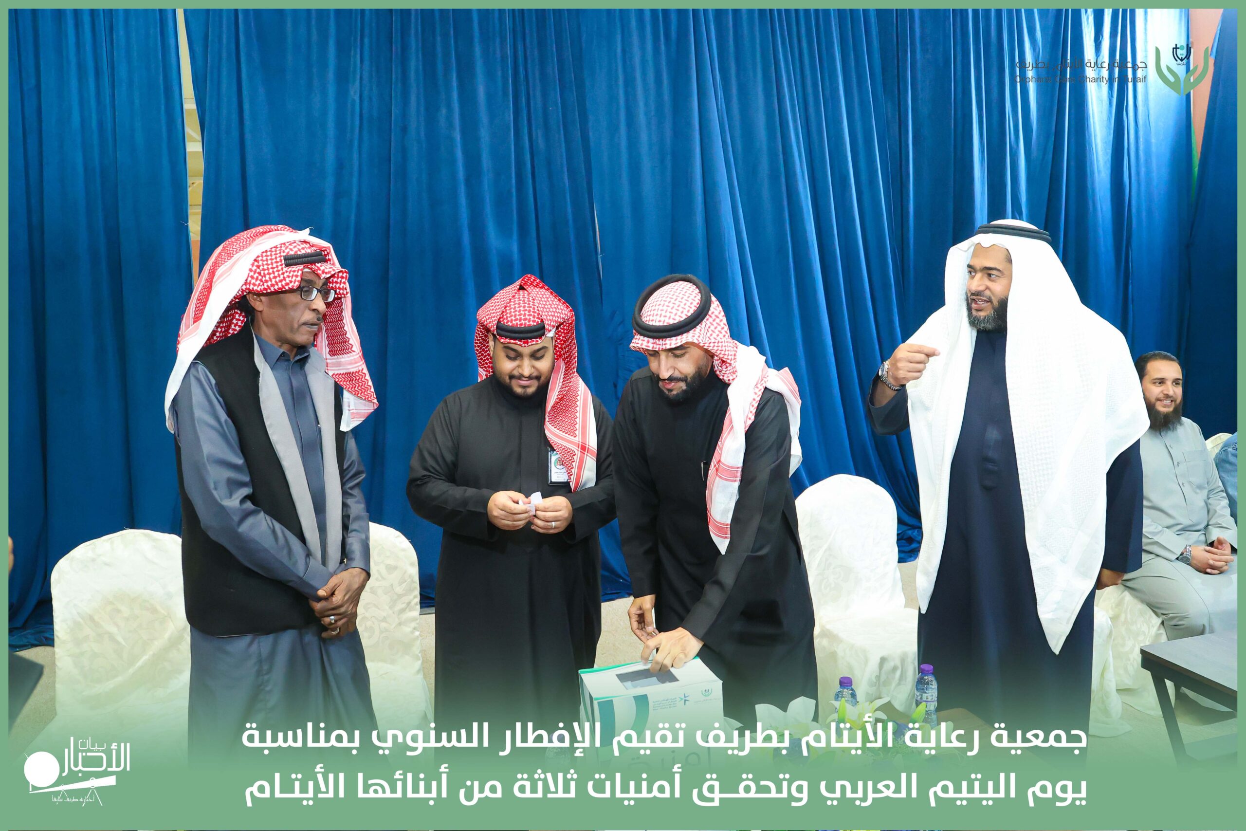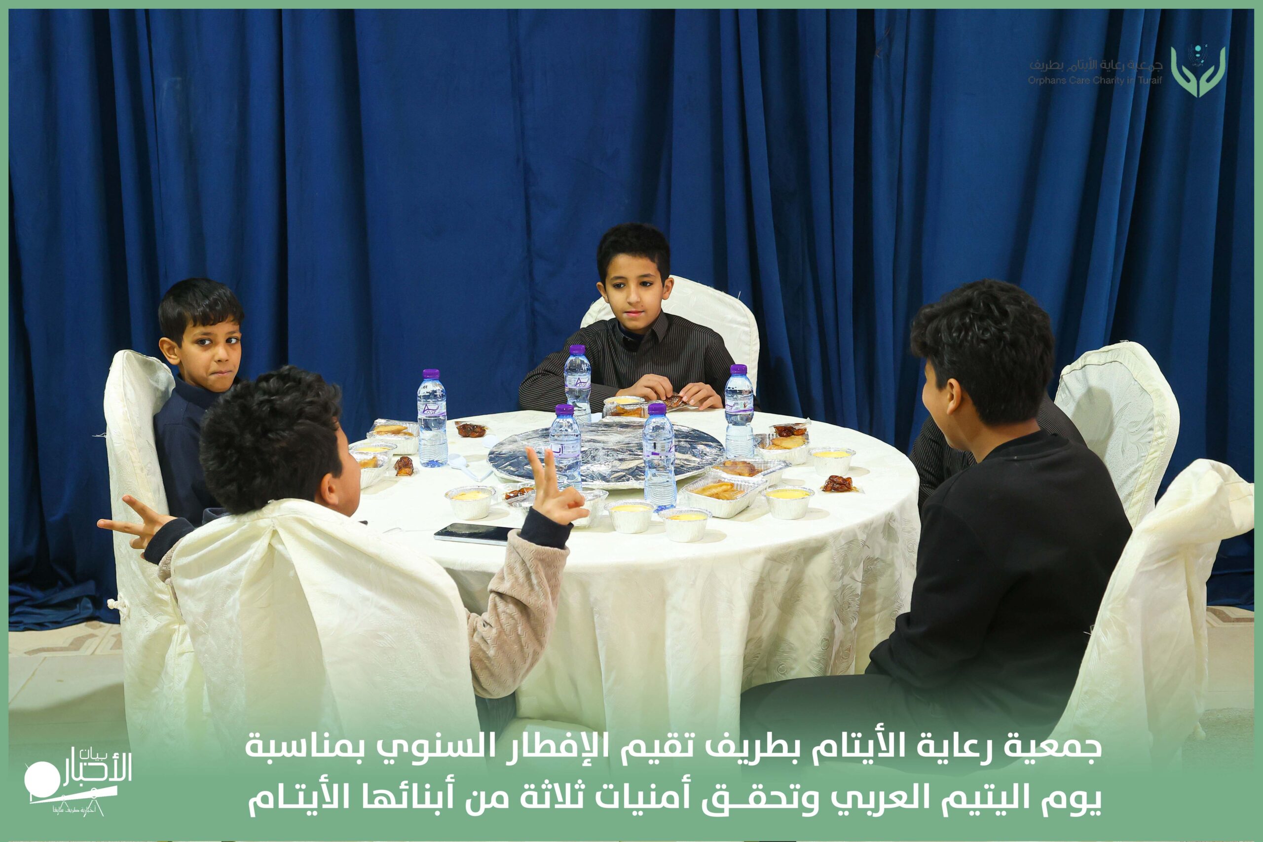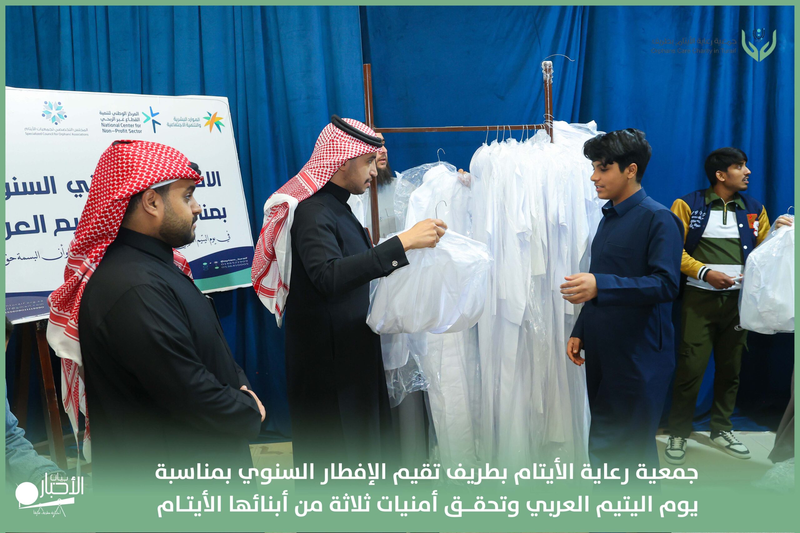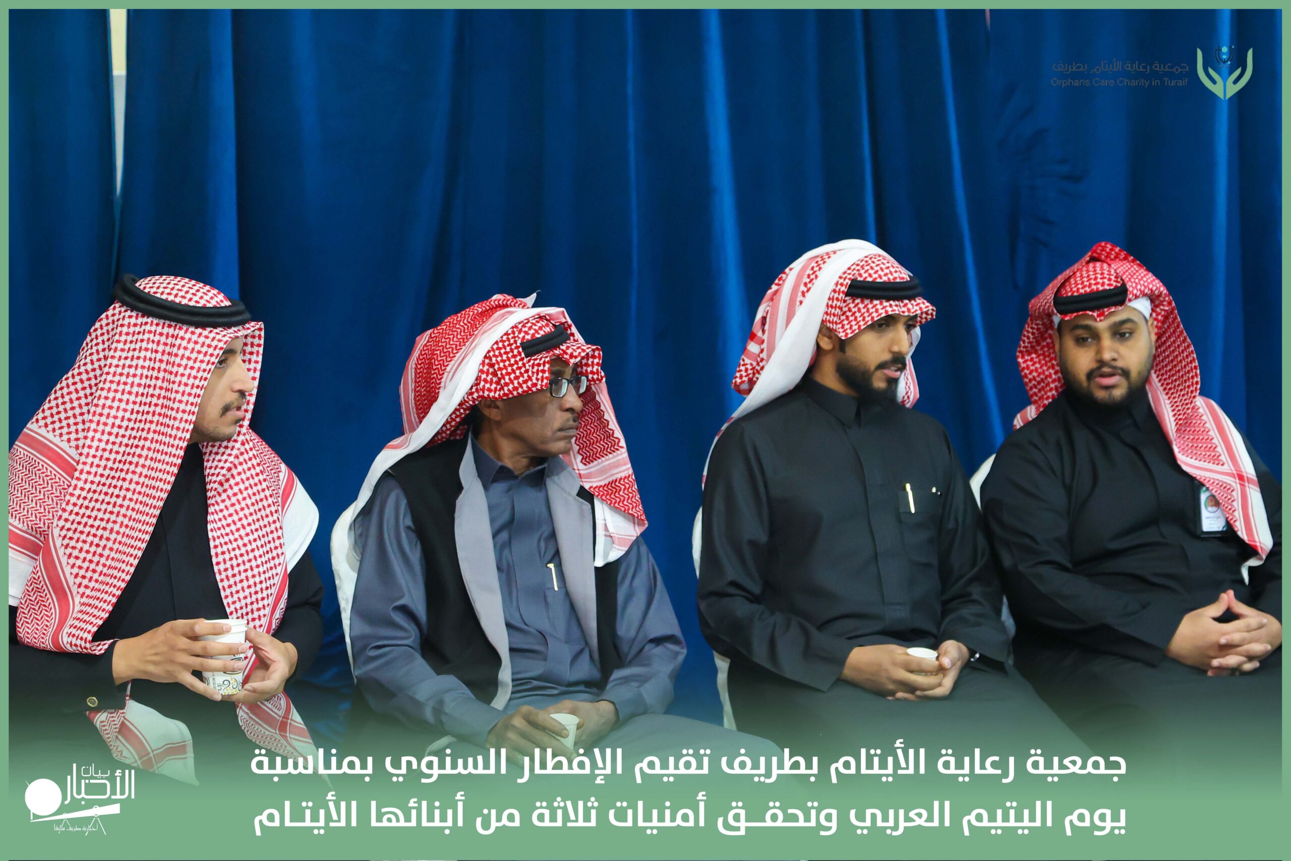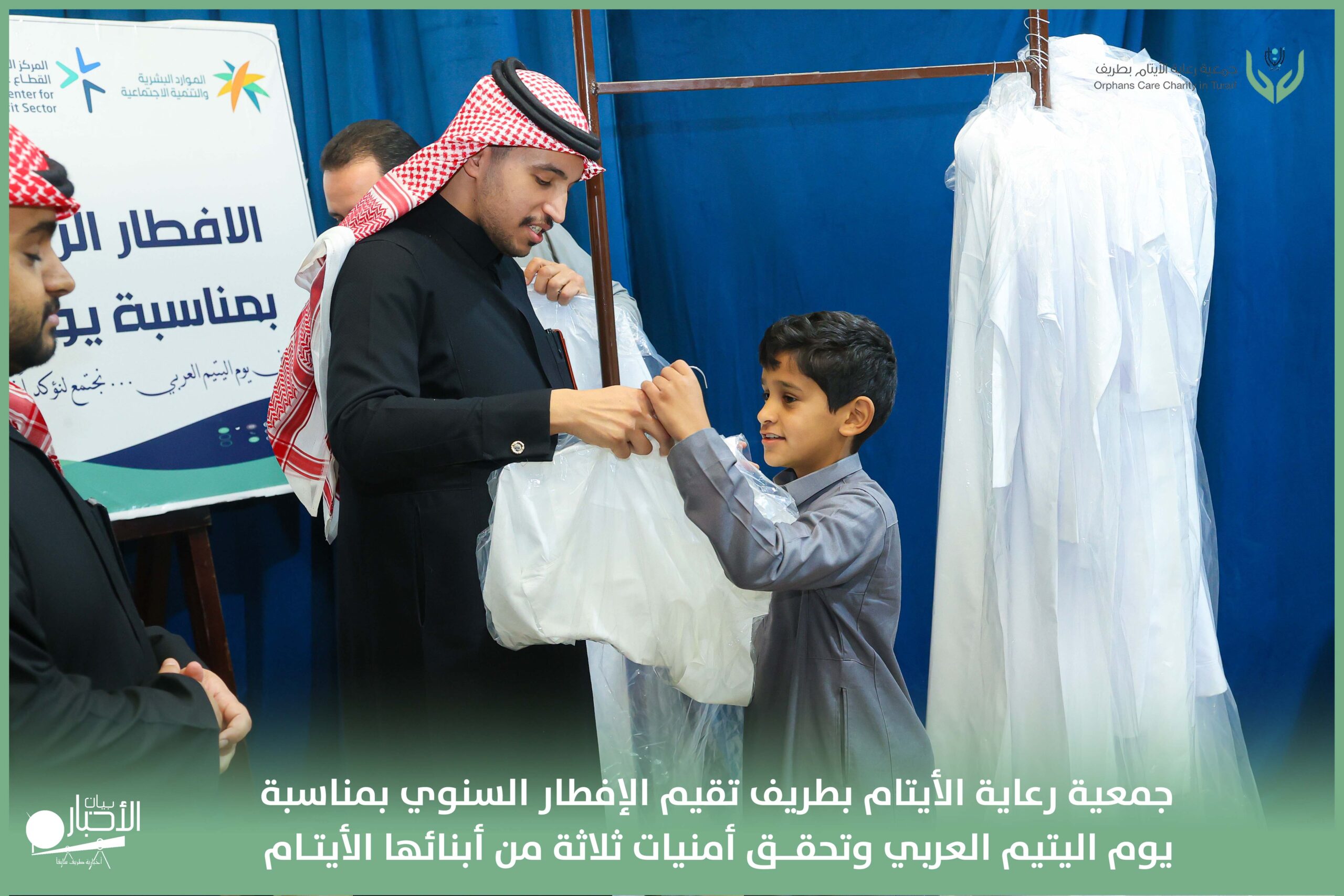أقامت جمعية رعاية الأيتام بطريف مساء اليوم الجمعة 17 رمضان 1447هـ، حفل الإفطار السنوي بمناسبة يوم اليتيم العربي، وذلك بمقر مدرسة الوعد النموذجية الأهلية المتوسطة والثانوية، بحضور عدد من أعضاء مجلس الإدارة، والإدارة التنفيذية بالجمعية، وعدد من الضيوف والحضور الكرام من ابنائها الايتام