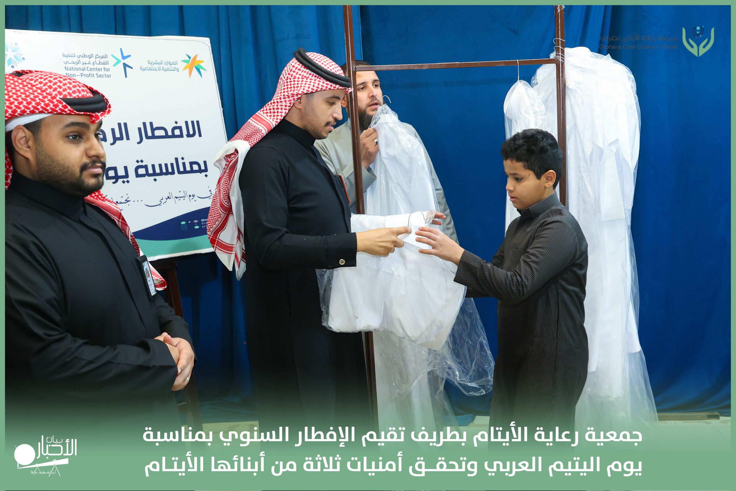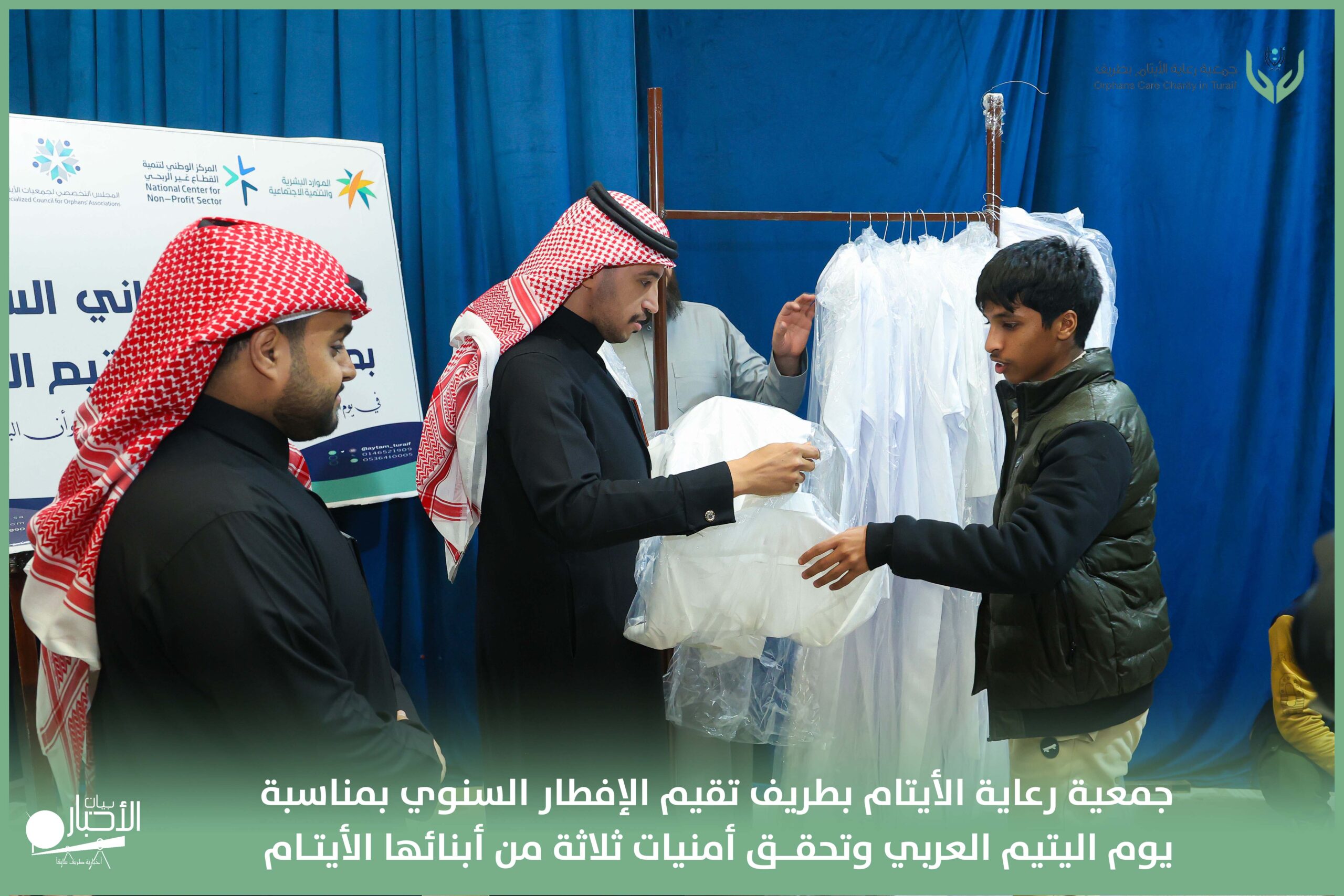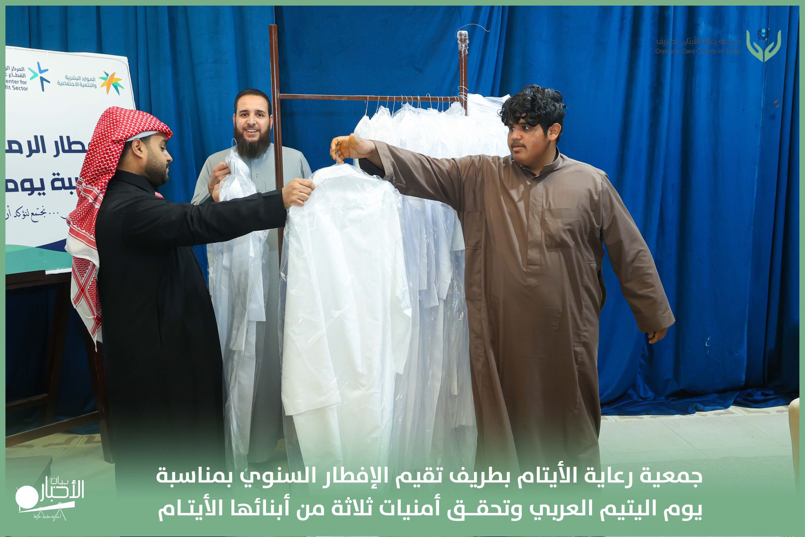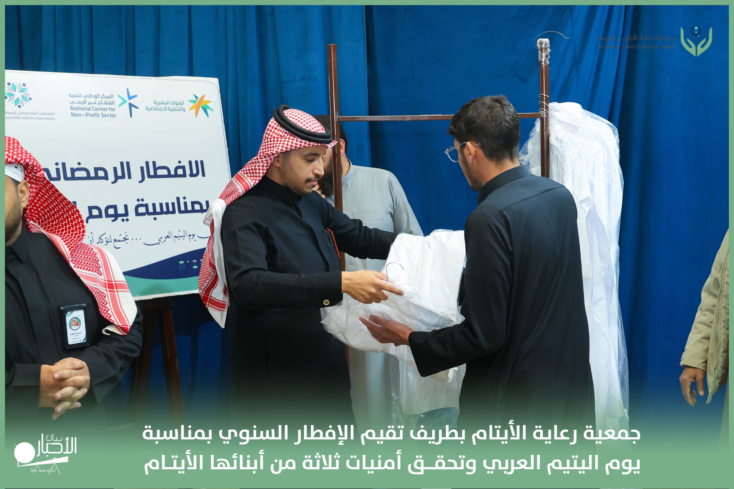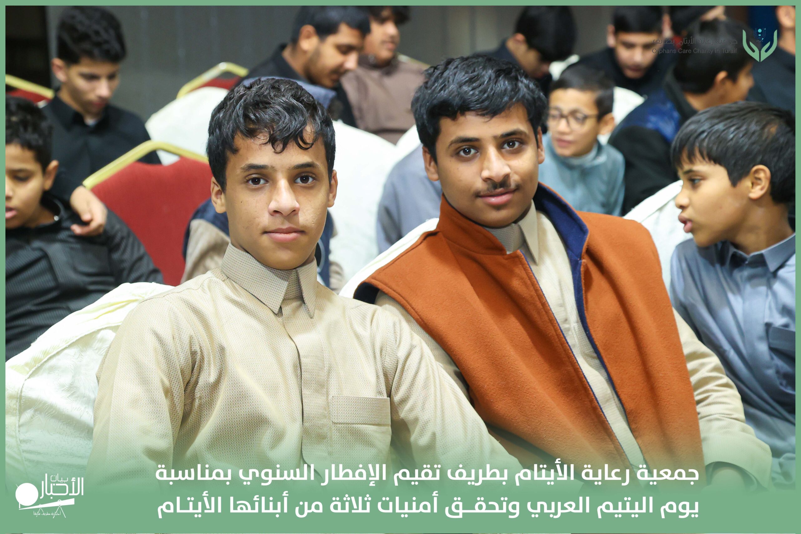 أقامت جمعية رعاية الأيتام بطريف مساء اليوم الجمعة 17 رمضان 1447هـ، حفل الإفطار السنوي بمناسبة يوم اليتيم العربي، وذلك بمقر مدرسة الوعد النموذجية الأهلية المتوسطة والثانوية، بحضور عدد من أعضاء مجلس الإدارة، والإدارة التنفيذية بالجمعية، وعدد من الضيوف والحضور الكرام من ابنائها الايتام